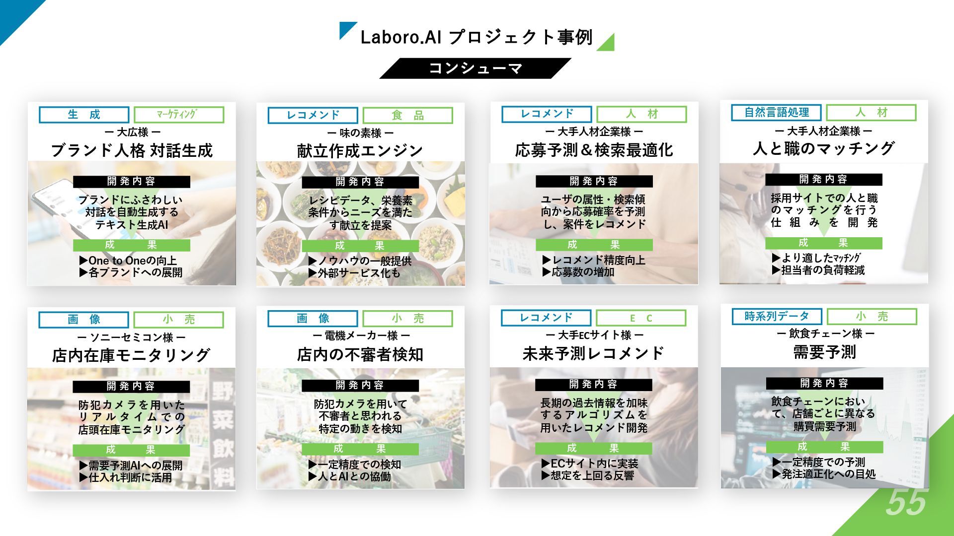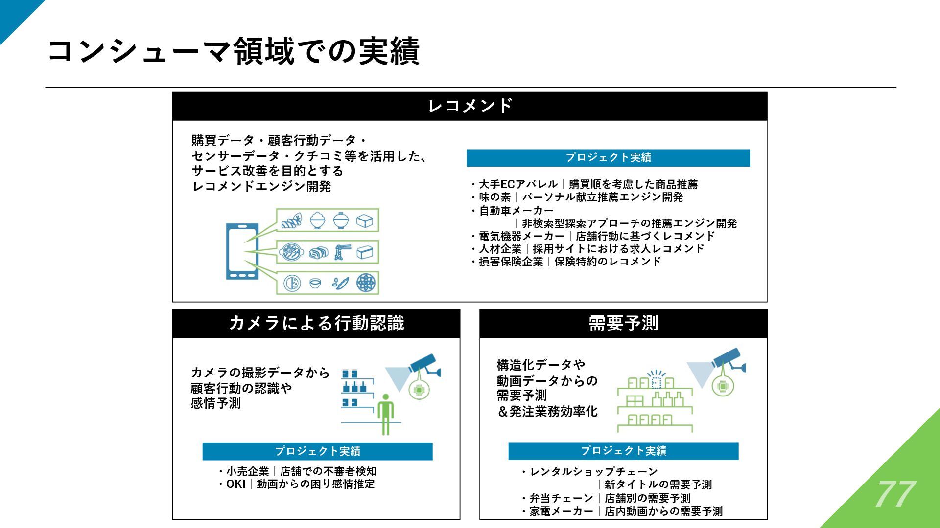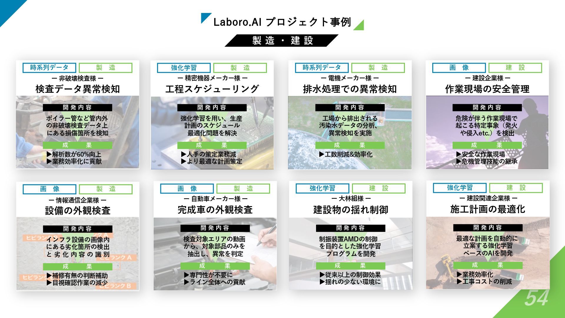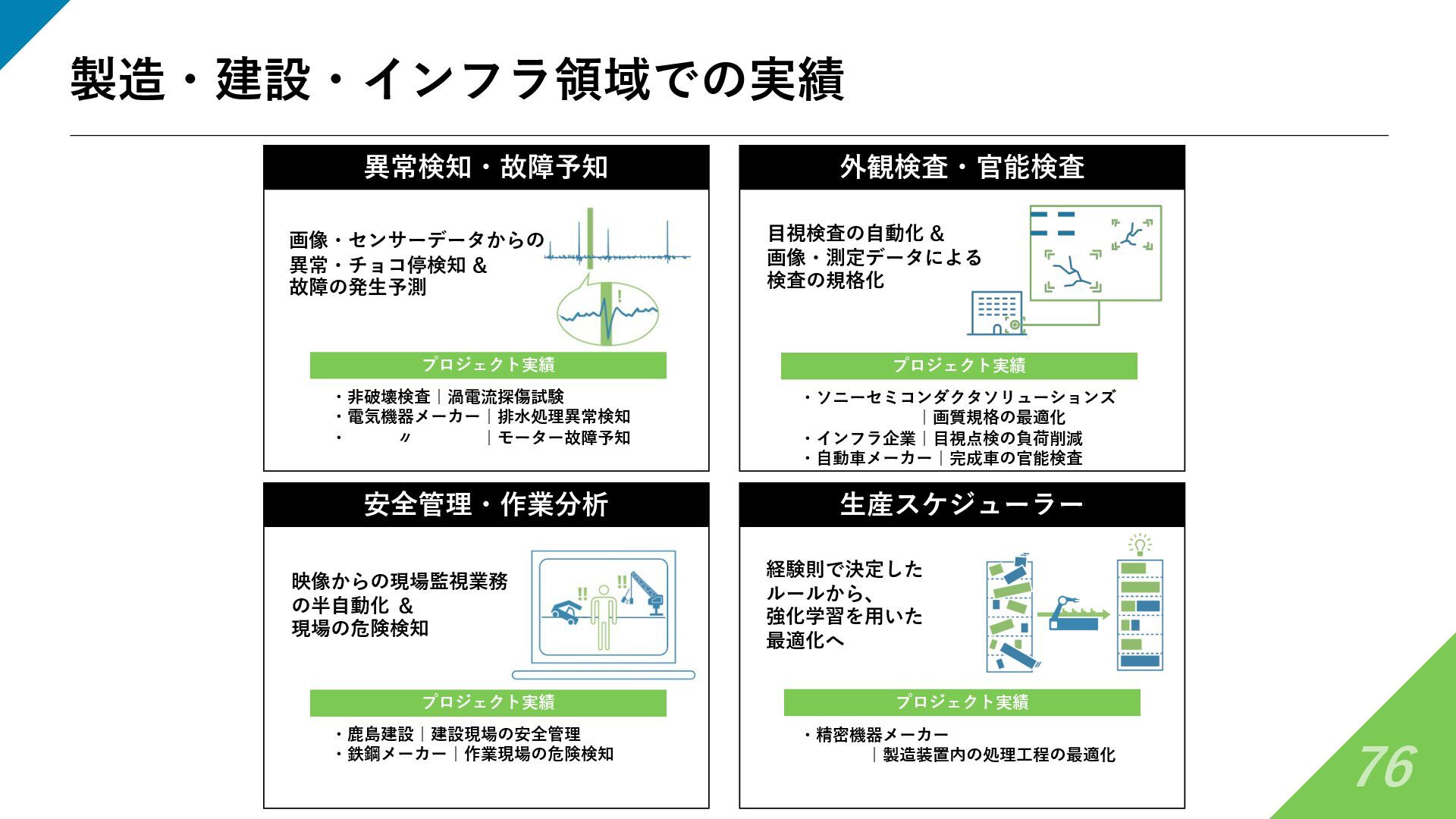 建設物の揺れ制御 (建設関連企業) 制振装置AMDの制御を ⽬的とした強化学習プ ログラムを開発 製 造 強化学習 ⼯程スケジューリング (精密機器メーカー) 強化学習アプローチに よる⽣産計画の最適化 問題の解決 建 設 強化学習 施⼯計画の最適化 (建設関連企業) ⼈⼿や従来⼿法では⾒ つけられなかった最適 な施⼯計画を⽴案 インフラ 画 像 線路設備の不良判定 (鉄道事業者) 線路設備の機能不全・ 異常を⾃動判定する開 発・実運⽤化 ⼈ 材 ⾃然⾔語 ⼈と職のマッチング (⼈材紹介企業) 採⽤サイトでの⼈と⾷ のマッチングを⾏う仕 組みを開発 ⼩ 売 画 像 店内在庫モニタリング (電機機器メーカー) 防犯カメラを⽤いたリ アルタイムでの店内在 庫モニタリング 製 造 レコメンド 献⽴作成エンジン (⾷品メーカー) 栄 養 素 の 条 件 と ユ ー ザーニーズを満たす献 ⽴を作成するエンジン マーケティング ⽣成AI 対話の⾃動⽣成 (広告企業) 企業・商品ブランド⼈ 格を反映した対話テキ ストの⽣成・顧客応対 マーケティング ⽣成AI バーチャル⽣活者⽣成 (広告企業) 7,000⼈分の調査データ から⽣活者を再現し、 市場調査を⾼度化 製 造 時系列 排⽔処理での異常検知 (電機機器メーカー) ⼯場から排⽔される汚 染⽔データの分析から 異常検知を実施