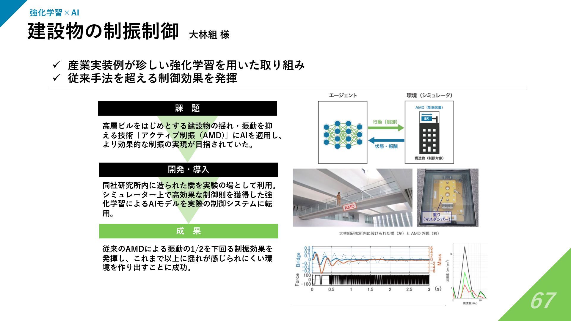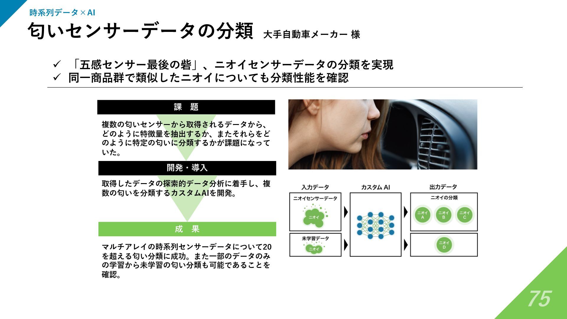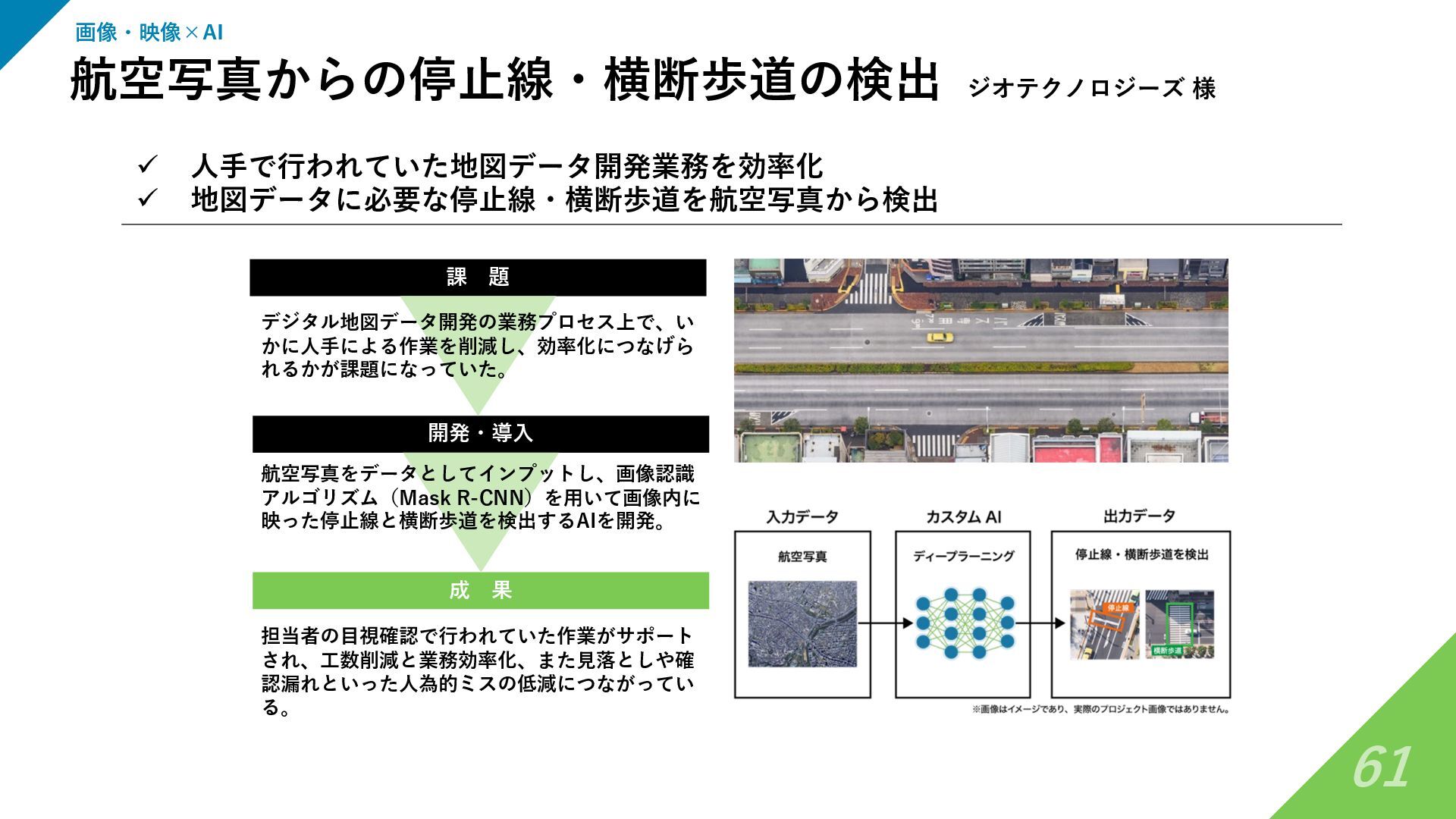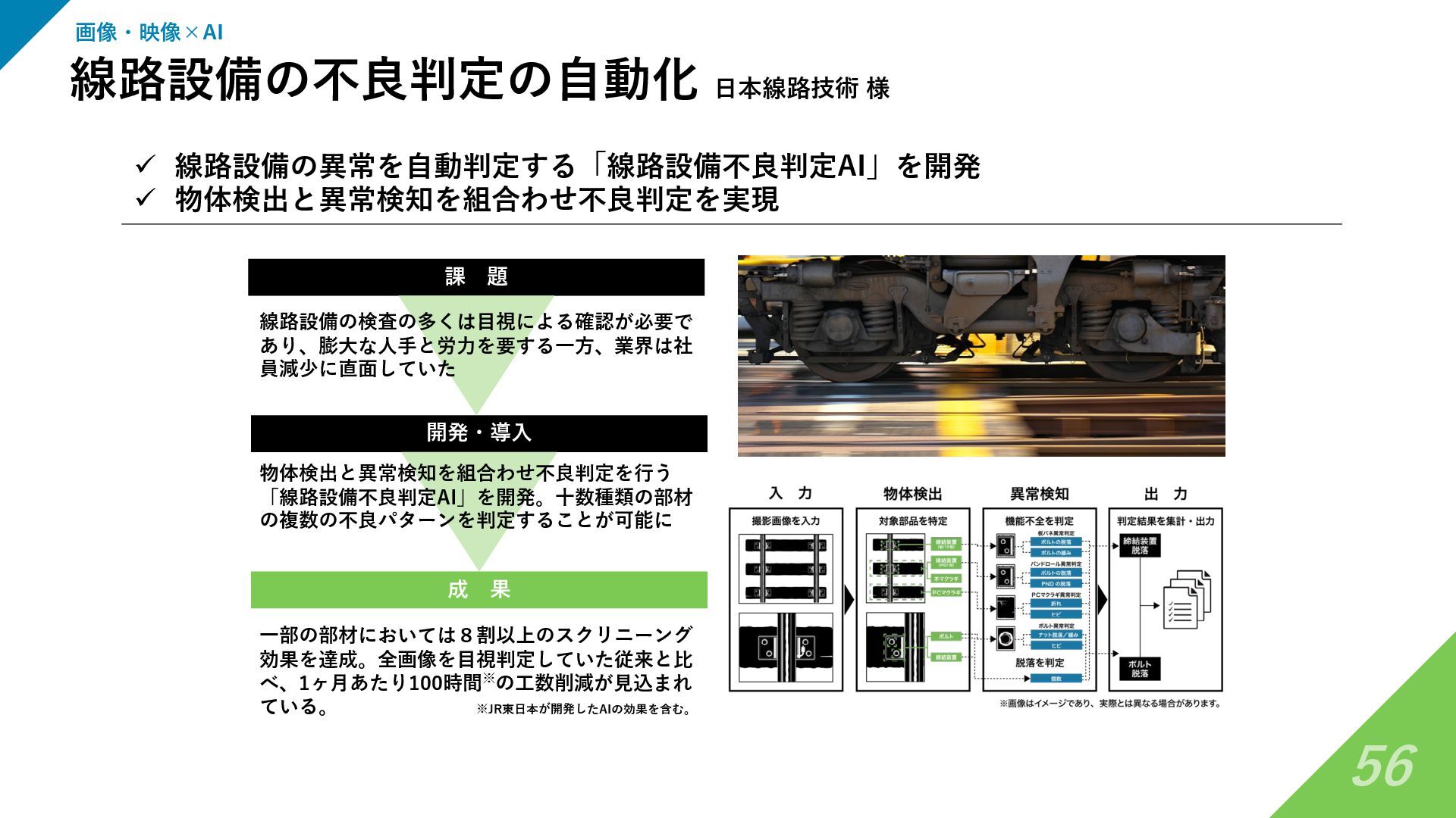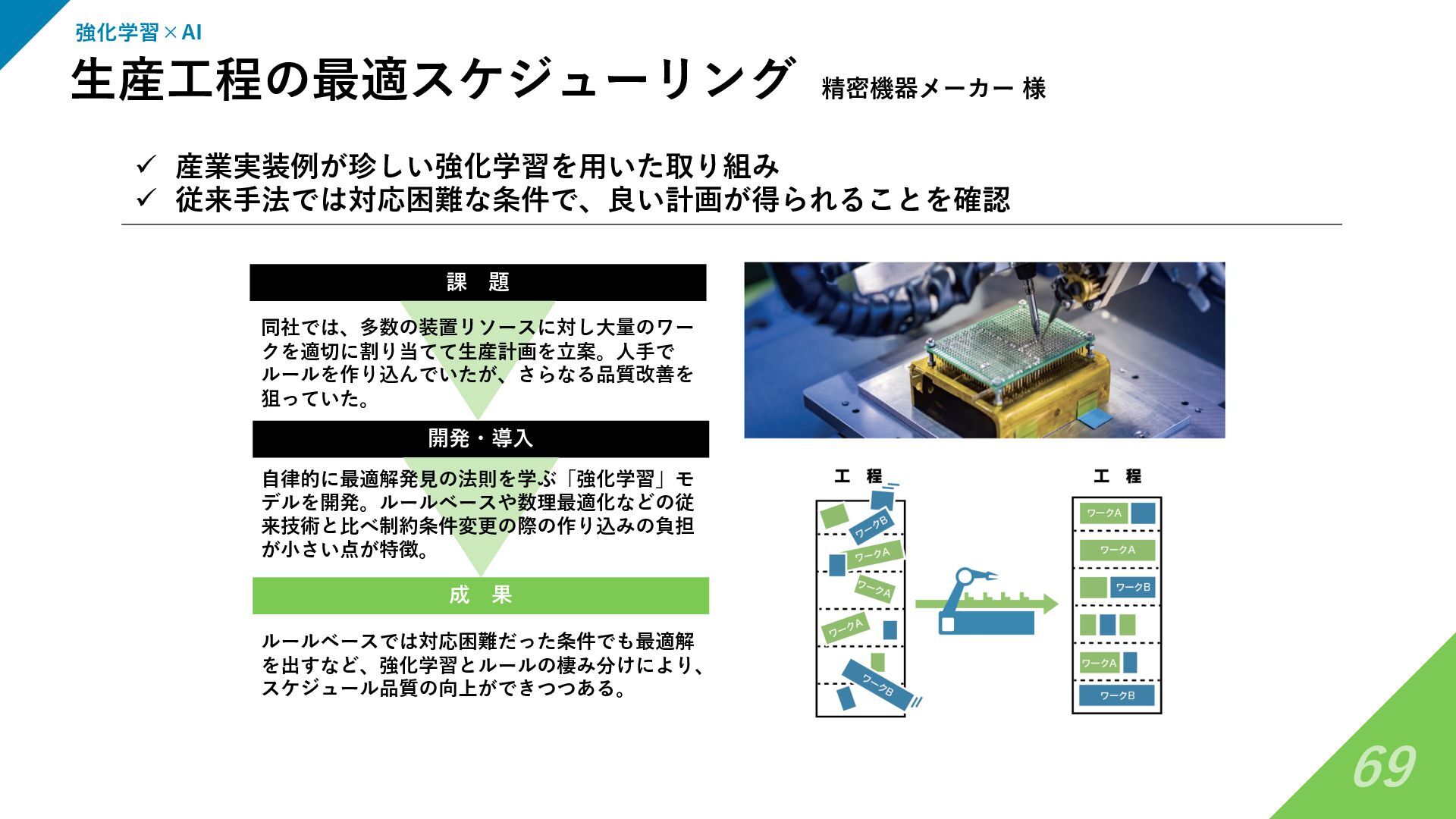 建設物の揺れ制御 (建設関連企業) 制振装置AMDの制御を ⽬的とした強化学習プ ログラムを開発 製 造 強化学習 ⼯程スケジューリング (精密機器メーカー) 強化学習アプローチに よる⽣産計画の最適化 問題の解決 建 設 強化学習 施⼯計画の最適化 (建設関連企業) ⼈⼿や従来⼿法では⾒ つけられなかった最適 な施⼯計画を⽴案 インフラ 画 像 線路設備の不良判定 (鉄道事業者) 線路設備の機能不全・ 異常を⾃動判定する開 発・実運⽤化 ⼈ 材 ⾃然⾔語 ⼈と職のマッチング (⼈材紹介企業) 採⽤サイトでの⼈と⾷ のマッチングを⾏う仕 組みを開発 ⼩ 売 画 像 店内在庫モニタリング (電機機器メーカー) 防犯カメラを⽤いたリ アルタイムでの店内在 庫モニタリング 製 造 レコメンド 献⽴作成エンジン (⾷品メーカー) 栄 養 素 の 条 件 と ユ ー ザーニーズを満たす献 ⽴を作成するエンジン マーケティング ⽣成AI 対話の⾃動⽣成 (広告企業) 企業・商品ブランド⼈ 格を反映した対話テキ ストの⽣成・顧客応対 マーケティング ⽣成AI バーチャル⽣活者⽣成 (広告企業) 7,000⼈分の調査データ から⽣活者を再現し、 市場調査を⾼度化 製 造 時系列 排⽔処理での異常検知 (電機機器メーカー) ⼯場から排⽔される汚 染⽔データの分析から 異常検知を実施