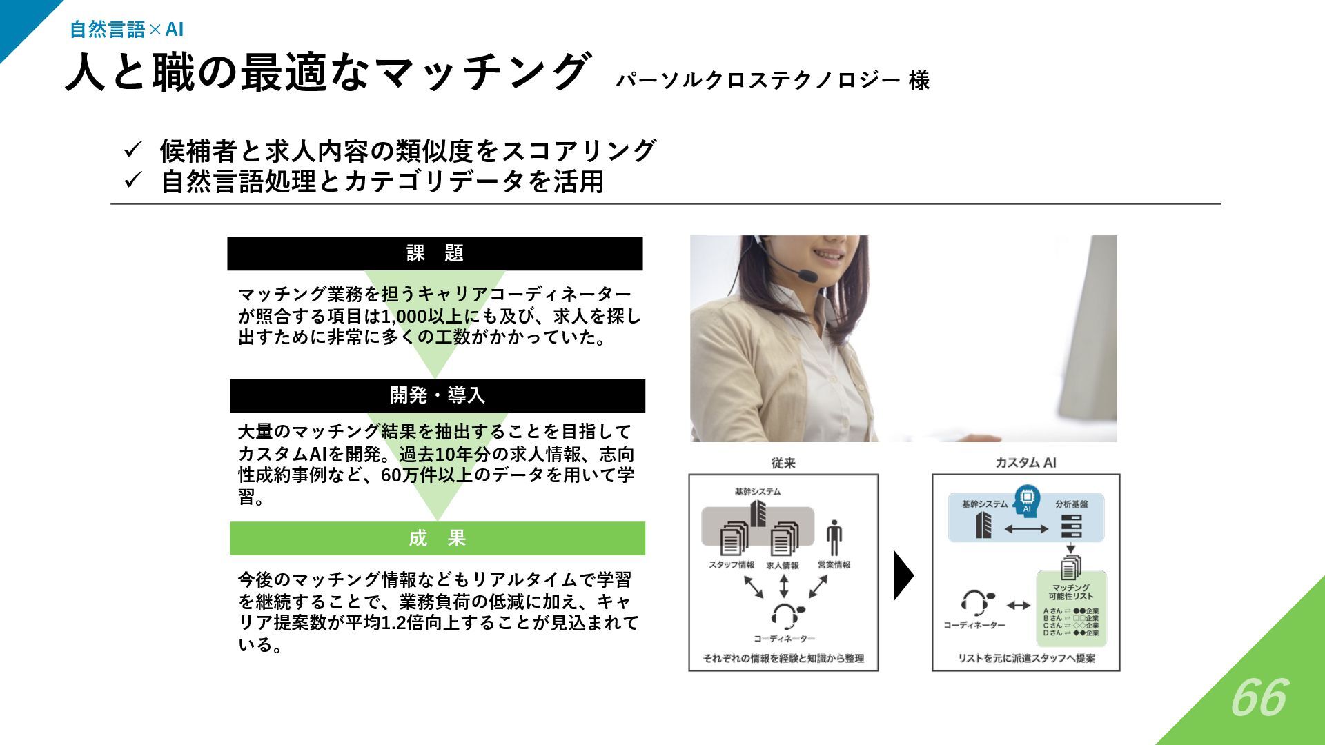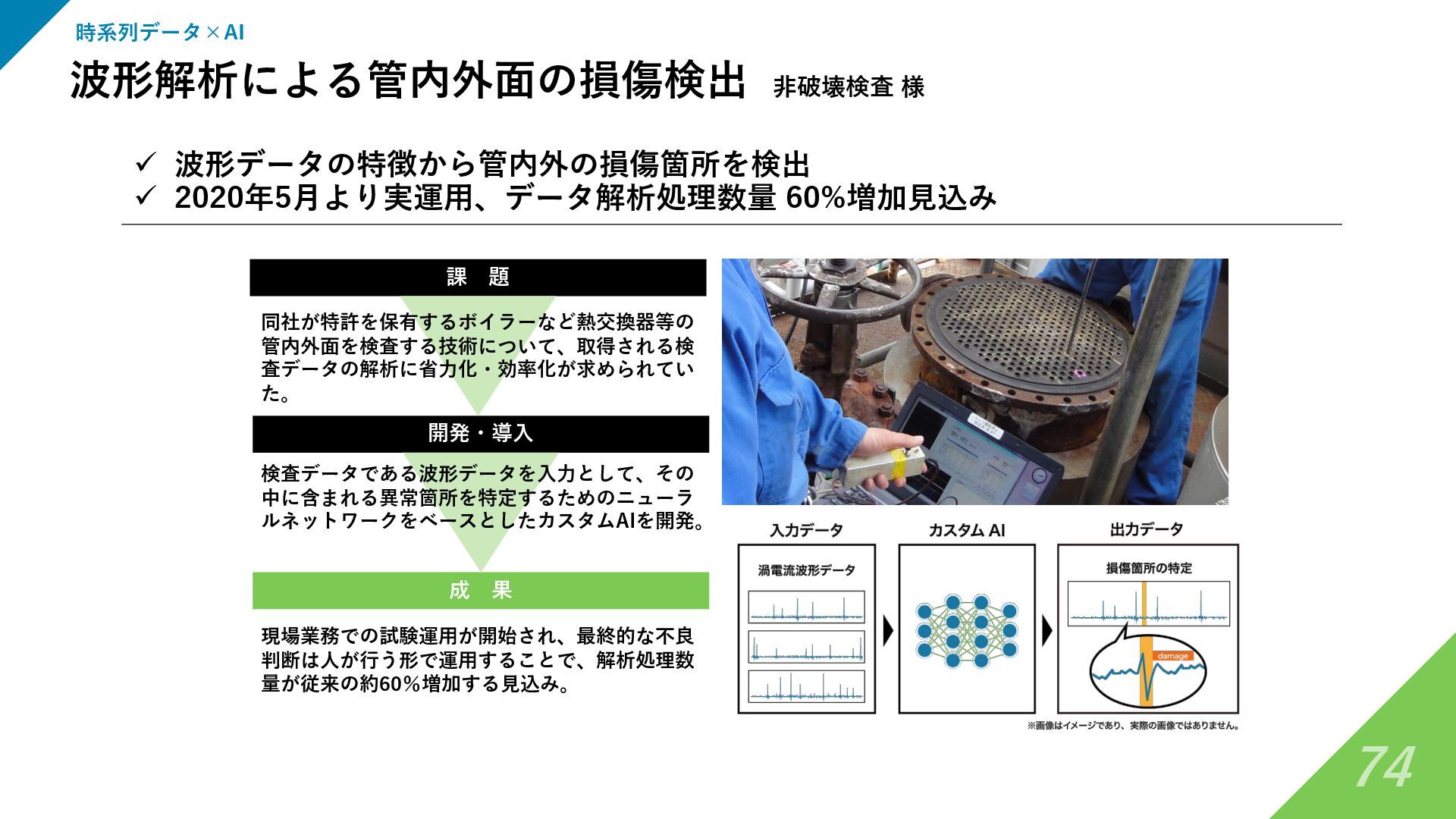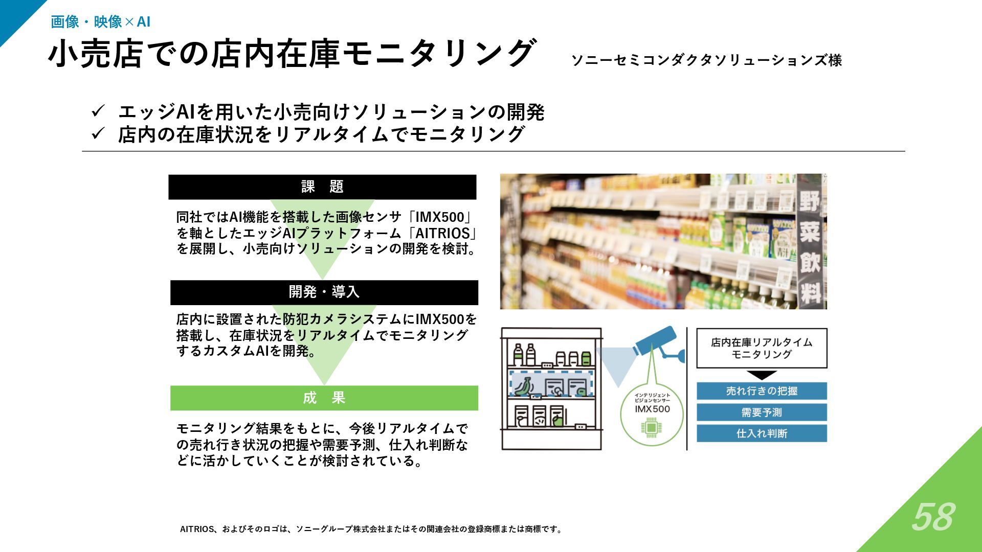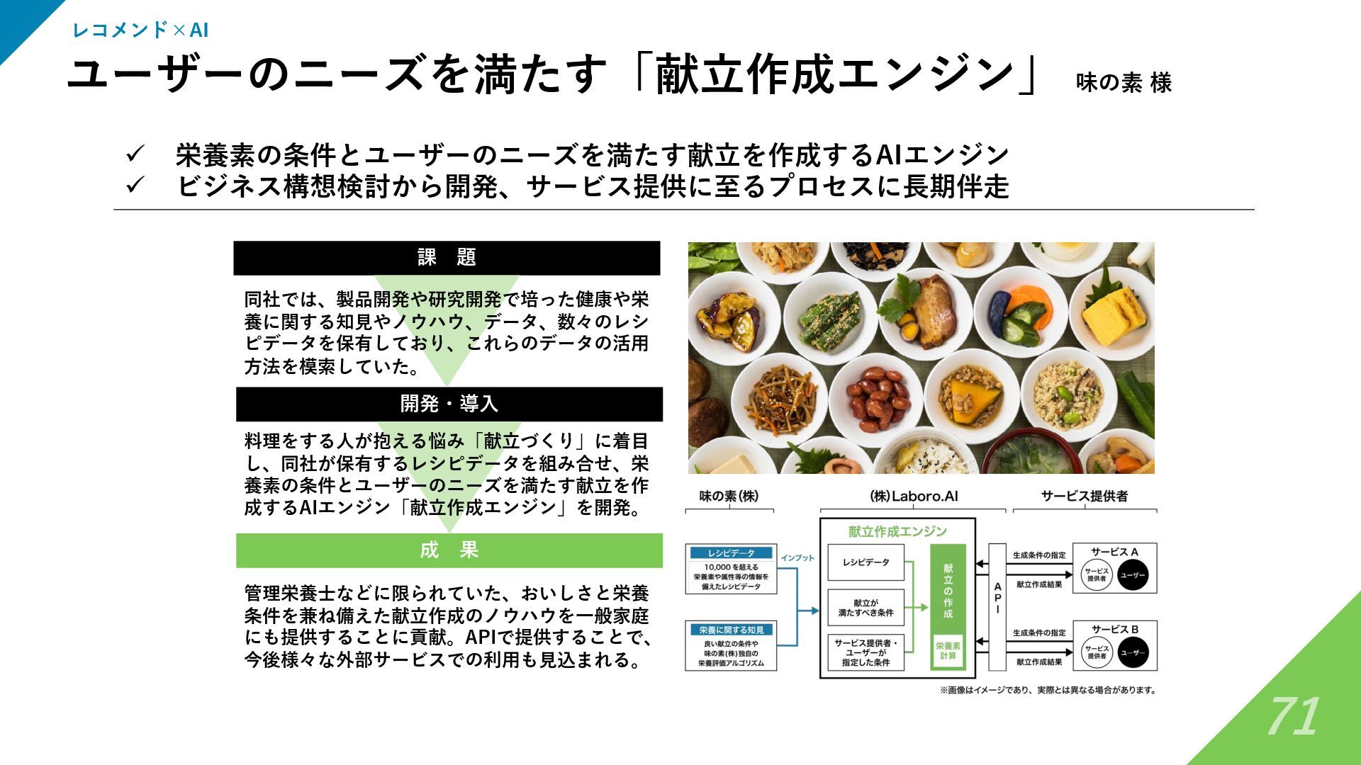 建設物の揺れ制御 (建設関連企業) 制振装置AMDの制御を ⽬的とした強化学習プ ログラムを開発 製 造 強化学習 ⼯程スケジューリング (精密機器メーカー) 強化学習アプローチに よる⽣産計画の最適化 問題の解決 建 設 強化学習 施⼯計画の最適化 (建設関連企業) ⼈⼿や従来⼿法では⾒ つけられなかった最適 な施⼯計画を⽴案 インフラ 画 像 線路設備の不良判定 (鉄道事業者) 線路設備の機能不全・ 異常を⾃動判定する開 発・実運⽤化 ⼈ 材 ⾃然⾔語 ⼈と職のマッチング (⼈材紹介企業) 採⽤サイトでの⼈と⾷ のマッチングを⾏う仕 組みを開発 ⼩ 売 画 像 店内在庫モニタリング (電機機器メーカー) 防犯カメラを⽤いたリ アルタイムでの店内在 庫モニタリング 製 造 レコメンド 献⽴作成エンジン (⾷品メーカー) 栄 養 素 の 条 件 と ユ ー ザーニーズを満たす献 ⽴を作成するエンジン マーケティング ⽣成AI 対話の⾃動⽣成 (広告企業) 企業・商品ブランド⼈ 格を反映した対話テキ ストの⽣成・顧客応対 マーケティング ⽣成AI バーチャル⽣活者⽣成 (広告企業) 7,000⼈分の調査データ から⽣活者を再現し、 市場調査を⾼度化 製 造 時系列 排⽔処理での異常検知 (電機機器メーカー) ⼯場から排⽔される汚 染⽔データの分析から 異常検知を実施