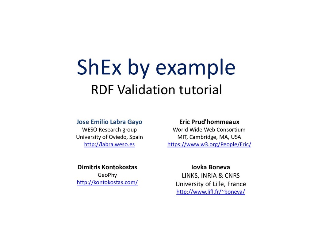 Web Consortium MIT, Cambridge, MA, USA https://www.w3.org/People/Eric/ Dimitris Kontokostas GeoPhy http://kontokostas.com/ Jose Emilio Labra Gayo WESO Research group University of Oviedo, Spain http://labra.weso.es Iovka Boneva LINKS, INRIA & CNRS University of Lille, France http://www.lifl.fr/~boneva/