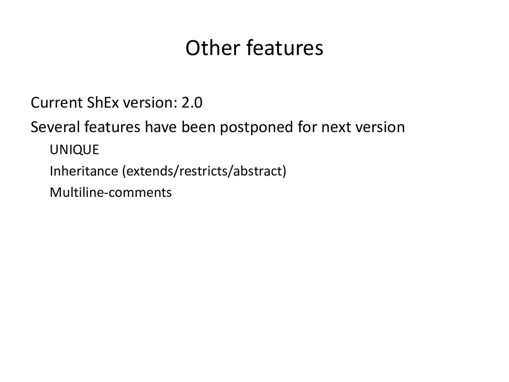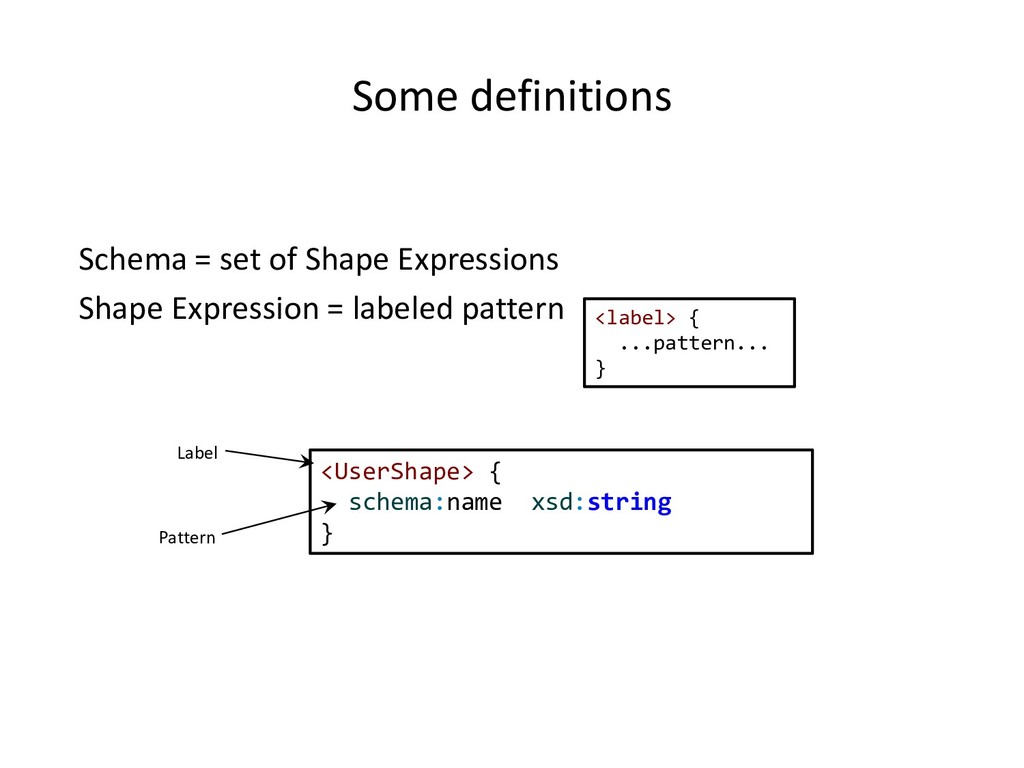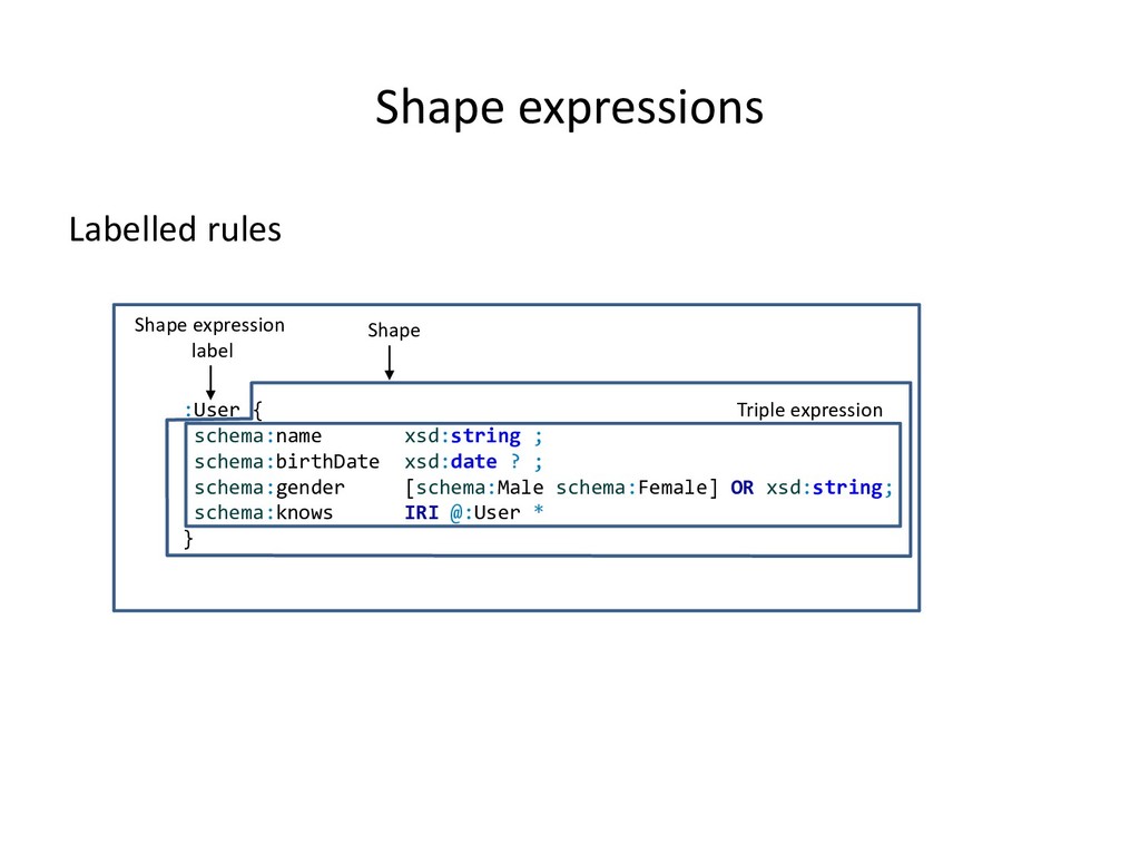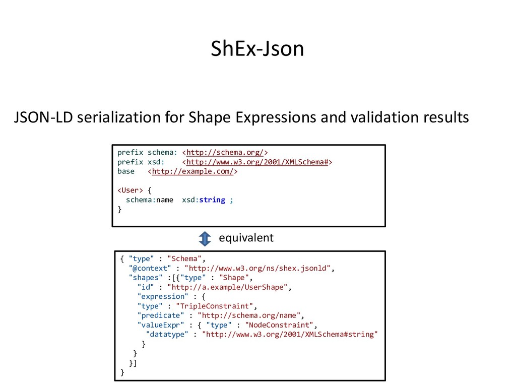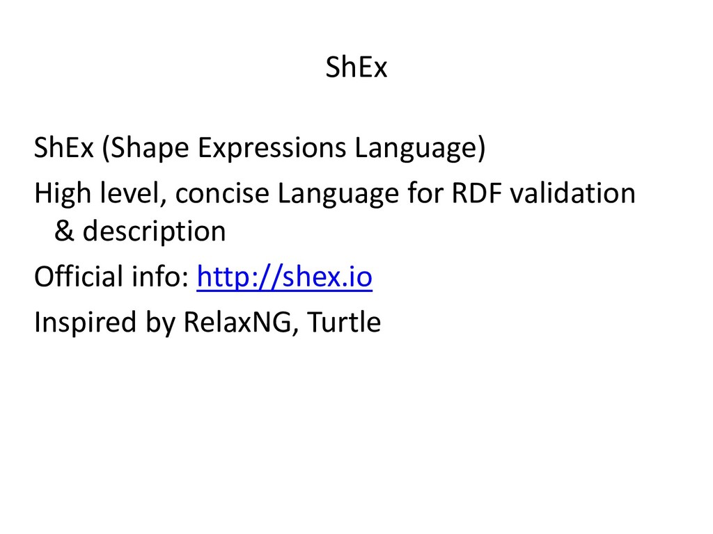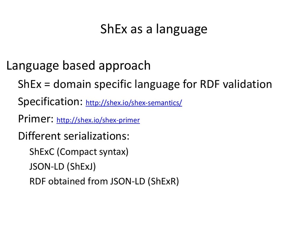 specific language for RDF validation Specification: http://shex.io/shex-semantics/ Primer: http://shex.io/shex-primer Different serializations: ShExC (Compact syntax) JSON-LD (ShExJ) RDF obtained from JSON-LD (ShExR)