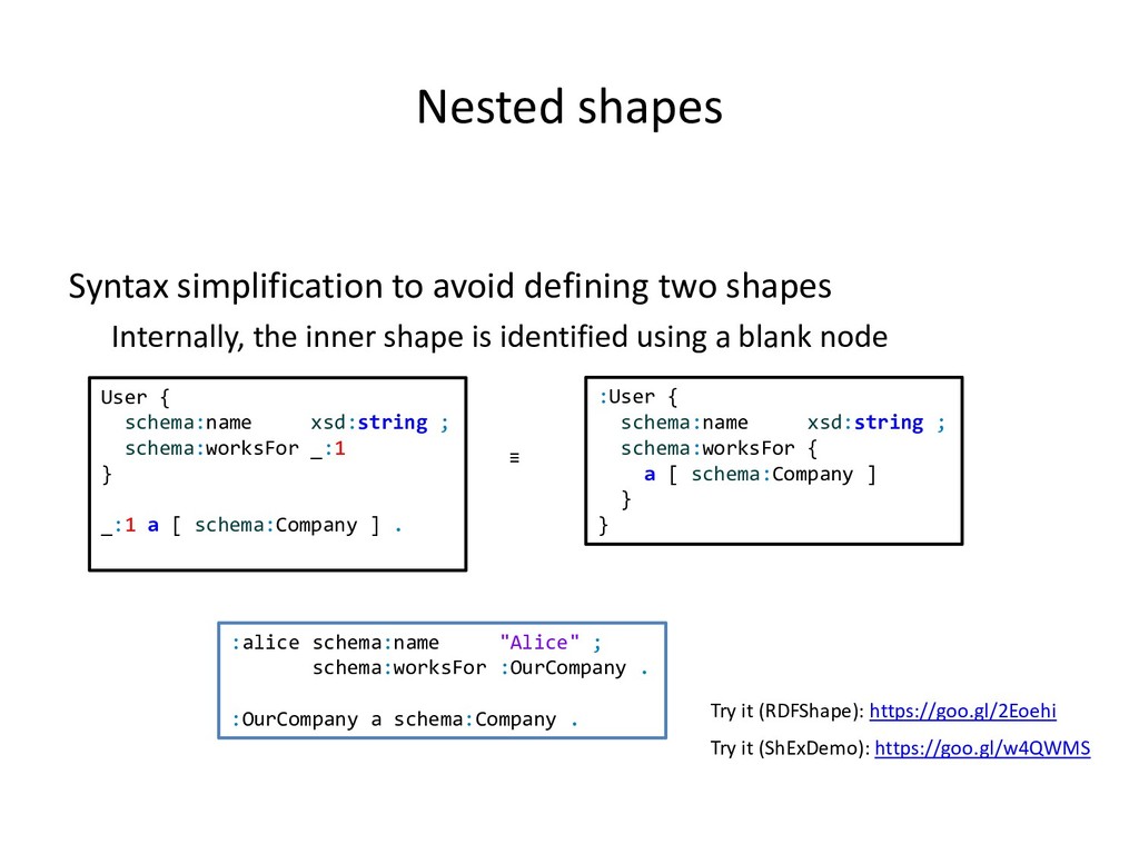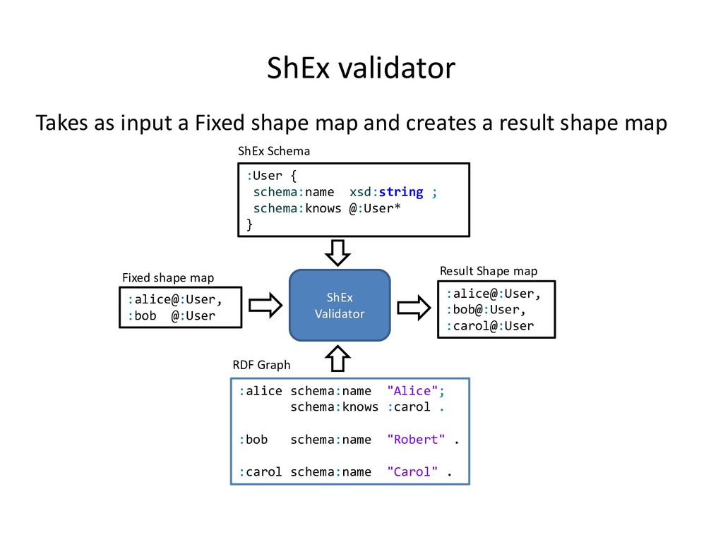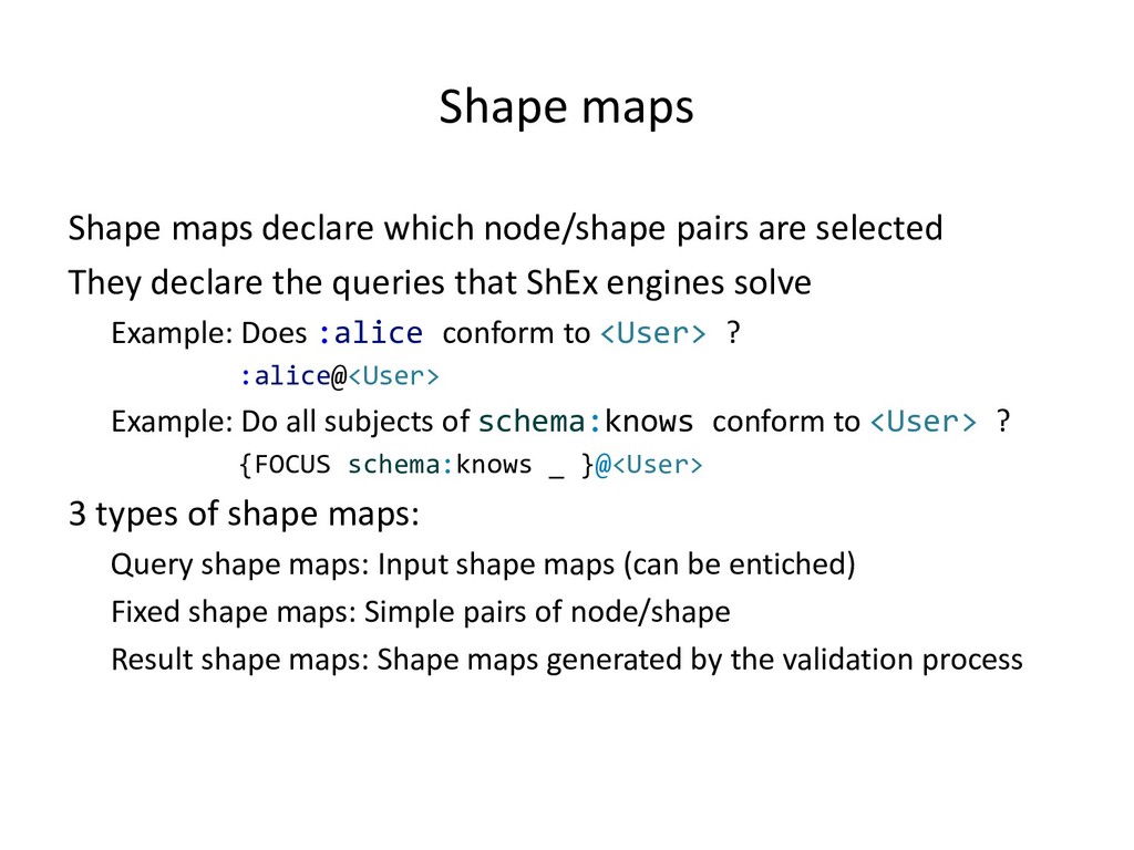 They declare the queries that ShEx engines solve Example: Does :alice conform to <User> ? :alice@<User> Example: Do all subjects of schema:knows conform to <User> ? {FOCUS schema:knows _ }@<User> 3 types of shape maps: Query shape maps: Input shape maps (can be entiched) Fixed shape maps: Simple pairs of node/shape Result shape maps: Shape maps generated by the validation process