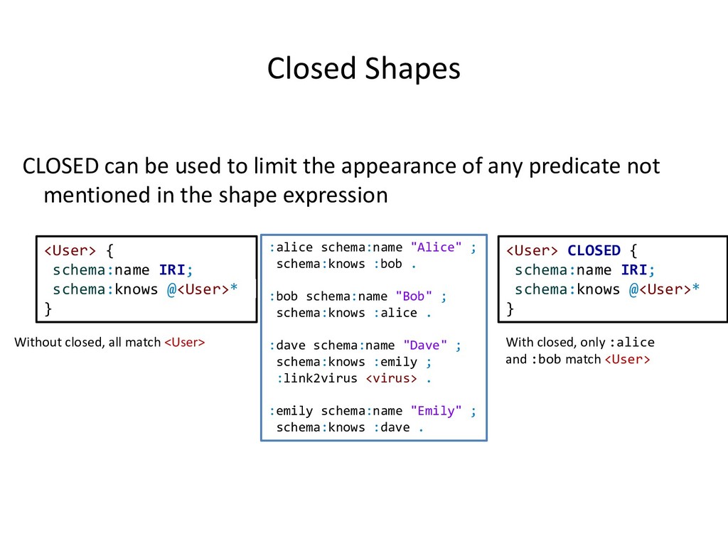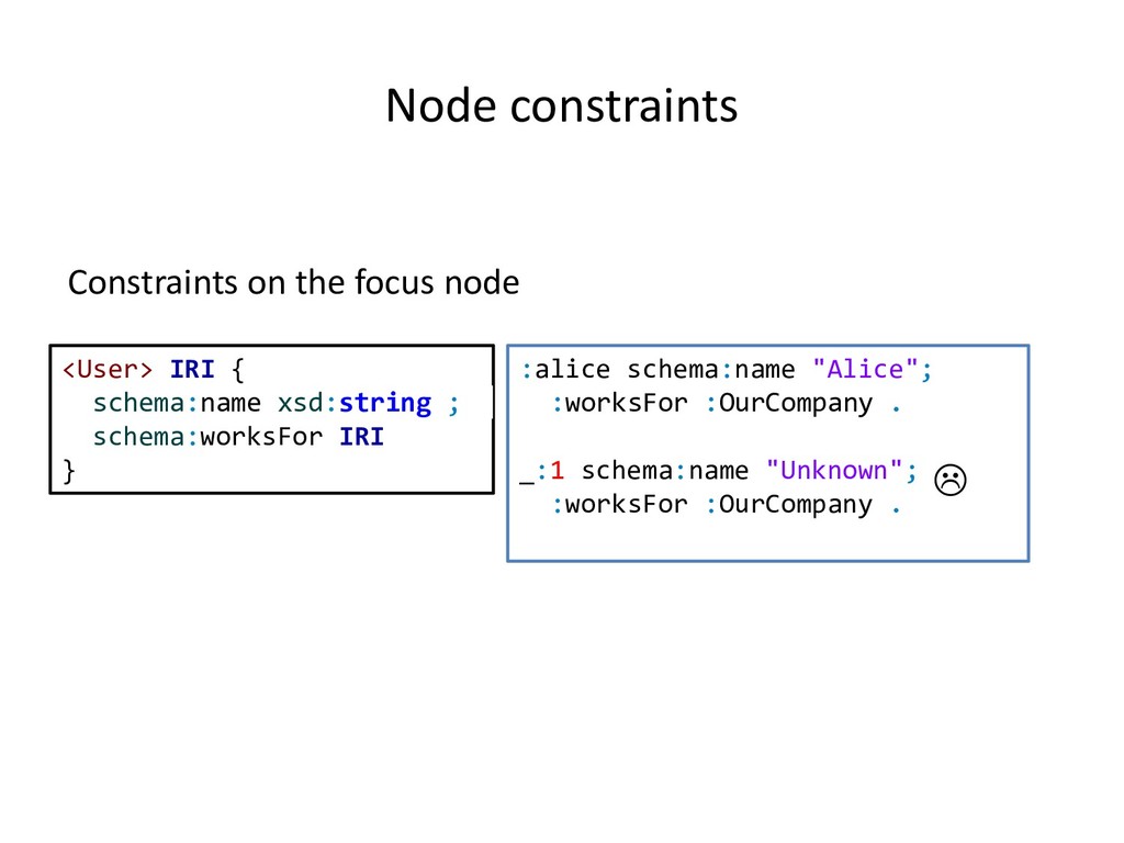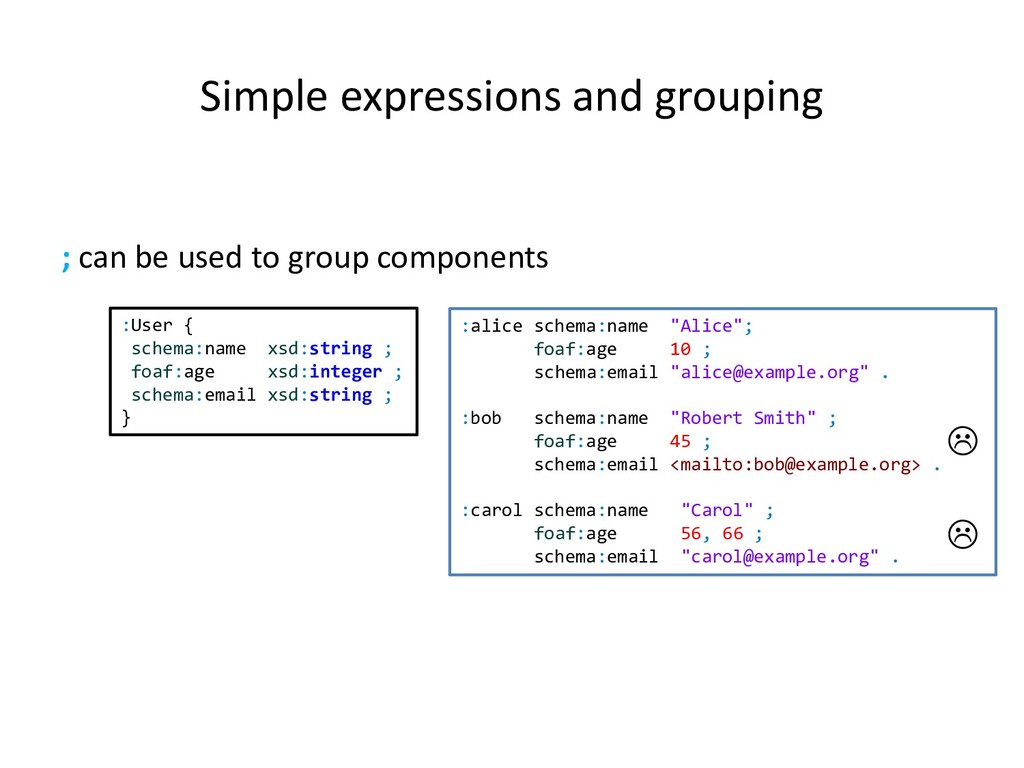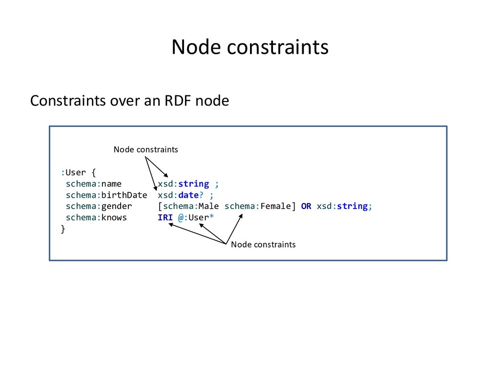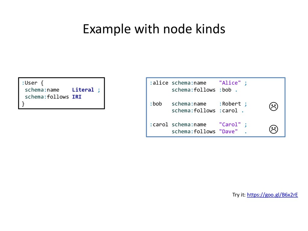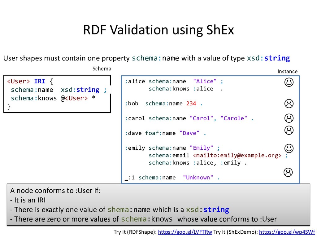 IRI - There is exactly one value of shema:name which is a xsd:string - There are zero or more values of schema:knows whose value conforms to :User RDF Validation using ShEx :alice schema:name "Alice" ; schema:knows :alice . :bob schema:name 234 . :carol schema:name "Carol", "Carole" . :dave foaf:name "Dave" . :emily schema:name "Emily" ; schema:email <mailto:[email protected]> ; schema:knows :alice, :emily . _:1 schema:name "Unknown" . Try it (RDFShape): https://goo.gl/LVFTRw Try it (ShExDemo): https://goo.gl/wp4SWf Schema Instance User shapes must contain one property schema:name with a value of type xsd:string <User> IRI { schema:name xsd:string ; schema:knows @<User> * }