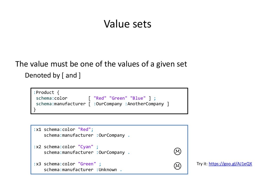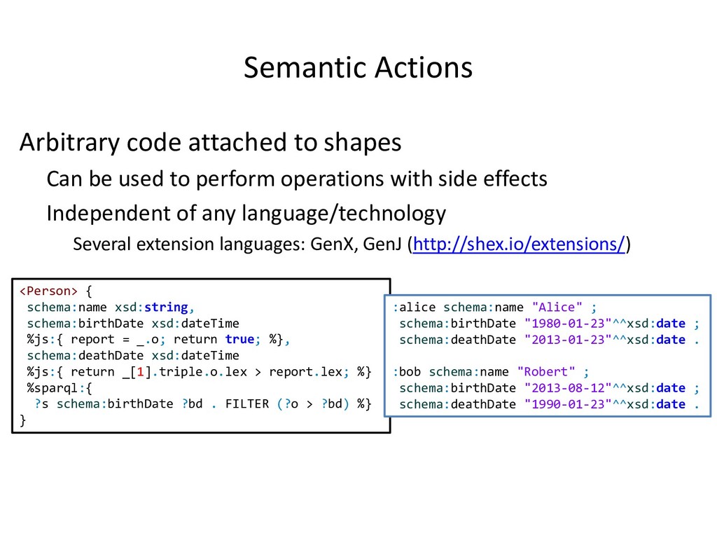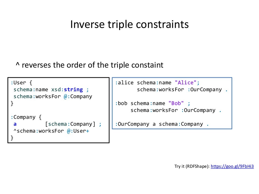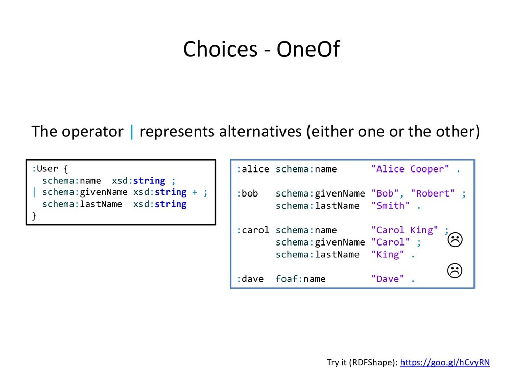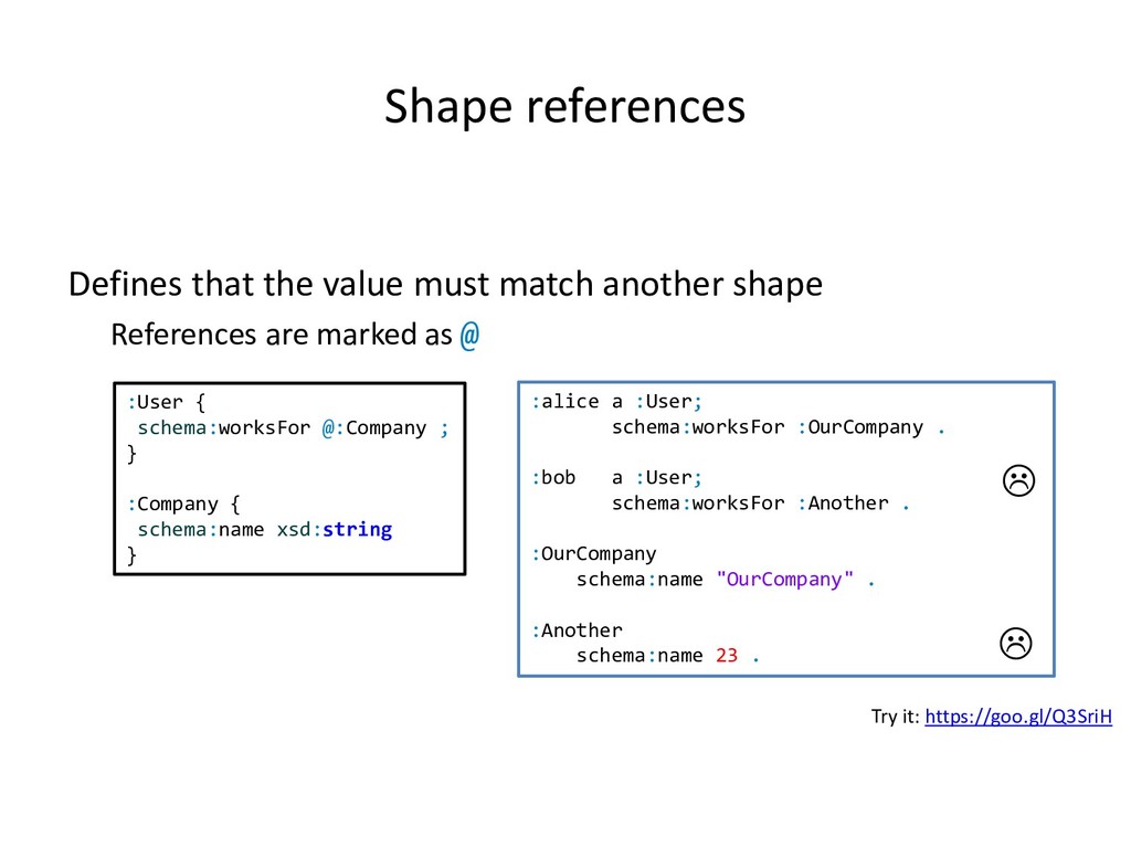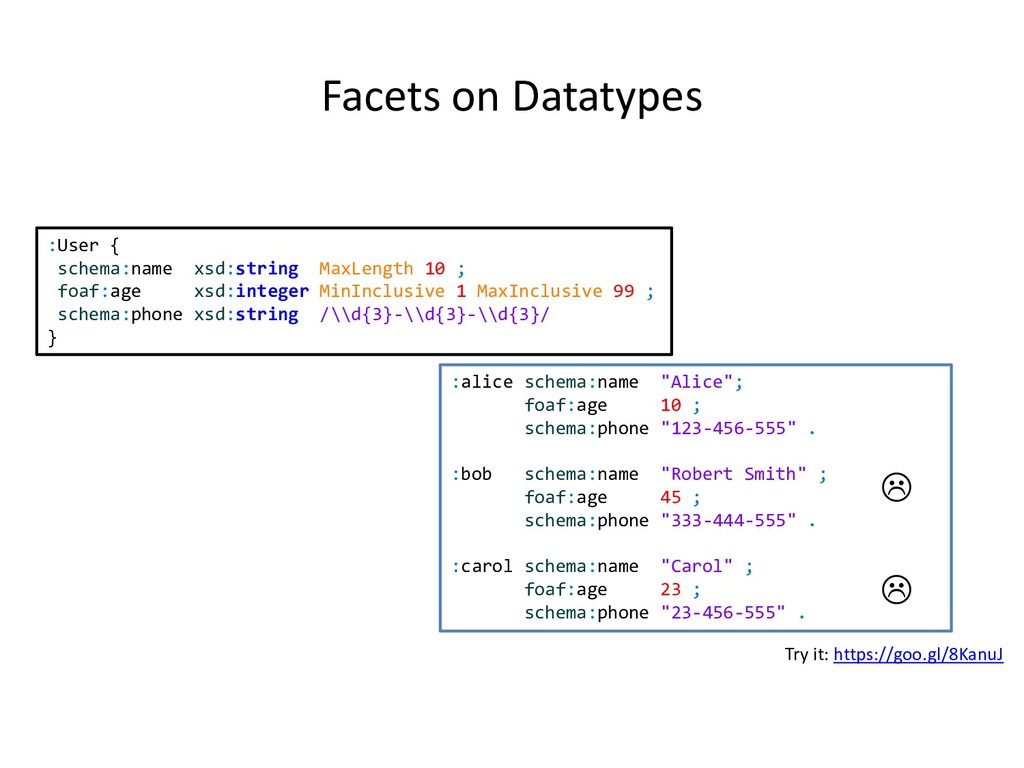 IRI - There is exactly one value of shema:name which is a xsd:string - There are zero or more values of schema:knows whose value conforms to :User RDF Validation using ShEx :alice schema:name "Alice" ; schema:knows :alice . :bob schema:name 234 . :carol schema:name "Carol", "Carole" . :dave foaf:name "Dave" . :emily schema:name "Emily" ; schema:email <mailto:[email protected]> ; schema:knows :alice, :emily . _:1 schema:name "Unknown" . Try it (RDFShape): https://goo.gl/LVFTRw Try it (ShExDemo): https://goo.gl/wp4SWf Schema Instance User shapes must contain one property schema:name with a value of type xsd:string <User> IRI { schema:name xsd:string ; schema:knows @<User> * }