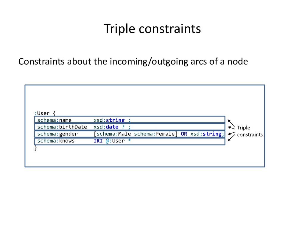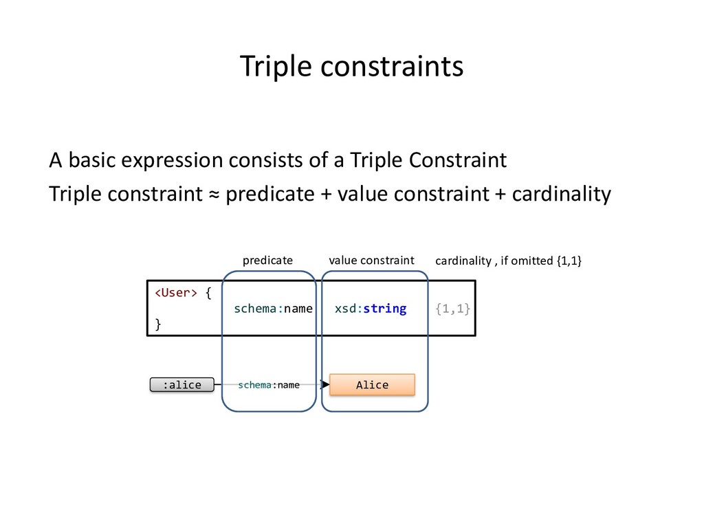 consists of a Triple Constraint Triple constraint ≈ predicate + value constraint + cardinality :alice Alice predicate value constraint schema:name cardinality , if omitted {1,1} {1,1}