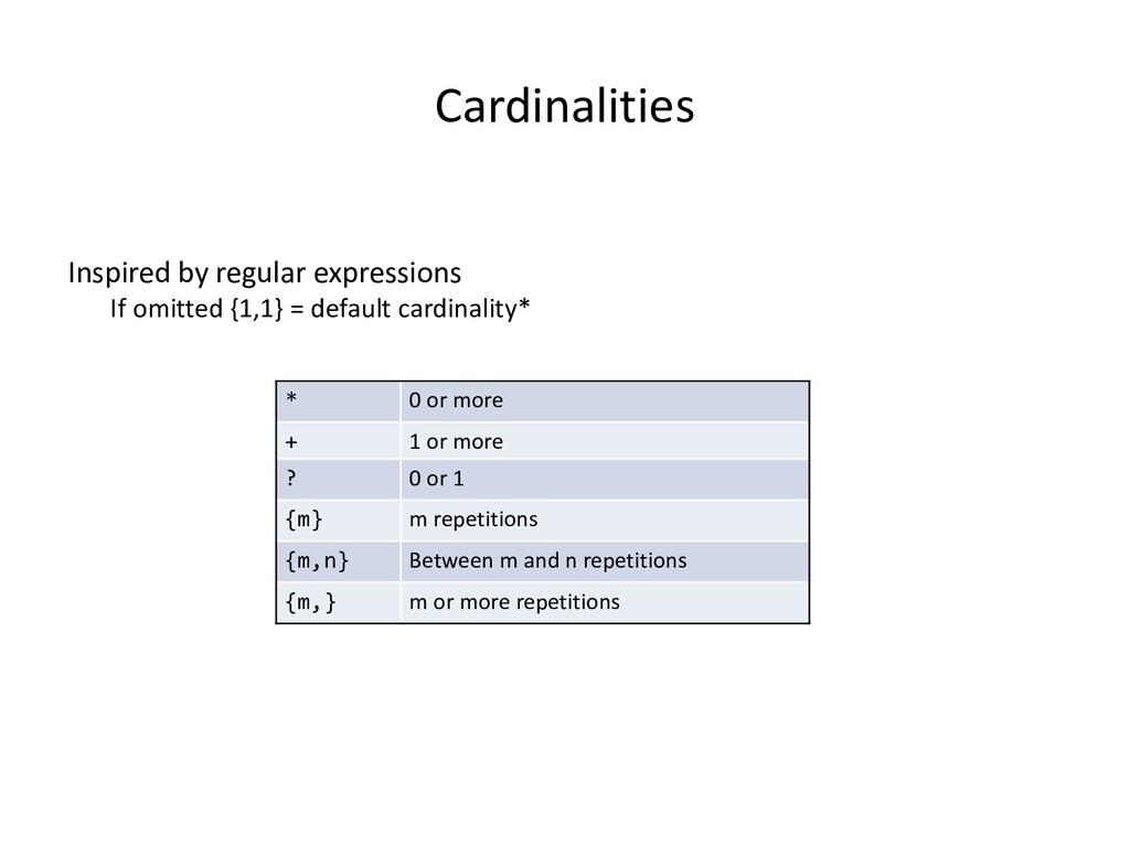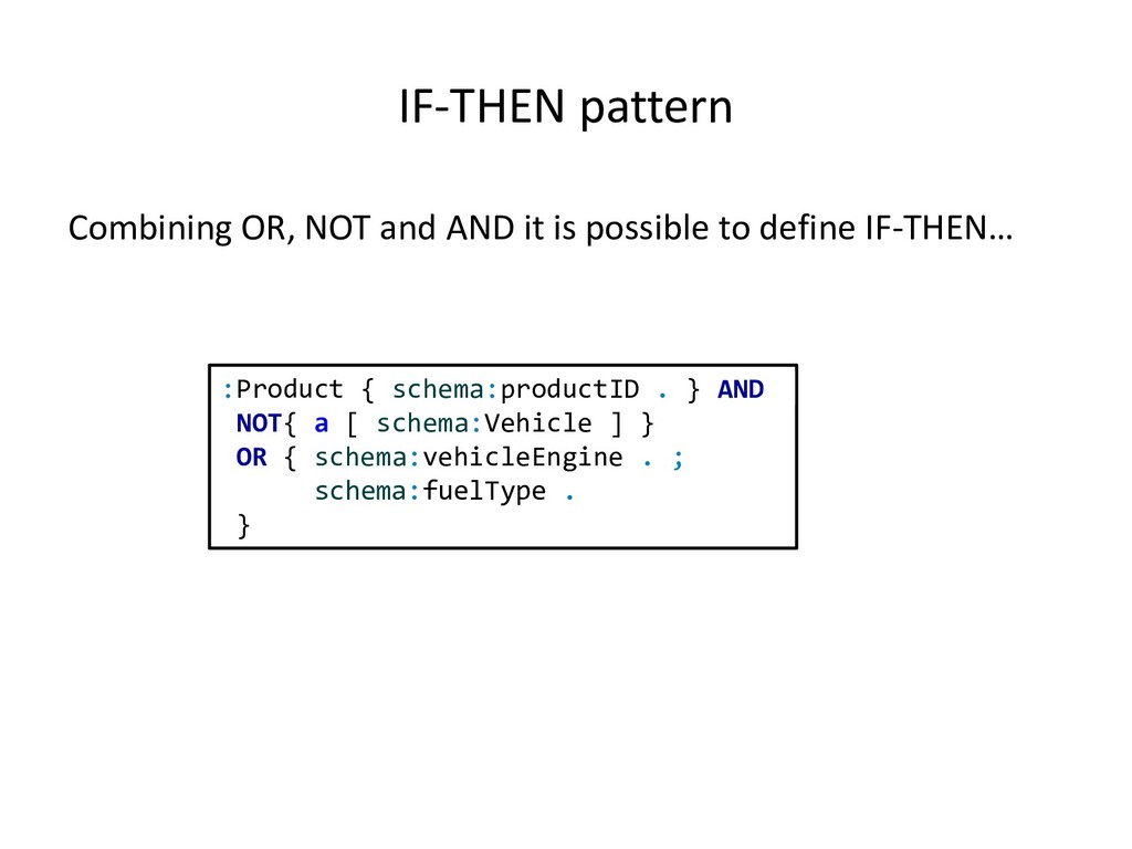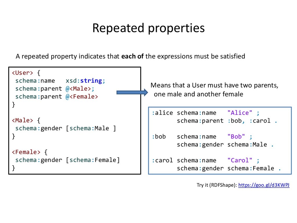 schema:parent @<Male>; schema:parent @<Female> } <Male> { schema:gender [schema:Male ] } <Female> { schema:gender [schema:Female] } :alice schema:name "Alice" ; schema:parent :bob, :carol . :bob schema:name "Bob" ; schema:gender schema:Male . :carol schema:name "Carol" ; schema:gender schema:Female . A repeated property indicates that each of the expressions must be satisfied Means that a User must have two parents, one male and another female