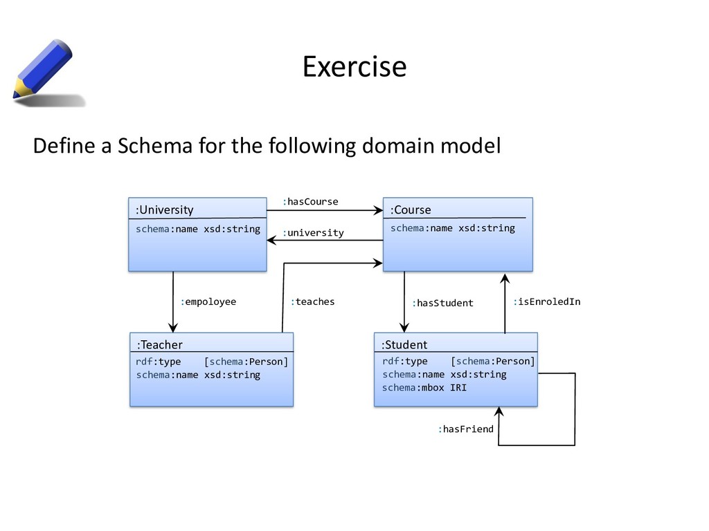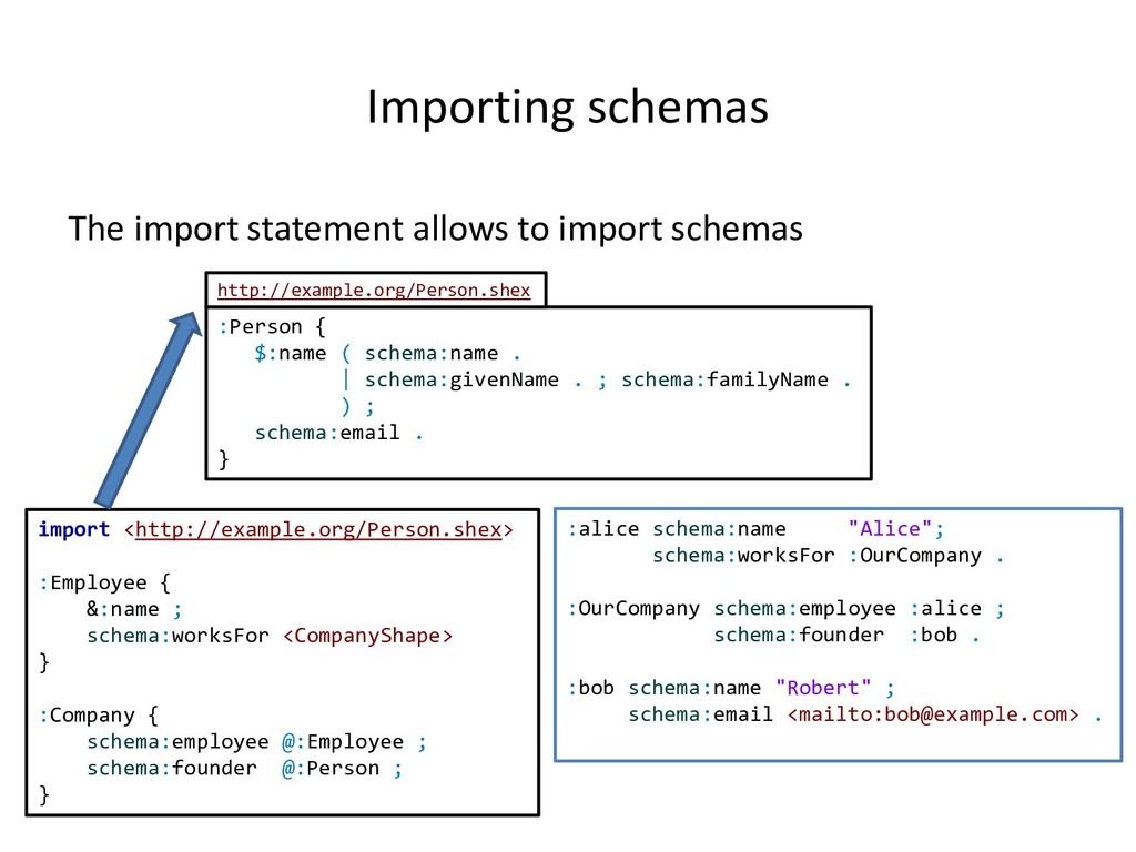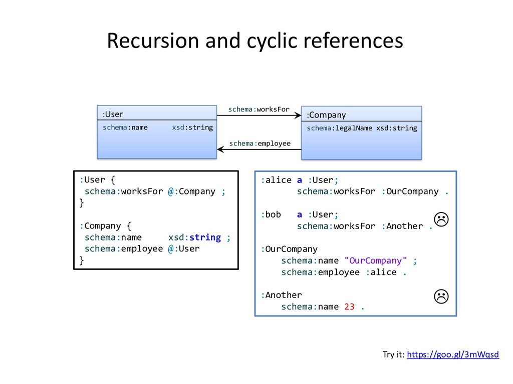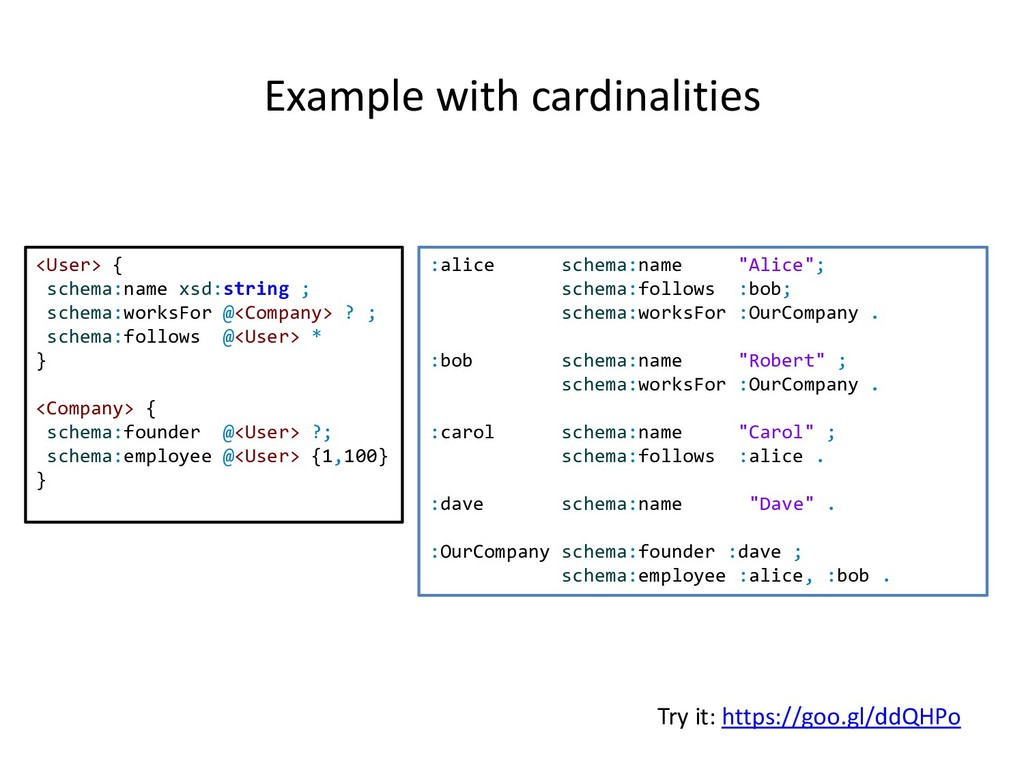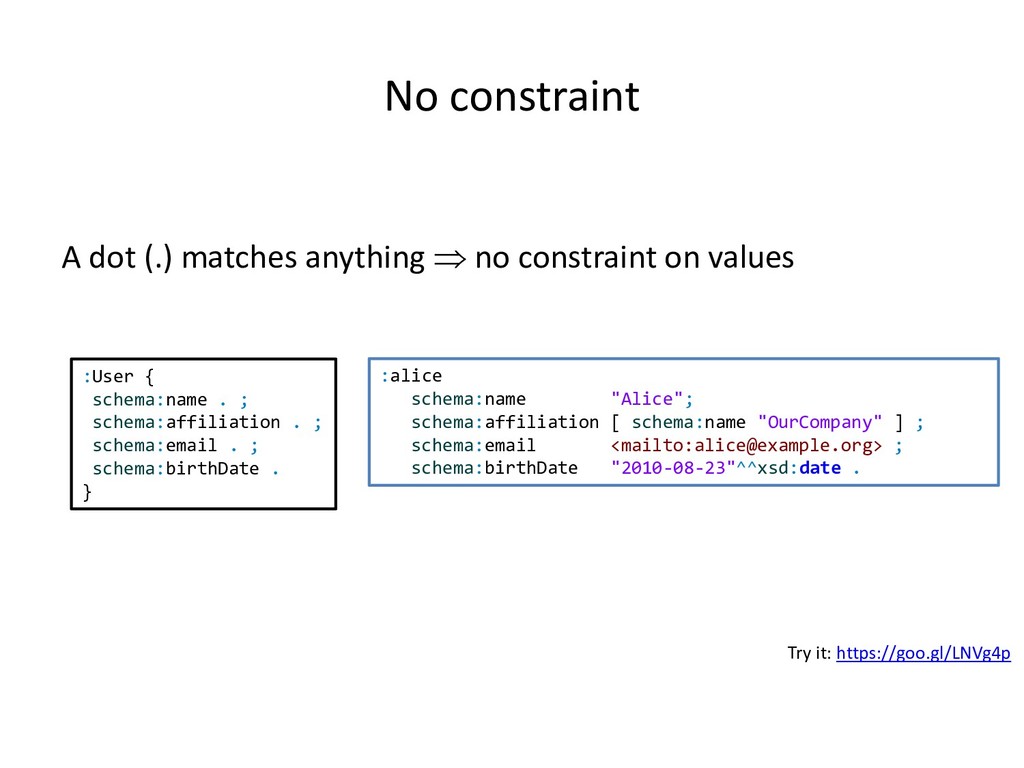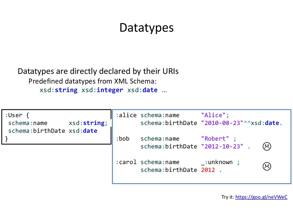 schema:name with a value of type xsd:string prefix schema: <http://schema.org/> prefix xsd: <http://www.w3.org/2001/XMLSchema#> <User> IRI { schema:name xsd:string ; schema:knows @<User> * } Prefix declarations as in Turtle Note: We will omit prefix declarations and use the aliases from: http://prefix.cc