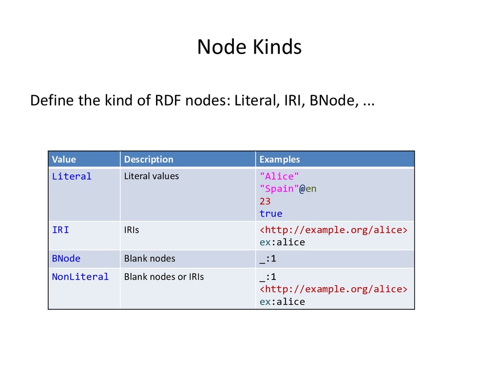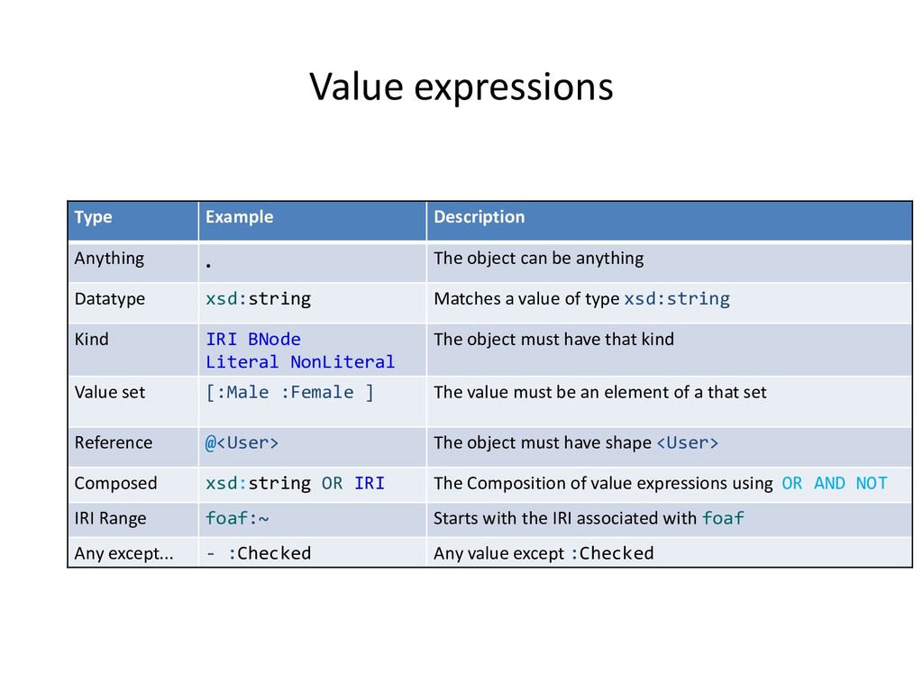 be anything Datatype xsd:string Matches a value of type xsd:string Kind IRI BNode Literal NonLiteral The object must have that kind Value set [:Male :Female ] The value must be an element of a that set Reference @<User> The object must have shape <User> Composed xsd:string OR IRI The Composition of value expressions using OR AND NOT IRI Range foaf:~ Starts with the IRI associated with foaf Any except... - :Checked Any value except :Checked
