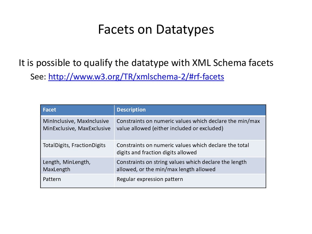 with XML Schema facets See: http://www.w3.org/TR/xmlschema-2/#rf-facets Facet Description MinInclusive, MaxInclusive MinExclusive, MaxExclusive Constraints on numeric values which declare the min/max value allowed (either included or excluded) TotalDigits, FractionDigits Constraints on numeric values which declare the total digits and fraction digits allowed Length, MinLength, MaxLength Constraints on string values which declare the length allowed, or the min/max length allowed Pattern Regular expression pattern
