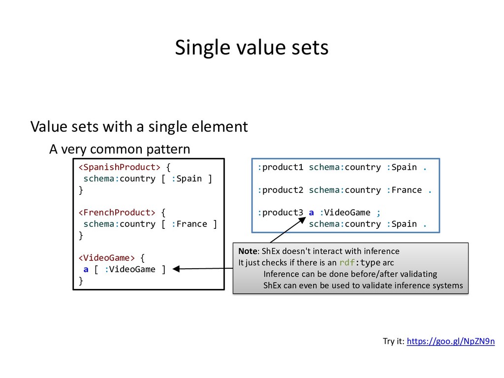 very common pattern Try it: https://goo.gl/NpZN9n <SpanishProduct> { schema:country [ :Spain ] } <FrenchProduct> { schema:country [ :France ] } <VideoGame> { a [ :VideoGame ] } :product1 schema:country :Spain . :product2 schema:country :France . :product3 a :VideoGame ; schema:country :Spain . Note: ShEx doesn't interact with inference It just checks if there is an rdf:type arc Inference can be done before/after validating ShEx can even be used to validate inference systems