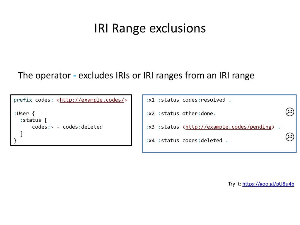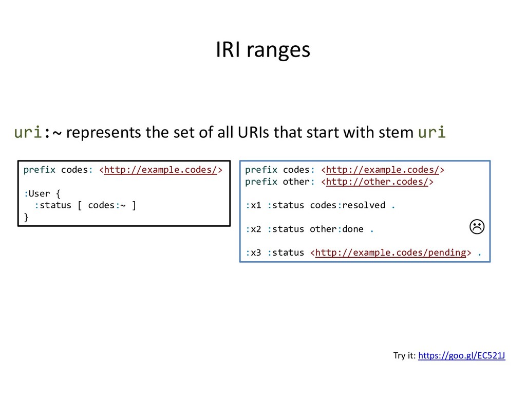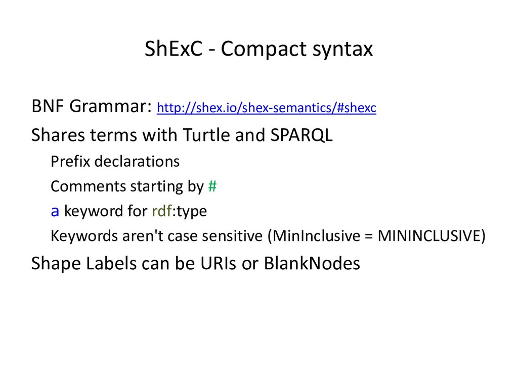 Turtle and SPARQL Prefix declarations Comments starting by # a keyword for rdf:type Keywords aren't case sensitive (MinInclusive = MININCLUSIVE) Shape Labels can be URIs or BlankNodes