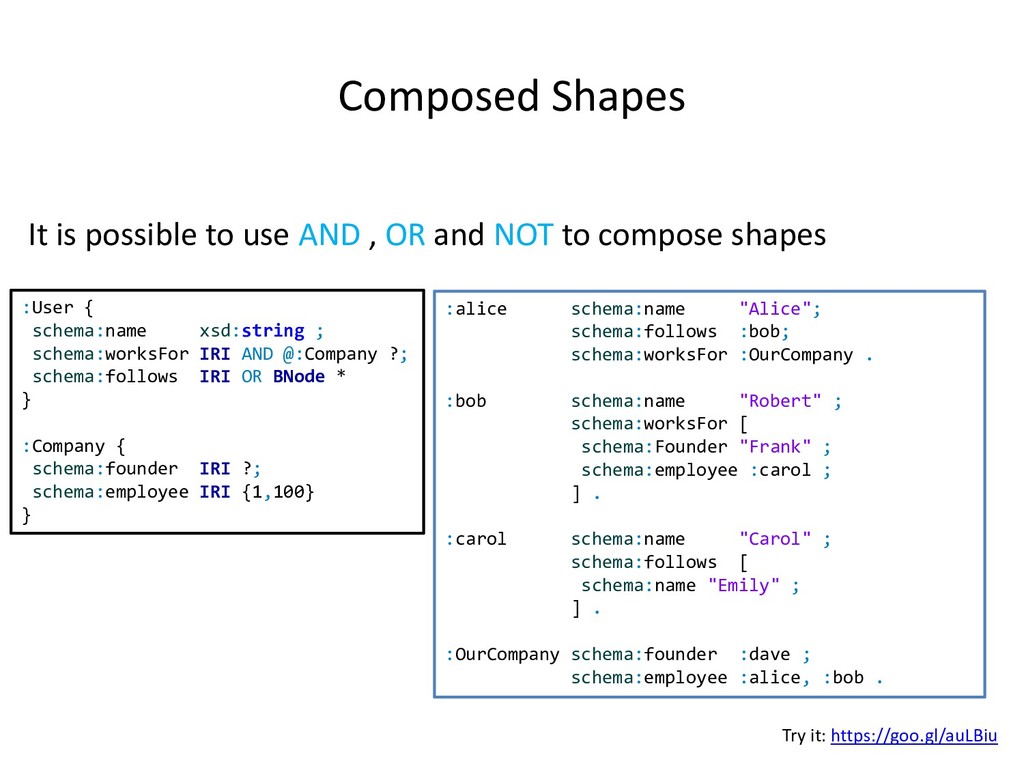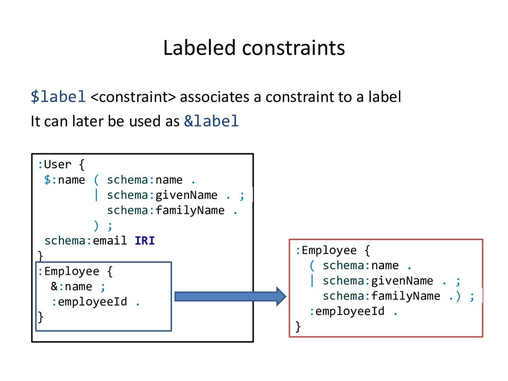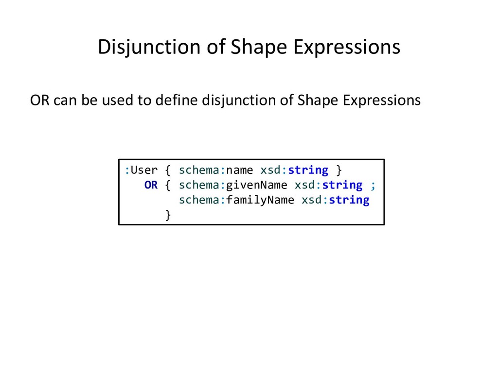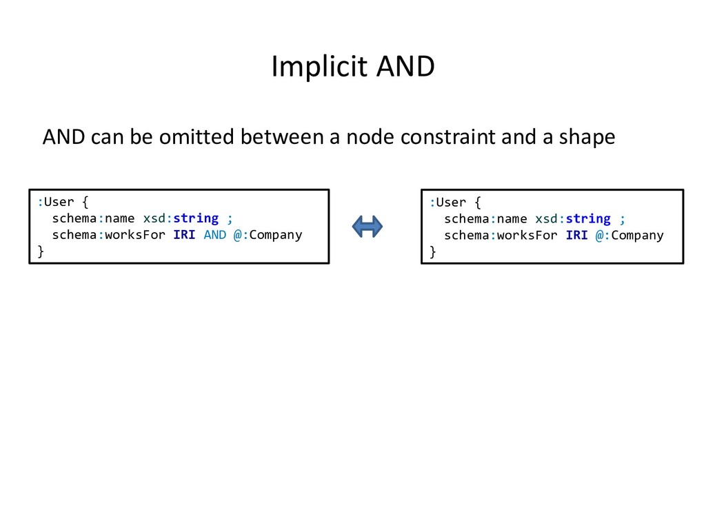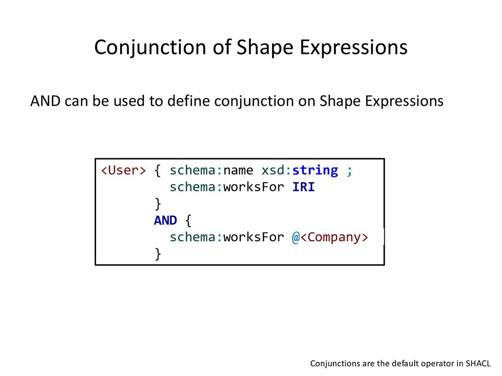 conjunction on Shape Expressions <User> { schema:name xsd:string ; schema:worksFor IRI } AND { schema:worksFor @<Company> } Conjunctions are the default operator in SHACL