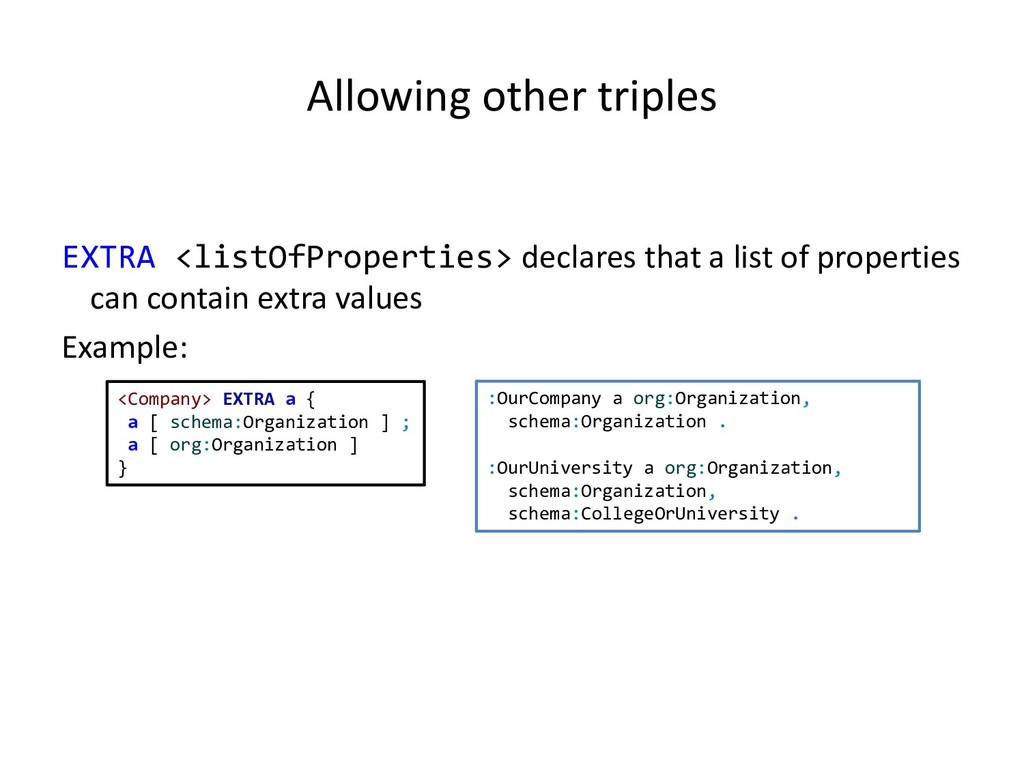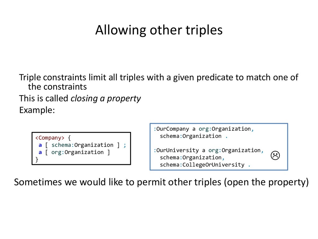given predicate to match one of the constraints This is called closing a property Example: <Company> { a [ schema:Organization ] ; a [ org:Organization ] } :OurCompany a org:Organization, schema:Organization . :OurUniversity a org:Organization, schema:Organization, schema:CollegeOrUniversity . Sometimes we would like to permit other triples (open the property)
