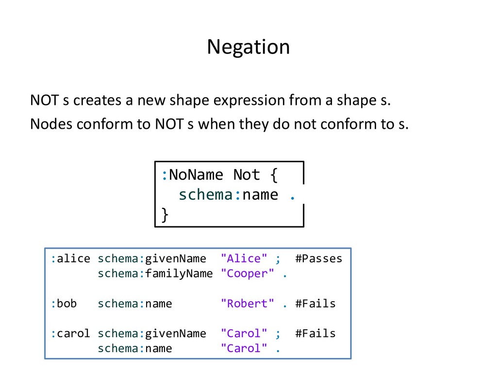 shape s. Nodes conform to NOT s when they do not conform to s. :NoName Not { schema:name . } :alice schema:givenName "Alice" ; #Passes schema:familyName "Cooper" . :bob schema:name "Robert" . #Fails :carol schema:givenName "Carol" ; #Fails schema:name "Carol" .