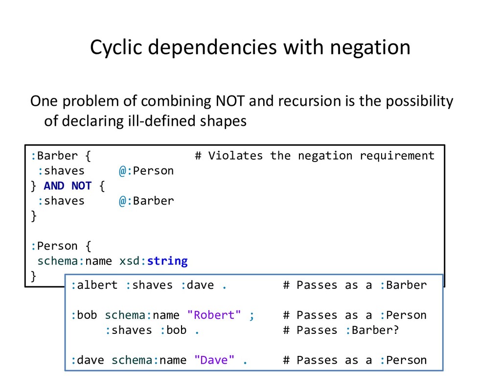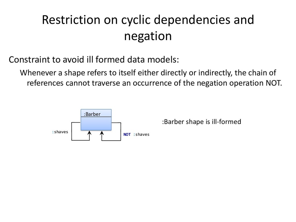 formed data models: Whenever a shape refers to itself either directly or indirectly, the chain of references cannot traverse an occurrence of the negation operation NOT. :Barber NOT :shaves :shaves :Barber shape is ill-formed