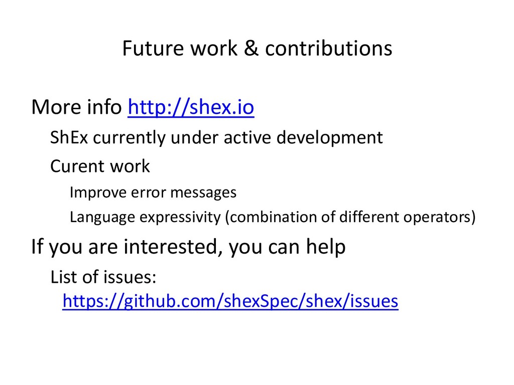 active development Curent work Improve error messages Language expressivity (combination of different operators) If you are interested, you can help List of issues: https://github.com/shexSpec/shex/issues