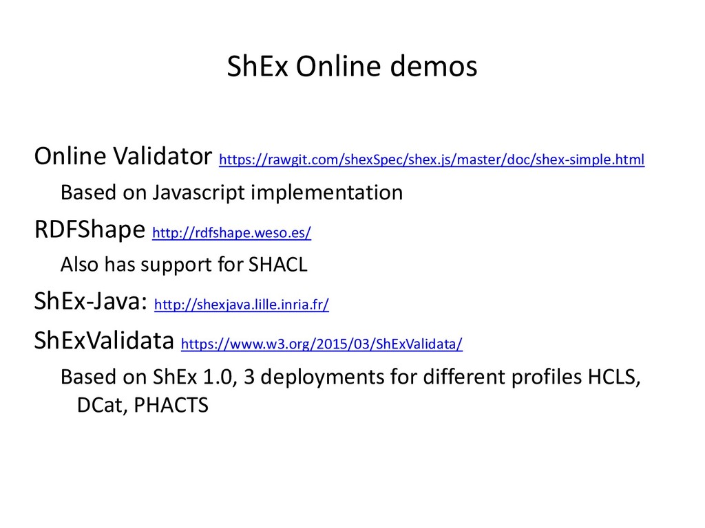 RDFShape http://rdfshape.weso.es/ Also has support for SHACL ShEx-Java: http://shexjava.lille.inria.fr/ ShExValidata https://www.w3.org/2015/03/ShExValidata/ Based on ShEx 1.0, 3 deployments for different profiles HCLS, DCat, PHACTS