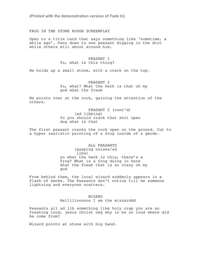 card that says something like ‘sometime, a while ago’. Pans down to one peasant digging in the dirt while others mill about around him. PEASANT 1 Yo, what is this thing? He holds up a small stone, with a crack on the top. PEASANT 2 Yo, what? What the heck is that oh my god what the freak He points over at the rock, gaining the attention of the others. PEASANT 2 (cont'd) ad libbing ( ) Yo you should crack that shit open dog what is that The first peasant cracks the rock open on the ground. Cut to a hyper realistic painting of a frog inside of a geode. ALL PEASANTS (gasping noises/ad libs) yo what the heck is this, there’s a frog? What is a frog doing in here what the freak that is so crazy oh my god From behind them, the local wizard suddenly appears in a flash of smoke. The Peasants don't notice till he summons lightning and everyone scatters. WIZARD Hellllloooooo I am the wizzarddd Peasants all ad lib something like holy crap you are so freaking loud, jesus christ omg why is he so loud where did he come from? Wizard points at stone with big hand. (Printed with the demonstration version of Fade In)