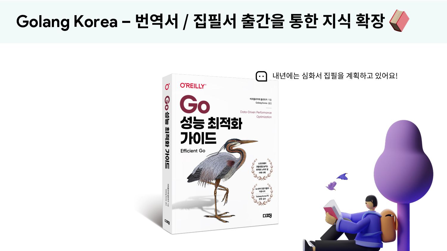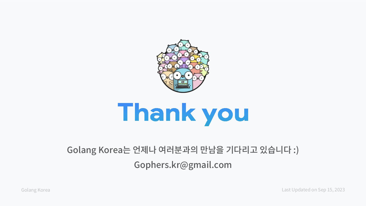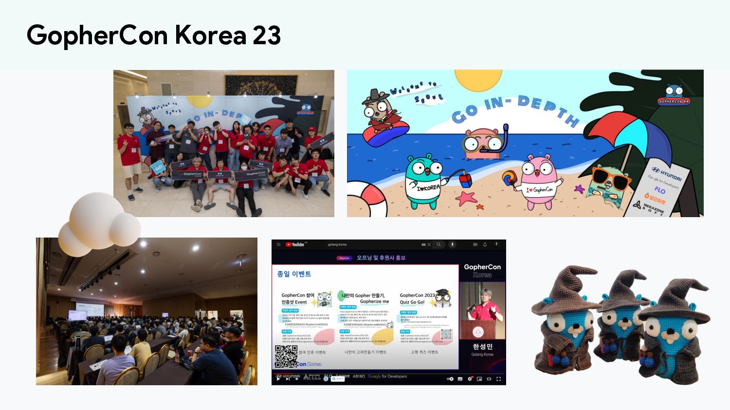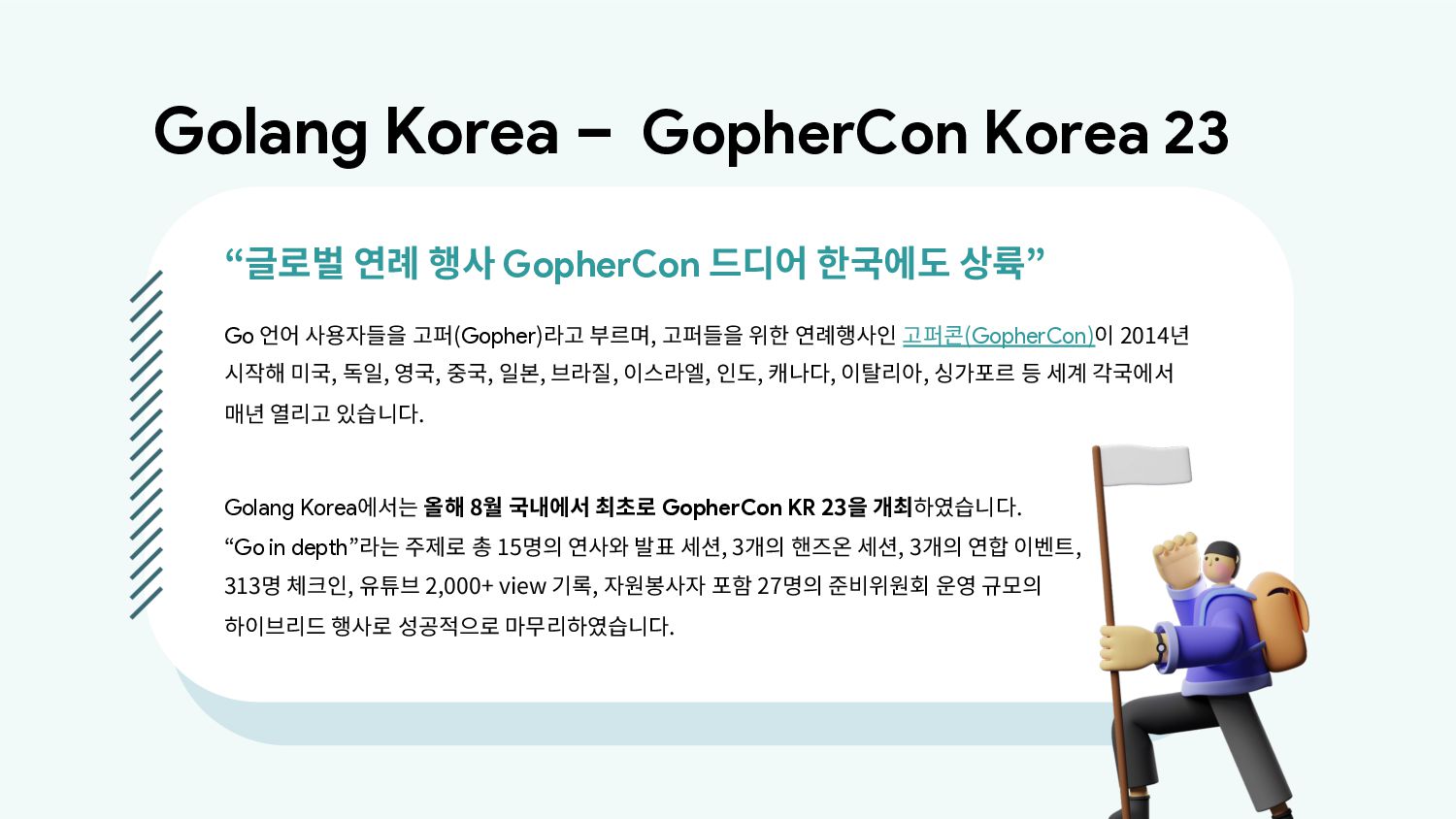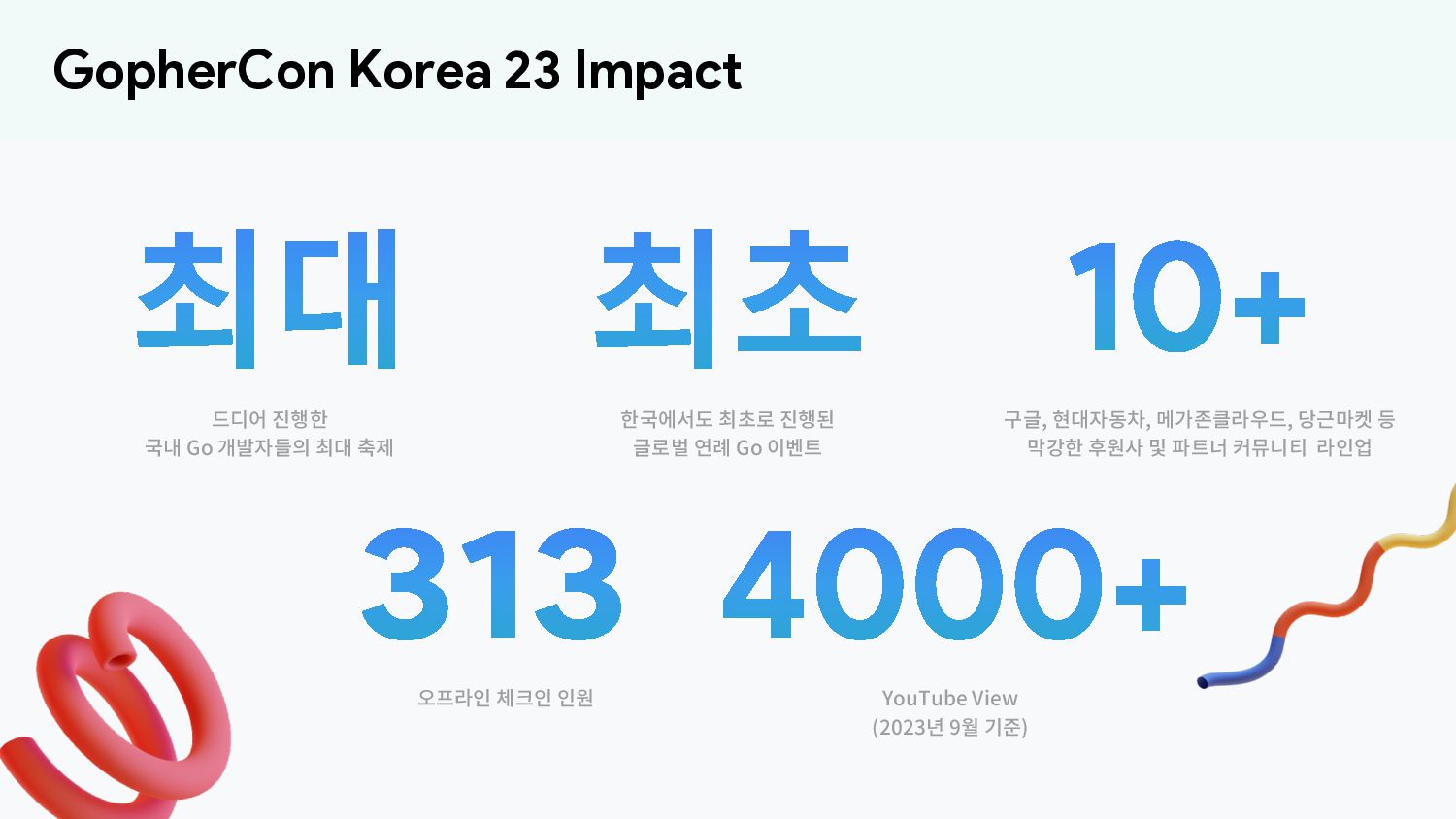 a natural fit because engineers on the team are encouraged to use concurrency and parallel algorithms. Go promised a sweet spot between performance and readability that neither of the other languages [Python and C++] were able to offer. “글로벌 연례 행사 GopherCon 드디어 한국에도 상륙” Go 언어 사용자들을 고퍼(Gopher)라고 부르며, 고퍼들을 위한 연례행사인 고퍼콘(GopherCon)이 2014년 시작해 미국, 독일, 영국, 중국, 일본, 브라질, 이스라엘, 인도, 캐나다, 이탈리아, 싱가포르 등 세계 각국에서 매년 열리고 있습니다. Golang Korea에서는 올해 8월 국내에서 최초로 GopherCon KR 23을 개최하였습니다. “Go in depth”라는 주제로 총 15명의 연사와 발표 세션, 3개의 핸즈온 세션, 3개의 연합 이벤트, 313명 체크인, 유튜브 2,000+ view 기록, 자원봉사자 포함 27명의 준비위원회 운영 규모의 하이브리드 행사로 성공적으로 마무리하였습니다.