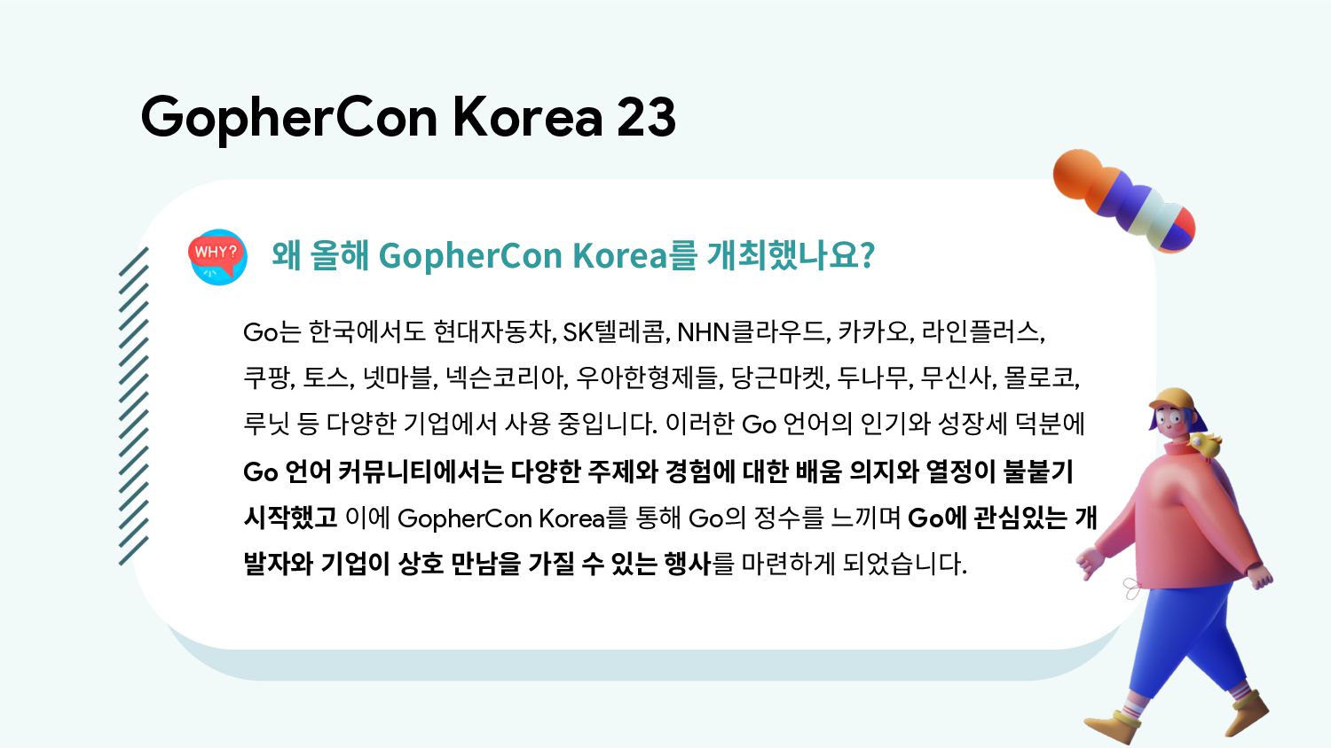 because engineers on the team are encouraged to use concurrency and parallel algorithms. Go promised a sweet spot between performance and readability that neither of the other languages [Python and C++] were able to offer. 왜 올해 GopherCon Korea를 개최했나요? Go는 한국에서도 현대자동차, SK텔레콤, NHN클라우드, 카카오, 라인플러스, 쿠팡, 토스, 넷마블, 넥슨코리아, 우아한형제들, 당근마켓, 두나무, 무신사, 몰로코, 루닛 등 다양한 기업에서 사용 중입니다. 이러한 Go 언어의 인기와 성장세 덕분에 Go 언어 커뮤니티에서는 다양한 주제와 경험에 대한 배움 의지와 열정이 불붙기 시작했고 이에 GopherCon Korea를 통해 Go의 정수를 느끼며 Go에 관심있는 개 발자와 기업이 상호 만남을 가질 수 있는 행사를 마련하게 되었습니다.