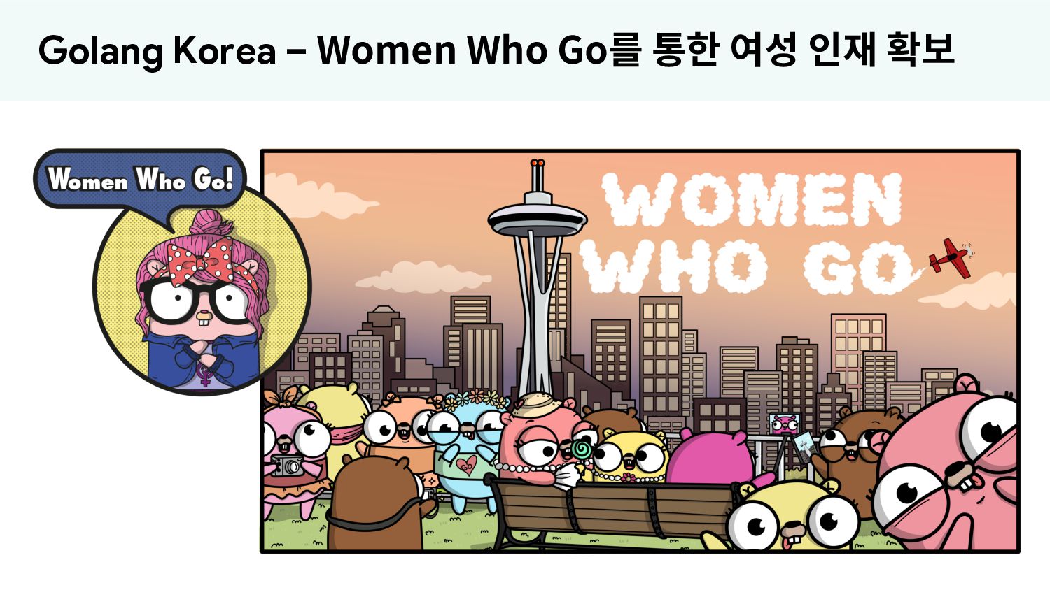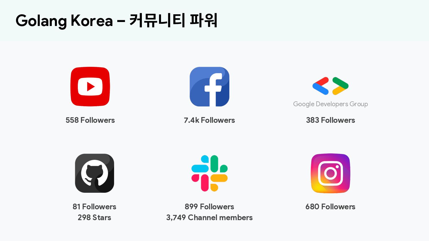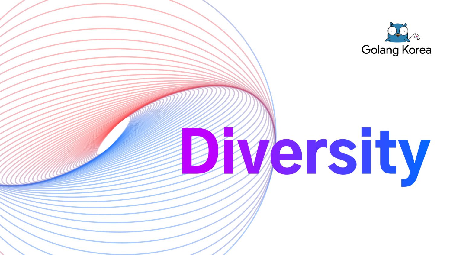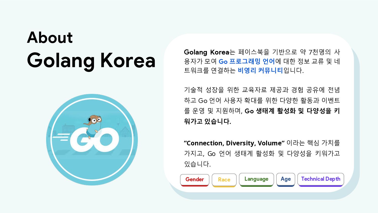 프로그래밍 언어에 대한 정보 교류 및 네 트워크를 연결하는 비영리 커뮤니티입니다. 기술적 성장을 위한 교육자료 제공과 경험 공유에 전념 하고 Go 언어 사용자 확대를 위한 다양한 활동과 이벤트 를 운영 및 지원하며, Go 생태계 활성화 및 다양성을 키 워가고 있습니다. ”Connection, Diversity, Volume” 이라는 핵심 가치를 가지고, Go 언어 생태계 활성화 및 다양성을 키워가고 있습니다. About Golang Korea Gender Race Age Language Technical Depth