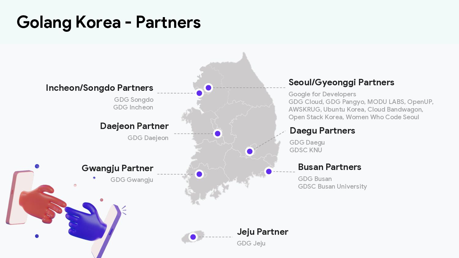 University Seoul/Gyeonggi Partners Google for Developers GDG Cloud, GDG Pangyo, MODU LABS, OpenUP, AWSKRUG, Ubuntu Korea, Cloud Bandwagon, Open Stack Korea, Women Who Code Seoul Jeju Partner GDG Jeju Incheon/Songdo Partners GDG Songdo GDG Incheon Daejeon Partner GDG Daejeon Gwangju Partner GDG Gwangju Daegu Partners GDG Daegu GDSC KNU