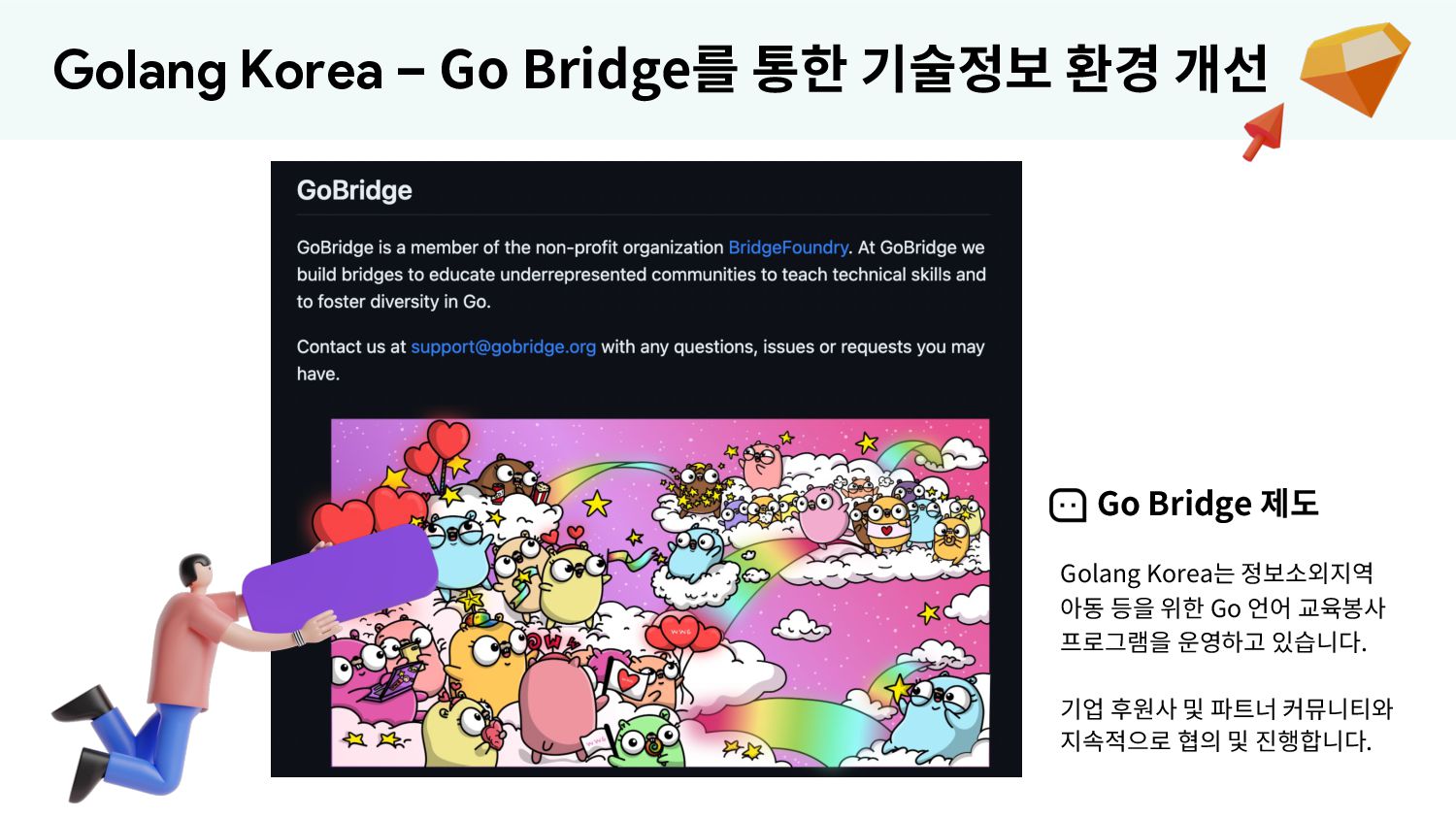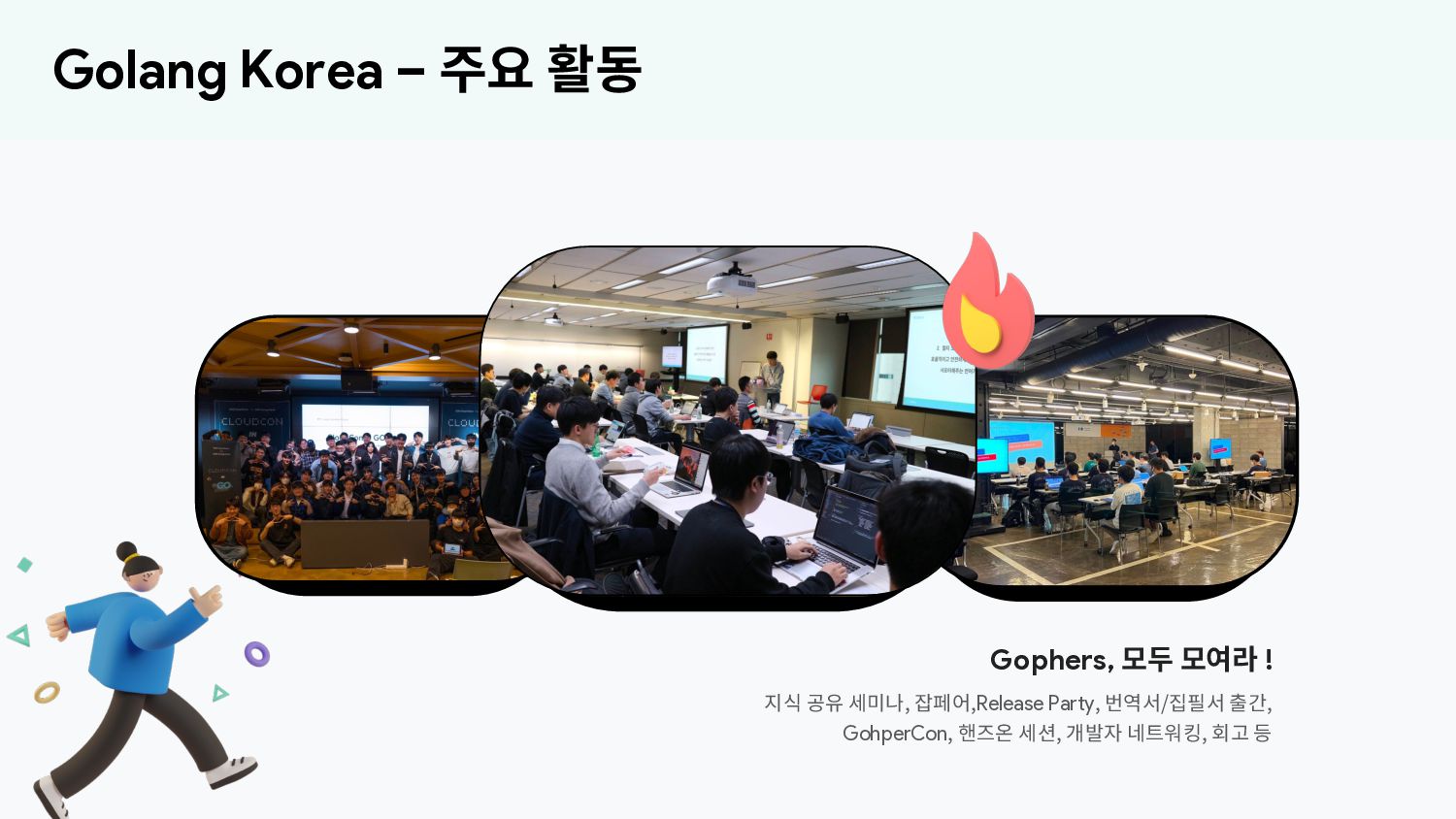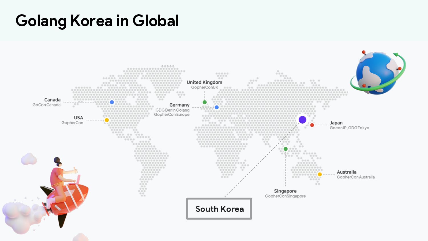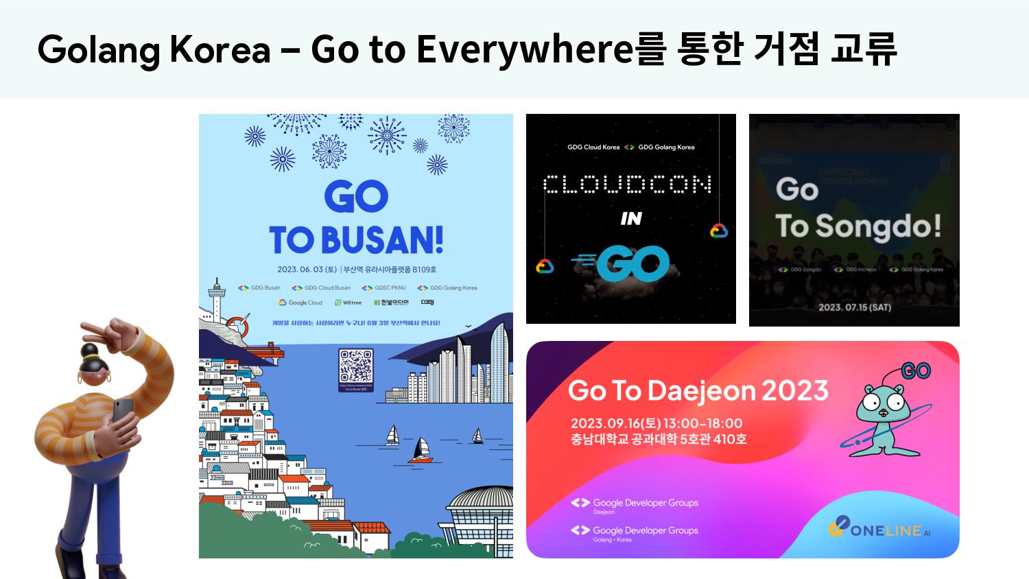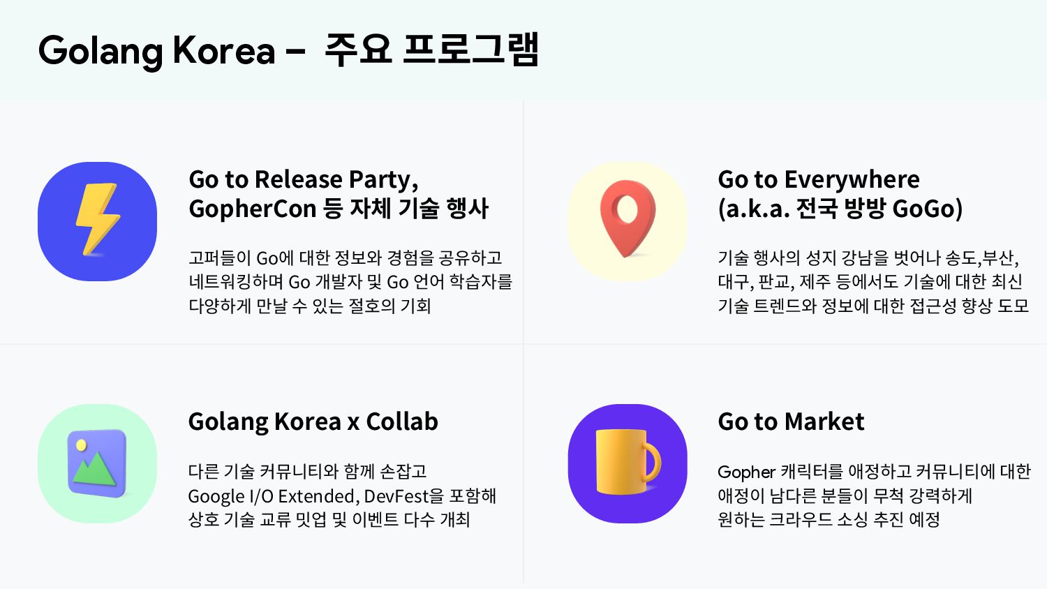 방방 GoGo) 기술 행사의 성지 강남을 벗어나 송도,부산, 대구, 판교, 제주 등에서도 기술에 대한 최신 기술 트렌드와 정보에 대한 접근성 향상 도모 Golang Korea x Collab 다른 기술 커뮤니티와 함께 손잡고 Google I/O Extended, DevFest을 포함해 상호 기술 교류 밋업 및 이벤트 다수 개최 Go to Release Party, GopherCon 등 자체 기술 행사 고퍼들이 Go에 대한 정보와 경험을 공유하고 네트워킹하며 Go 개발자 및 Go 언어 학습자를 다양하게 만날 수 있는 절호의 기회 Go to Market Gopher 캐릭터를 애정하고 커뮤니티에 대한 애정이 남다른 분들이 무척 강력하게 원하는 크라우드 소싱 추진 예정