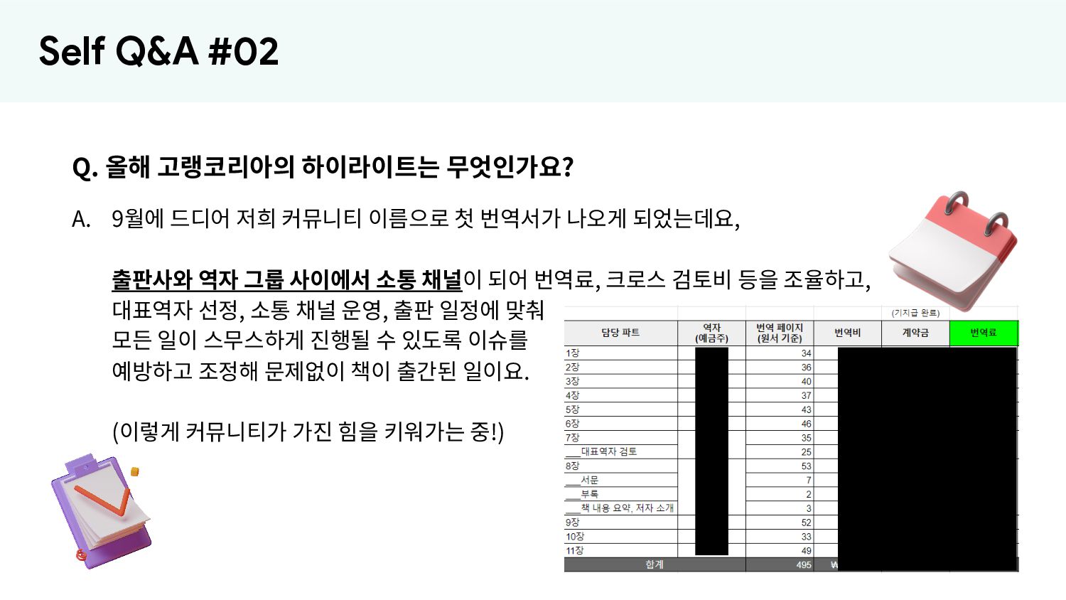 드디어 저희 커뮤니티 이름으로 첫 번역서가 나오게 되었는데요, 출판사와 역자 그룹 사이에서 소통 채널이 되어 번역료, 크로스 검토비 등을 조율하고, 대표역자 선정, 소통 채널 운영, 출판 일정에 맞춰 모든 일이 스무스하게 진행될 수 있도록 이슈를 예방하고 조정해 문제없이 책이 출간된 일이요. (이렇게 커뮤니티가 가진 힘을 키워가는 중!)
