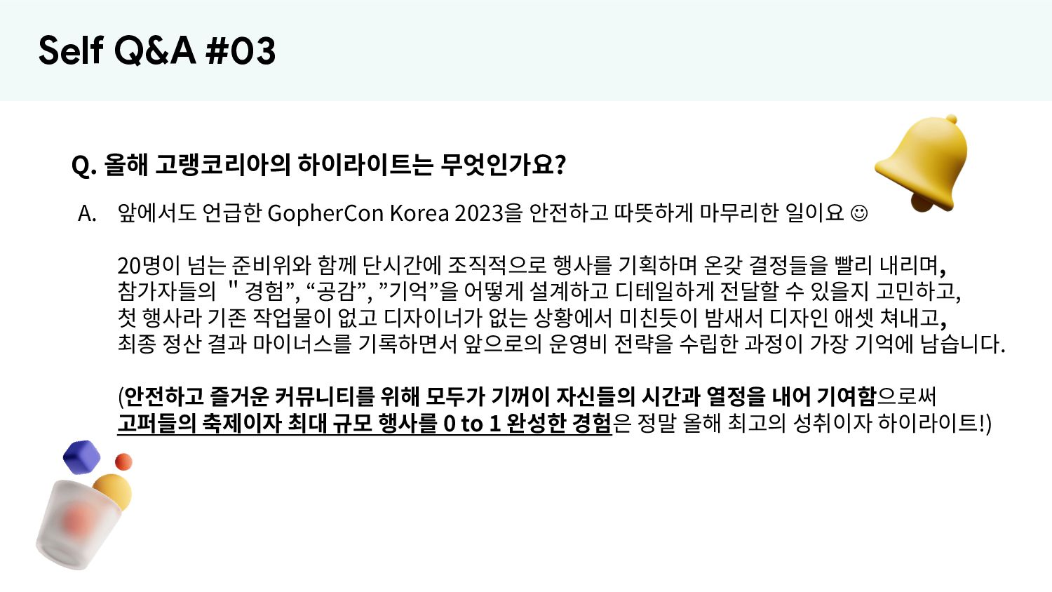 언급한 GopherCon Korea 2023을 안전하고 따뜻하게 마무리한 일이요 J 20명이 넘는 준비위와 함께 단시간에 조직적으로 행사를 기획하며 온갖 결정들을 빨리 내리며, 참가자들의 "경험”, “공감”, ”기억”을 어떻게 설계하고 디테일하게 전달할 수 있을지 고민하고, 첫 행사라 기존 작업물이 없고 디자이너가 없는 상황에서 미친듯이 밤새서 디자인 애셋 쳐내고, 최종 정산 결과 마이너스를 기록하면서 앞으로의 운영비 전략을 수립한 과정이 가장 기억에 남습니다. (안전하고 즐거운 커뮤니티를 위해 모두가 기꺼이 자신들의 시간과 열정을 내어 기여함으로써 고퍼들의 축제이자 최대 규모 행사를 0 to 1 완성한 경험은 정말 올해 최고의 성취이자 하이라이트!)