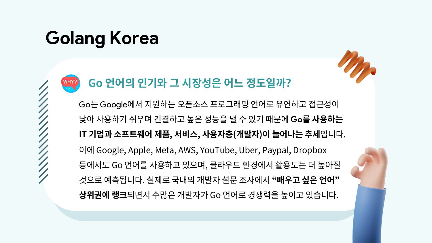 engineers on the team are encouraged to use concurrency and parallel algorithms. Go promised a sweet spot between performance and readability that neither of the other languages [Python and C++] were able to offer. Go 언어의 인기와 그 시장성은 어느 정도일까? Go는 Google에서 지원하는 오픈소스 프로그래밍 언어로 유연하고 접근성이 낮아 사용하기 쉬우며 간결하고 높은 성능을 낼 수 있기 때문에 Go를 사용하는 IT 기업과 소프트웨어 제품, 서비스, 사용자층(개발자)이 늘어나는 추세입니다. 이에 Google, Apple, Meta, AWS, YouTube, Uber, Paypal, Dropbox 등에서도 Go 언어를 사용하고 있으며, 클라우드 환경에서 활용도는 더 높아질 것으로 예측됩니다. 실제로 국내외 개발자 설문 조사에서 “배우고 싶은 언어” 상위권에 랭크되면서 수많은 개발자가 Go 언어로 경쟁력을 높이고 있습니다.