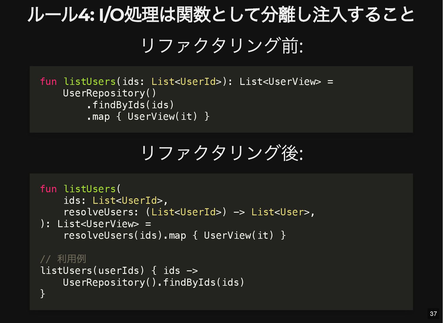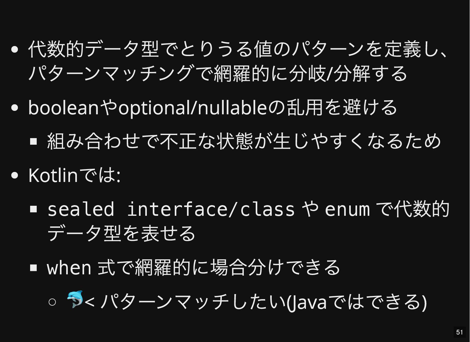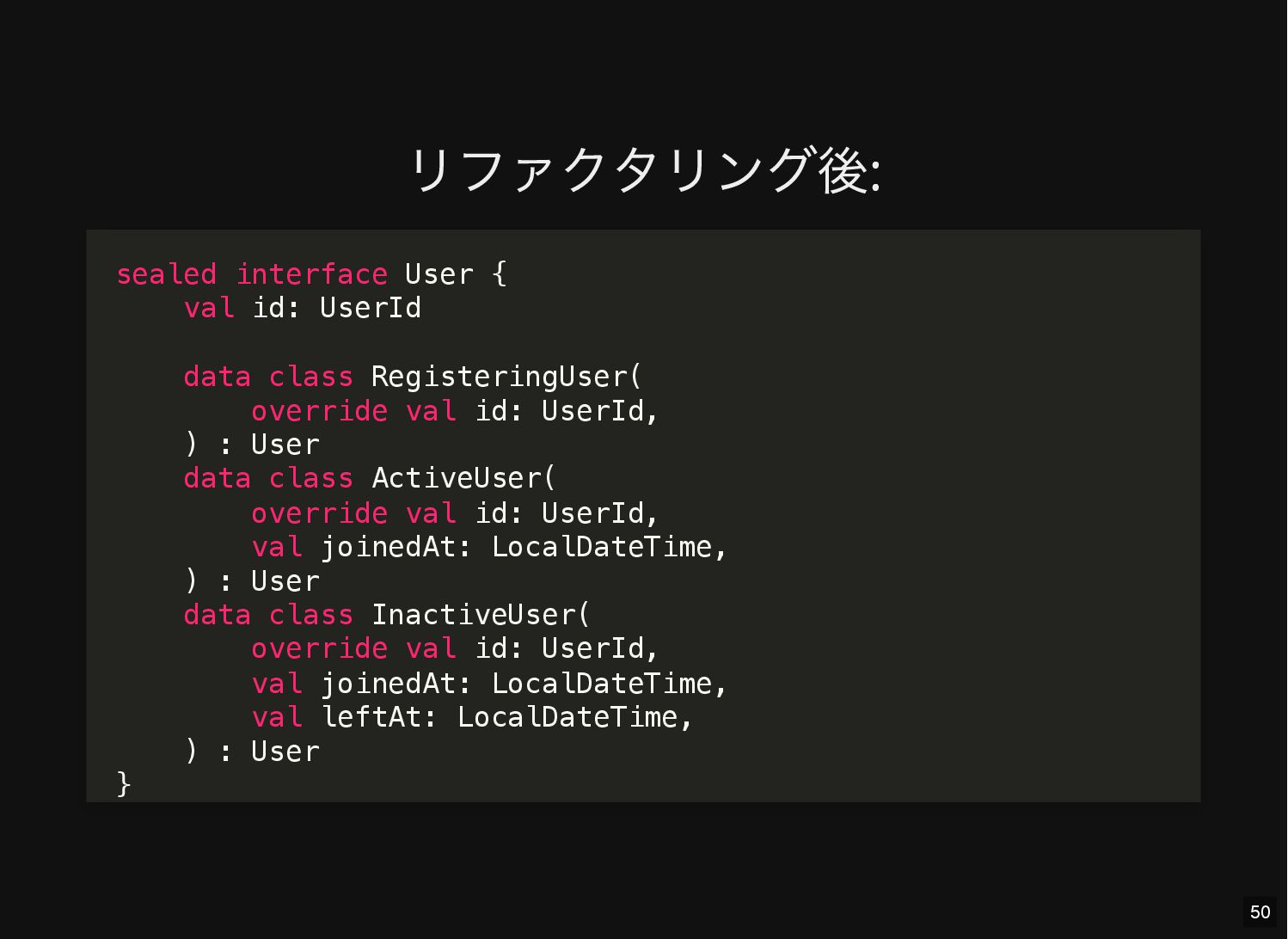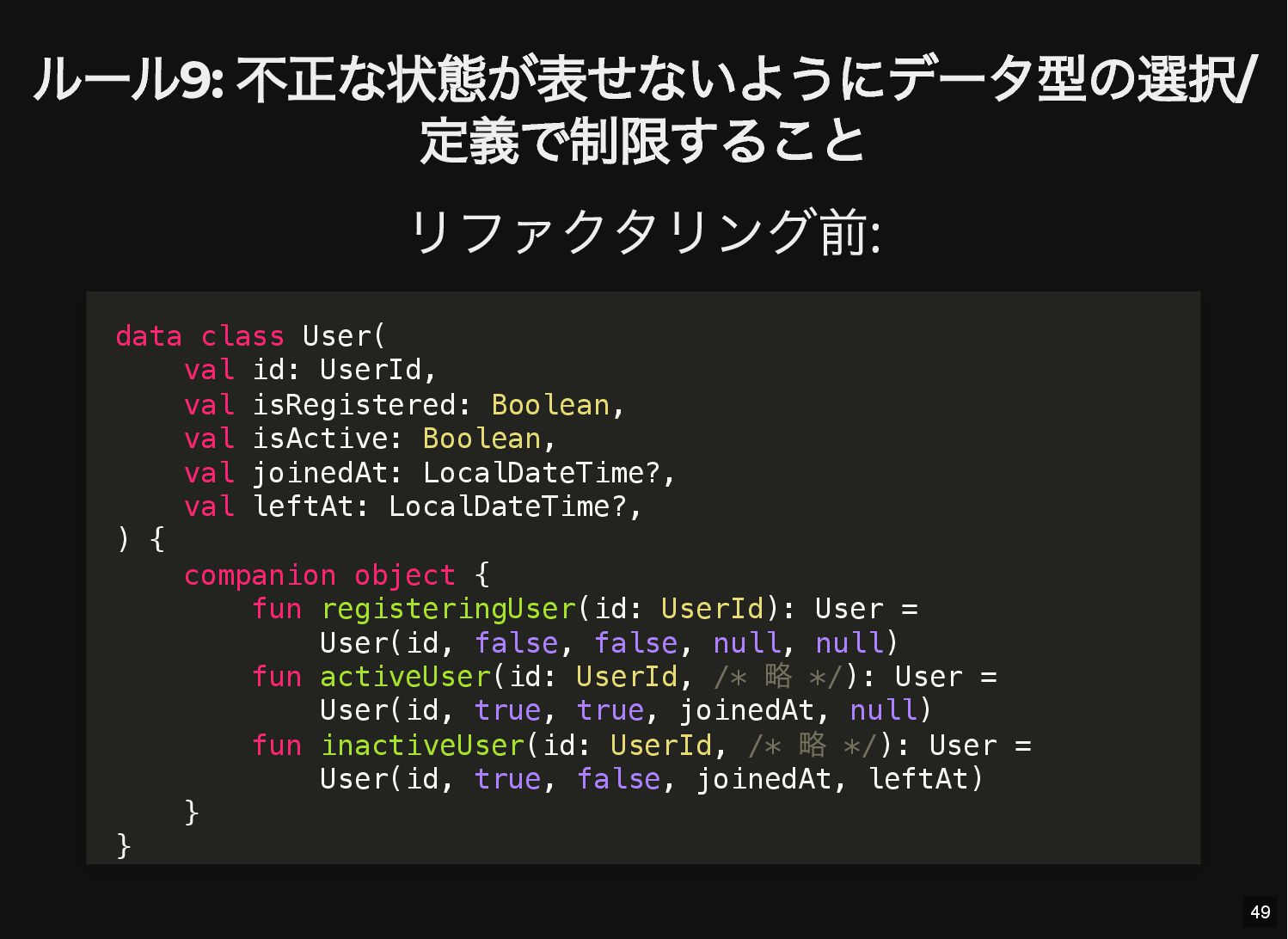 val isRegistered: Boolean, val isActive: Boolean, val joinedAt: LocalDateTime?, val leftAt: LocalDateTime?, ) { companion object { fun registeringUser(id: UserId): User = User(id, false, false, null, null) fun activeUser(id: UserId, /* 略 */): User = User(id, true, true, joinedAt, null) fun inactiveUser(id: UserId, /* 略 */): User = User(id, true, false, joinedAt, leftAt) } } 49