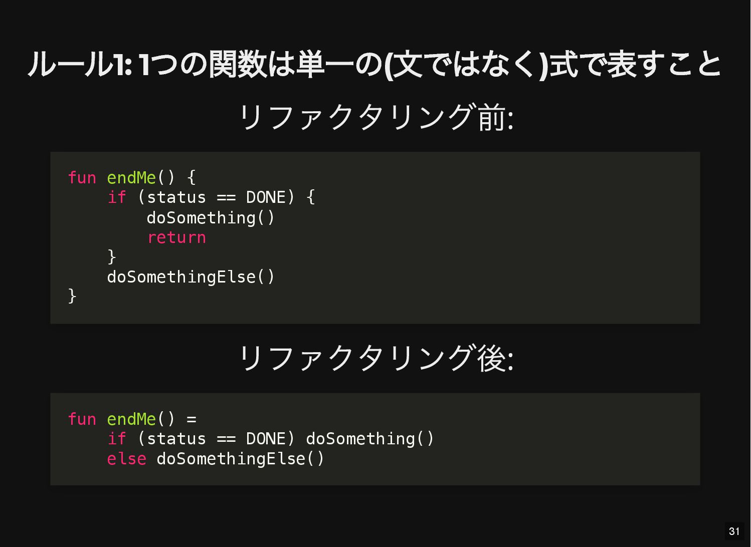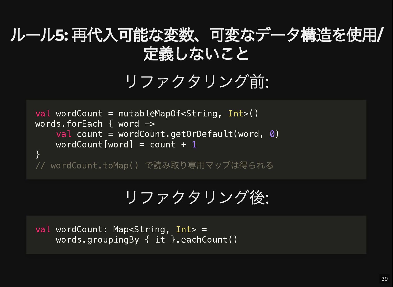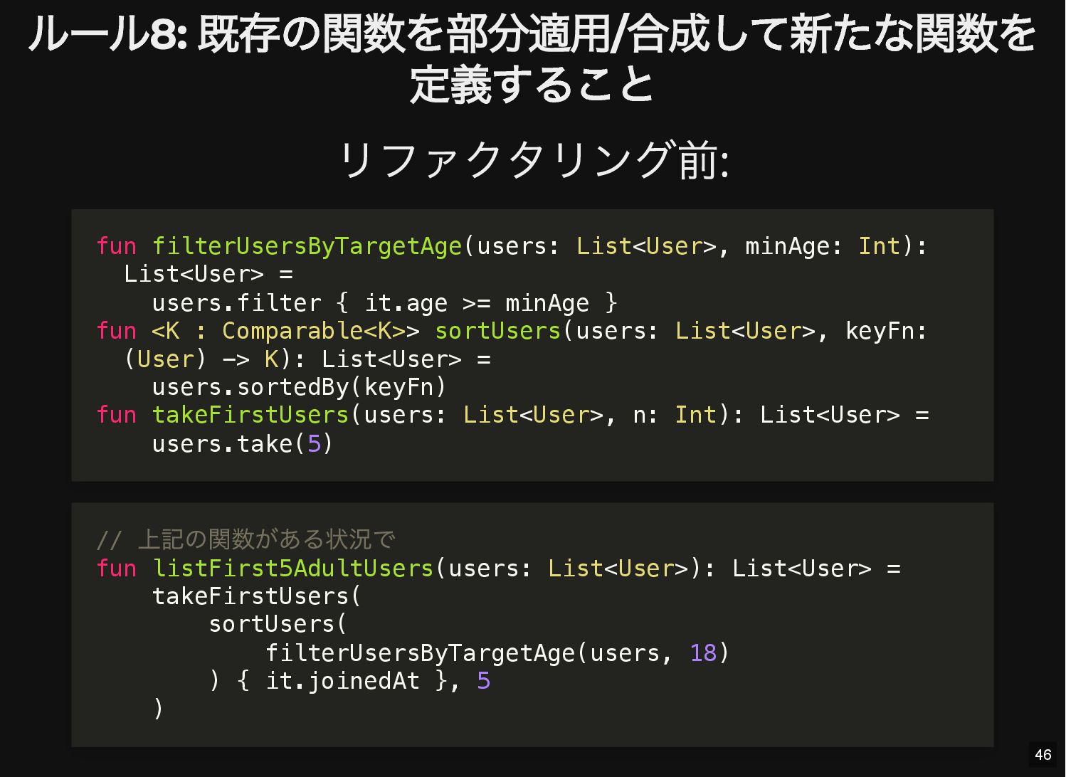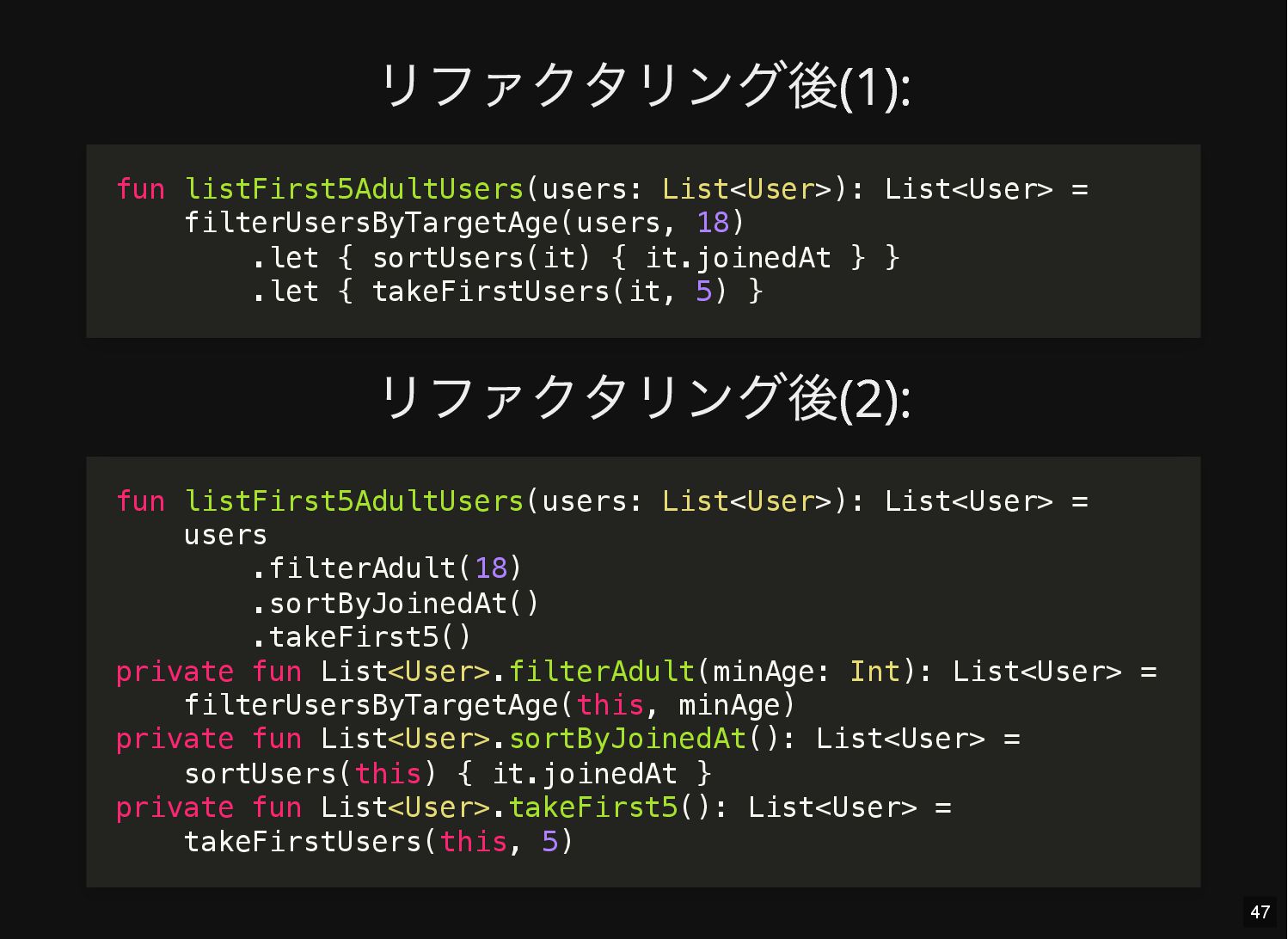 val isRegistered: Boolean, val isActive: Boolean, val joinedAt: LocalDateTime?, val leftAt: LocalDateTime?, ) { companion object { fun registeringUser(id: UserId): User = User(id, false, false, null, null) fun activeUser(id: UserId, /* 略 */): User = User(id, true, true, joinedAt, null) fun inactiveUser(id: UserId, /* 略 */): User = User(id, true, false, joinedAt, leftAt) } } 49