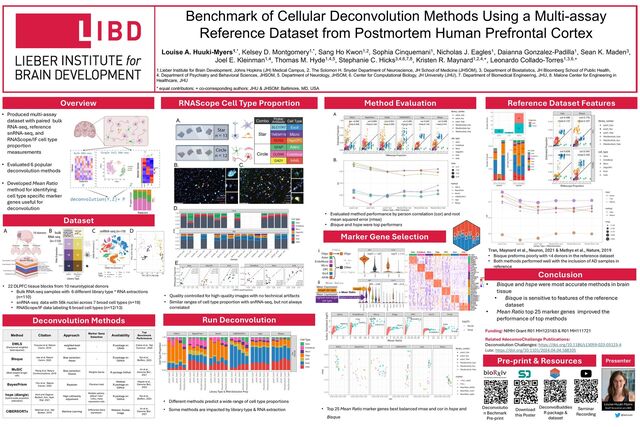from Postmortem Human Prefrontal Cortex Louise A. Huuki-Myers1,*, Kelsey D. Montgomery1,*, Sang Ho Kwon1,2, Sophia Cinquemani1, Nicholas J. Eagles1, Daianna Gonzalez-Padilla1, Sean K. Maden3, Joel E. Kleinman1,4, Thomas M. Hyde1,4,5, Stephanie C. Hicks3,4,6,7,8, Kristen R. Maynard1,2,4,+, Leonardo Collado-Torres1,3,6,+ 1.Lieber Institute for Brain Development, Johns Hopkins (JH) Medical Campus, 2. The Solomon H. Snyder Department of Neuroscience, JH School of Medicine (JHSOM), 3. Department of Biostatistics, JH Bloomberg School of Public Health, 4. Department of Psychiatry and Behavioral Sciences, JHSOM, 5. Department of Neurology, JHSOM, 6. Center for Computational Biology, JH University (JHU), 7. Department of Biomedical Engineering, JHU, 8. Malone Center for Engineering in Healthcare, JHU * equal contributors; + co-corresponding authors; JHU & JHSOM: Baltimore, MD, USA Overview Dataset RNAScope Cell Type Proportion Deconvolution Methods Method Evaluation Marker Gene Selection Reference Dataset Features Pre-print & Resources Method Citation Approach Marker Gene Selection Availability Top Benchmark Performance DWLS (Dampened weighted least-squares) Tsoucas et al, Nature Comm, 2019 weighted least squares - R package on CRAN Cobos et al., Nat Commun., 2020 Bisque Jew et al, Nature Comm, 2020 Bias correction: Assay - R package on GitHub Dai et al., BioRxiv, 2023 MuSiC (Multi-subject Single- cell) Wang et al, Nature Communications, 2019 Bias correction: Source Weights Genes R package GitHub Jin et al., Genome Biol., 2021 BayesPrism Chu et al., Nature Cancer, 2022 Bayesian Pairwise t-test Webtool R package on GitHub Hippen et al., Genome Biol., 2023 hspe (dtangle) (hybrid-scale proportion estimation) Hunt and Gagnon- Bartsch, Ann. Appl. Stat. 2021 High collinearity adjustment Multiple options- default “ratio” 1vALL mean expression ratio R package on GitHub Dai et al., BioRxiv, 2023 CIBERSORTx Newman et al., Nat Biotech, 2019 Machine Learning Differential Gene expression Webtool, Docker Image Jin et al., Genome Biol., 2021 Conclusion Deconvolutio n Bechmark Pre-print Download this Poster DeconvoBuddies R package & dataset Funding: NIMH Grant R01 MH123183 & R01 MH111721 Related #deconvoChallenge Publications: Deconvolution Challenges: https://doi.org/10.1186/s13059-023-03123-4 Lute: https://doi.org/10.1101/2024.04.04.588105 Seminar Recording • 22 DLPFC tissue blocks from 10 neurotypical donors • Bulk RNA-seq samples with 6 different library type * RNA extractions (n=110) • snRNA-seq data with 56k nuclei across 7 broad cell types (n=19) • RNAScope/IF data labeling 6 broad cell types (n=12/13) • Produced multi-assay dataset with paired bulk RNA-seq, reference snRNA-seq, and RNAScope/IF cell type proportion measurements • Evaluated 6 popular deconvolution methods • Developed Mean Ratio method for identifying cell type specific marker genes useful for deconvolution • Different methods predict a wide range of cell type proportions • Some methods are impacted by library type & RNA extraction • Quality controlled for high-quality images with no technical artifacts • Similar ranges of cell type proportion with snRNA-seq, but not always correlated • Evaluated method performance by person correlation (cor) and root mean squared error (rmse) • Bisque and hspe were top performers • Top 25 Mean Ratio marker genes best balanced rmse and cor in hspe and Bisque Tran, Maynard et al., Neuron, 2021 & Mathys et al., Nature, 2019 • Bisque preforms poorly with <4 donors in the reference dataset • Both methods performed well with the inclusion of AD samples in reference Run Deconvolution • Bisque and hspe were most accurate methods in brain tissue • Bisque is sensitive to features of the reference dataset • Mean Ratio top 25 marker genes improved the performance of top methods Presenter Louise Huuki-Myers Staff Scientist at LIBD @lahuuki
