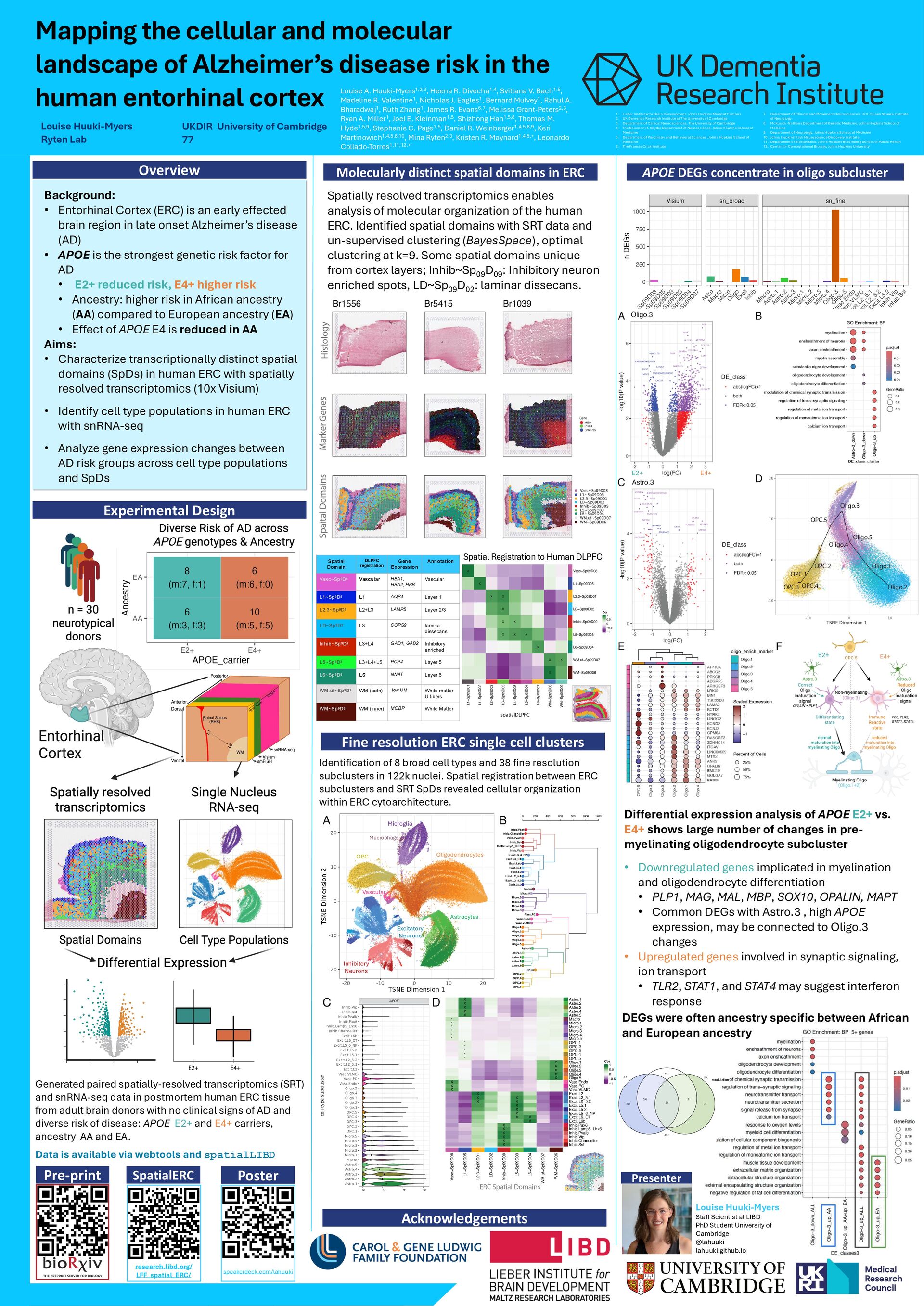 in the human entorhinal cortex Louise Huuki-Myers Ryten Lab UKDIR University of Cambridge 77 Fine resolution ERC single cell clusters APOE DEGs concentrate in oligo subcluster Identification of 8 broad cell types and 38 fine resolution subclusters in 122k nuclei. Spatial registration between ERC subclusters and SRT SpDs revealed cellular organization within ERC cytoarchitecture. Differential expression analysis of APOE E2+ vs. E4+ shows large number of changes in pre- myelinating oligodendrocyte subcluster • Downregulated genes implicated in myelination and oligodendrocyte differentiation • PLP1, MAG, MAL, MBP, SOX10, OPALIN, MAPT • Common DEGs with Astro.3 , high APOE expression, may be connected to Oligo.3 changes • Upregulated genes involved in synaptic signaling, ion transport • TLR2, STAT1, and STAT4 may suggest interferon response modulation Spatially resolved transcriptomics enables analysis of molecular organization of the human ERC. Identified spatial domains with SRT data and un-supervised clustering (BayesSpace), optimal clustering at k=9. Some spatial domains unique from cortex layers; Inhib~Sp 09 D 09 : Inhibitory neuron enriched spots, LD~Sp 09 D 02 : laminar dissecans. Background: • Entorhinal Cortex (ERC) is an early effected brain region in late onset Alzheimer’s disease (AD) • APOE is the strongest genetic risk factor for AD • E2+ reduced risk, E4+ higher risk • Ancestry: higher risk in African ancestry (AA) compared to European ancestry (EA) • Effect of APOE E4 is reduced in AA Aims: • Characterize transcriptionally distinct spatial domains (SpDs) in human ERC with spatially resolved transcriptomics (10x Visium) • Identify cell type populations in human ERC with snRNA-seq • Analyze gene expression changes between AD risk groups across cell type populations and SpDs Experimental Design Overview Spatial Domain DLPFC registration Gene Expression Annotation Vasc~Sp9D8 Vascular HBA1, HBA2, HBB Vascular L1~Sp9D5 L1 AQP4 Layer 1 L2.3~Sp9D1 L2+L3 LAMP5 Layer 2/3 LD~Sp9D2 L3 COPS9 lamina dissecans Inhib~Sp9D9 L3+L4 GAD1, GAD2 Inhibitory enriched L5~Sp9D3 L3+L4+L5 PCP4 Layer 5 L6~Sp9D4 L6 NNAT Layer 6 WM.uf~Sp9D7 WM (both) low UMI White matter U fibers WM~Sp9D6 WM (inner) MOBP White Matter Molecularly distinct spatial domains in ERC A qr code with black and white text AI-generated content may be incorrect. Pre-print Acknowledgements Louise A. Huuki-Myers1,2,3, Heena R. Divecha1,4, Svitlana V. Bach1,5, Madeline R. Valentine1, Nicholas J. Eagles1, Bernard Mulvey1, Rahul A. Bharadwaj1, Ruth Zhang1, James R. Evans6,7, Melissa Grant-Peters2,3, Ryan A. Miller1, Joel E. Kleinman1,5, Shizhong Han1,5,8, Thomas M. Hyde1,5,9, Stephanie C. Page1,5, Daniel R. Weinberger1,4,5,8,9, Keri Martinowich1,4,5,8,10, Mina Ryten2,3, Kristen R. Maynard1,4,5,+, Leonardo Collado-Torres1,11,12,+ 1. Lieber Institute for Brain Development, Johns Hopkins Medical Campus 2. UK Dementia Research Institute at The University of Cambridge 3. Department of Clinical Neurosciences, The University of Cambridge 4. The Solomon H. Snyder Department of Neuroscience, Johns Hopkins School of Medicine 5. Department of Psychiatry and Behavioral Sciences, Johns Hopkins School of Medicine 6. The Francis Crick Institute 7. Department of Clinical and Movement Neurosciences, UCL Queen Square Institute of Neurology 8. McKusick-Nathans Department of Genetic Medicine, Johns Hopkins School of Medicine 9. Department of Neurology, Johns Hopkins School of Medicine 10. Johns Hopkins Kavli Neuroscience Discovery Institute 11. Department of Biostatistics, Johns Hopkins Bloomberg School of Public Health 12. Center for Computational Biology, Johns Hopkins University DEGs were often ancestry specific between African and European ancestry Spatial Registration to Human DLPFC SpatialERC research.libd.org/ LFF_spatial_ERC/ Poster speakerdeck.com/lahuuki Generated paired spatially-resolved transcriptomics (SRT) and snRNA-seq data in postmortem human ERC tissue from adult brain donors with no clinical signs of AD and diverse risk of disease: APOE E2+ and E4+ carriers, ancestry AA and EA. Data is available via webtools and spatialLIBD Oligodendrocytes Microglia OPC Vascular Astrocytes Macrophage Excitatory Neurons Inhibitory Neurons E4+ E2+ Presenter Louise Huuki-Myers Staff Scientist at LIBD PhD Student University of Cambridge @lahuuki lahuuki.github.io