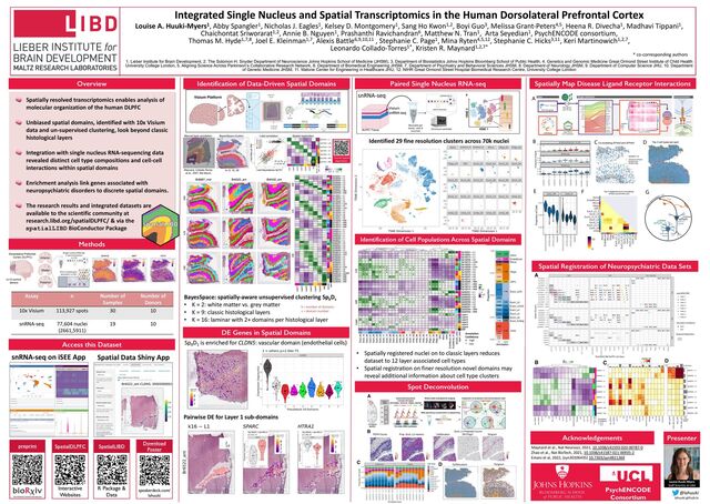 Prefrontal Cortex Louise A. Huuki-Myers1, Abby Spangler1, Nicholas J. Eagles1, Kelsey D. Montgomery1, Sang Ho Kwon1,2, Boyi Guo3, Melissa Grant-Peters4,5, Heena R. Divecha1, Madhavi Tippani1, Chaichontat Sriworarat1,2, Annie B. Nguyen1, Prashanthi Ravichandran6, Matthew N. Tran1, Arta Seyedian1, PsychENCODE consortium, Thomas M. Hyde1,7,8, Joel E. Kleinman1,7, Alexis Battle6,9,10,11 , Stephanie C. Page1, Mina Ryten4,5,12, Stephanie C. Hicks3,11, Keri Martinowich1,2,7, Leonardo Collado-Torres1*, Kristen R. Maynard1,2,7* 1. Lieber Institute for Brain Development, 2. The Solomon H. Snyder Department of Neuroscience Johns Hopkins School of Medicine (JHSM), 3. Department of Biostatistics Johns Hopkins Bloomberg School of Public Health, 4. Genetics and Genomic Medicine Great Ormond Street Institute of Child Health University College London, 5. Aligning Science Across Parkinson’s Collaborative Research Network, 6. Department of Biomedical Engineering JHSM, 7. Department of Psychiatry and Behavioral Sciences JHSM, 8. Department of Neurology JHSM, 9. Department of Computer Science JHU, 10. Department of Genetic Medicine JHSM, 11. Malone Center for Engineering in Healthcare JHU, 12. NIHR Great Ormond Street Hospital Biomedical Research Centre, University College London Overview Acknowledgements Identification of Cell Populations Across Spatial Domains Methods DE Genes in Spatial Domains Maynard et al., Nat Neurosci, 2021, 10.1038/s41593-020-00787-0 Zhao et al., Nat BioTech, 2021, 10.1038/s41587-021-00935-2 Emani et al, 2022, (syn30106435) 10.7303/syn4921369 snRNA-seq Identification of Data-Driven Spatial Domains Paired Single Nucleus RNA-seq Sp9 D1 is enriched for CLDN5: vascular domain (endothelial cells) Pairwise DE for Layer 1 sub-domains • Spatially registered nuclei on to classic layers reduces dataset to 12 layer associated cell types • Spatial registration on finer resolution novel domains may reveal additional information about cell type clusters k = number of domains s = domain number Identified 29 fine resolution clusters across 70k nuclei Access this Dataset Assay n Number of Samples Number of Donors 10x Visium 113,927 spots 30 10 snRNA-seq 77,604 nuclei (2661,5911) 19 10 Spatial Data Shiny App snRNA-seq on iSEE App BayesSpace: spatially-aware unsupervised clustering Spk Ds • K = 2: white matter vs. grey matter • K = 9: classic histological layers • K = 16: laminar with 2+ domains per histological layer 1 2 logcounts min > 0 CLDN5 1 2 3 logcounts min > 0 1 2 3 logcounts min > 0 ! Spatially resolved transcriptomics enables analysis of molecular organization of the human DLPFC ! Unbiased spatial domains, identified with 10x Visium data and un-supervised clustering, look beyond classic histological layers ! Integration with single nucleus RNA-sequencing data revealed distinct cell type compositions and cell-cell interactions within spatial domains ! Enrichment analysis link genes associated with neuropsychiatric disorders to discrete spatial domains. ! The research results and integrated datasets are available to the scientific community at research.libd.org/spatialDLPFC/ & via the spatialLIBD BioConductor Package preprint SpatialDLPFC Interactive Websites SpatialLIBD R Package & Data Download Poster speakerdeck.com/ lahuuki Annotation Confidence X - high * - low Cell2location Tangram Sp09D01 ~ L1 Sp09D02 ~ L1 Sp09D03 ~ L2 Sp09D05 ~ L3 Sp09D08 ~ L4 Sp09D04 ~ L5 Sp09D07 ~ L6 Sp09D06 ~ WM Sp09D09 ~ WM Sp09D01 ~ L1 Sp09D02 ~ L1 Sp09D03 ~ L2 Sp09D05 ~ L3 Sp09D08 ~ L4 Sp09D04 ~ L5 Sp09D07 ~ L6 Sp09D06 ~ WM Sp09D09 ~ WM 0.00 0.25 0.50 0.75 1.00 Annotated Layer Proportion of Counts Cell Type Astro EndoMural Micro Oligo OPC Excit_L2_3 Excit_L3 Excit_L3_4_5 Excit_L4 Excit_L5 Excit_L5_6 Excit_L6 Inhib Spot Deconvolution Astro EndoMural Micro Oligo OPC Excit_L2/3 Excit_L3 Excit_L3/4/5 Excit_L4 Excit_L5 Excit_L5/6 Excit_L6 Inhib Astro EndoMural Micro Oligo OPC Excit_L2/3 Excit_L3 Excit_L3/4/5 Excit_L4 Excit_L5 Excit_L5/6 Excit_L6 Inhib Cell2location Tangram Spatial Registration of Neuropsychiatric Data Sets Spatially Map Disease Ligand Receptor Interactions PsychENCODE Consortium * co-corresponding authors Presenter Louise Huuki-Myers Staff Scientist at LIBD @lahuuki lahuuki.github.io Tutorial: Spatial Registration C D