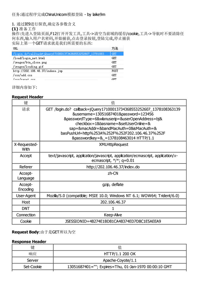 00:00:10 GMT Set-Cookie checkbox=""; Expires=Thu, 01-Jan-1970 00:00:10 GMT Content-Type text/html;charset=UTF-8 Transfer-Encoding chunked Date Mon, 02 Sep 2013 07:54:23 GMT Response Body j Q u e r y 1 7 1 0 0 0 1 3 7 3 4 3 6 8 5 5 3 2 5 2 6 0 7 _ 1 3 7 8 1 0 8 3 6 3 1 3 9 ( { ' r e s u l t ' : { " b a s N a m e " : " " , " s e s s i o n I d " : " " , " u s e r i n f o I d " : " " , " u s e r o n l i n e I d " : " 0 4 c d d d 2 5 4 0 c f 0 f e a 0 1 4 0 d d a a 5 b 8 5 1 f a f " , " k e e p A l i v e T i m e " : " 3 0 0 0 0 0 " , " u s e r N a m e " : " 1 3 0 5 1 6 8 7 4 0 1 " , " u s e r N a m e D o m a i n " : " 1 3 0 5 1 6 8 7 4 0 1 @ w l a n . b j . c h i n a u n i c o m . c n " , " i s L o g i n " : " t r u e " , " m e s s a g e " : " s u c c e s s " , " r o a m i n g M e s s a g e " : " " , " s e t U s e r O n l i n e " : " 0 " , " u s e r O p e n A d r e s s " : " 1 1 " , " t i m e l o n g " : " " , " o p e n A d r e s s " : " " , " s a p " : " " , " w l a n u s e r i p " : " " , " c l i e n t A u t h T y p e " : " " , " m a c A d d r " : " " , " l o g o u t C o o r d i n a t e " : " " , " d i r e c t o r y " : " " , " f s t y p e " : " " , " c l i e n t T y p e " : " 2 " , " i s M a c A u t h " : " " , " b a s P u s h U r l " : " h t t p : / / 2 0 2 . 1 0 6 . 4 6 . 3 7 / " , " p z P a g e " : " " , " p z P r e f i x " : " " , " p z D o m a i n " : " " , " s t a r t T i m e " : " 1 5 : 5 4 : 2 3 " , " l e f t P a t h " : " " , " v l a n i d " : " " , " o k U r l " : " h t t p : / / 2 0 2 . 1 0 6 . 3 3 . 1 5 8 / w l a n " , " f o r m " : " " , " c a r r i e r " : " " , " h o m e C o u n t r y " : " " , " h o m e C a r r i e r " : " " , " p r e f i x " : " " , " s u f f i x " : " " , " l o g i n T i m e " : " 2 0 1 3 - 0 9 - 0 2 0 3 : 5 4 : 2 3 " , " c a r r i e r N a m e " : " " , " a c c o u n t T y p e " : " " , " a c c o u n t " : " 1 3 0 5 1 6 8 7 4 0 1 " } } ) Cookie 方向 键 值 过期时间 域 路 径 安 全 仅 HTTP 已发 送 JSESSIONID 48274E1BD81CA48374ED7D8C1E5AEEA9 已接 收 13051687401 "" Thu, 01-Jan-1970 00:00:10 GMT 否 否 已接 收 user_name "" Thu, 01-Jan-1970 00:00:10 GMT 否 否 已接 收 OpenAdress "" Thu, 01-Jan-1970 00:00:10 GMT 否 否 已接 收 checkbox "" Thu, 01-Jan-1970 00:00:10 GMT 否 否 (2) 分析各参数含义 jquery后面跟的那串数字可能无法模拟,暂时考虑就用原来的 主要是cookie JSESSIONID=48274E1BD81CA48374ED7D8C1E5AEEA9要搞清楚来历 结论是cookie在不手动清除的情况下是不会改变的,当前cookie: JSESSIONID=4003A8C5A8DE955BABAC66B0A6405C02 以后用这个应该就可以 为了保险起见可以把这几个cookie也写上 方向 键 值 已发送 13051687401 123456 已发送 user_name 13051687401 已发送 OpenAdress bj 已发送 checkbox true