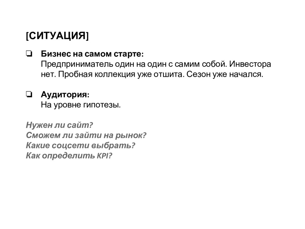 с самим собой. Инвестора нет. Пробная коллекция уже отшита. Сезон уже начался. ❏ Аудитория: На уровне гипотезы. Нужен ли сайт? Сможем ли зайти на рынок? Какие соцсети выбрать? Как определить KPI?