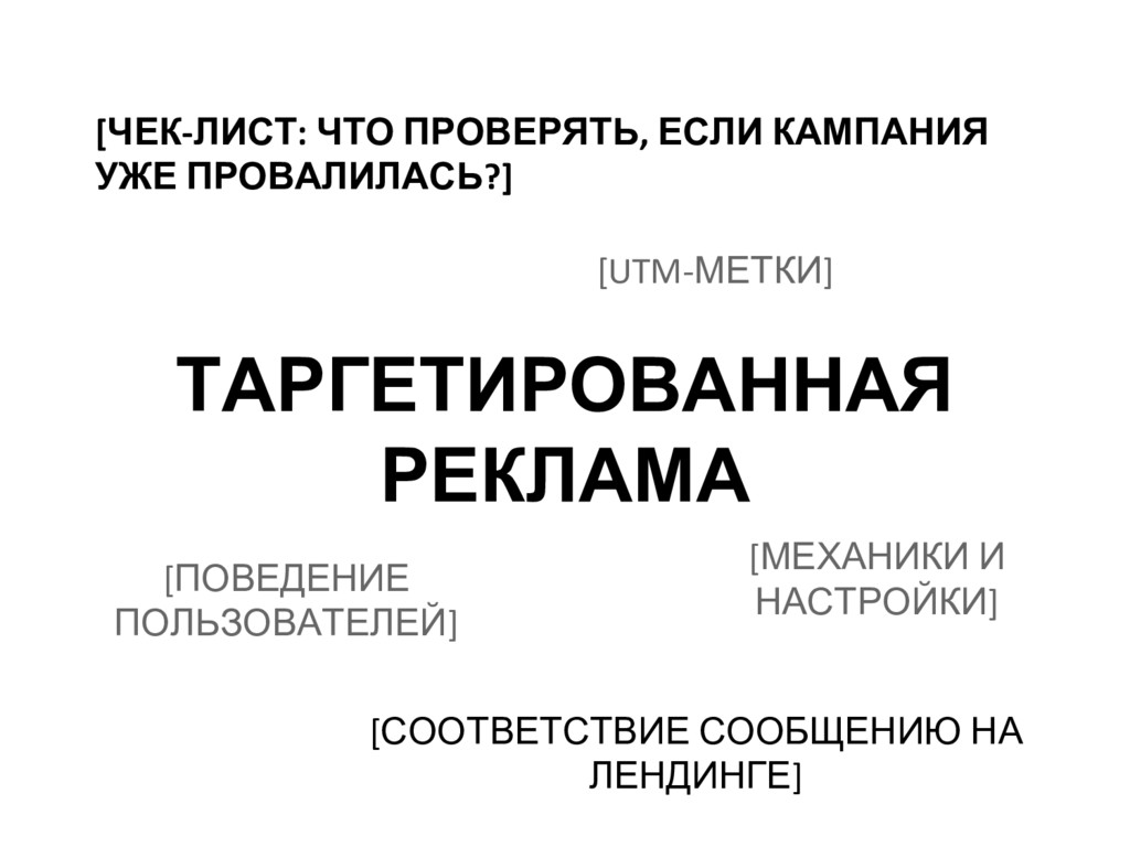 ❏ Качество продукта: ❏ Понятно ли, чем мы отличаемся от конкурентов? ❏ Готов ли наш покупатель заплатить столько, сколько мы просим? ❏ Качество контента в социальных сетях: ❏ Говорим о том, что интересно целевой аудитории? ❏ Взращиваем ли при этом интерес к собственному продукту? ❏ Сколько клише на квадратный сантиметр? ❏ Качество таргетированной рекламы: ❏ Как ведет себя целевая аудитория на сайте (по веб-аналитике)? Измеряли все utm-метками? Тестировали больше 20 (50, 100) объявлений? ❏ Рекламные сообщения отвечают на боль целевой аудитории? ❏ Качество лендинга: ❏ Можно ли понять, о чем речь, за 5 секунд? ❏ Тексты логичны и кратки? Сколько клише на квадратный сантиметр? ❏ Не забыли ли важные факты, цифры, reasons to believe? ❏ Форма заявки короткая, а CTA – про боль целевой аудитории? ... и еще примерно три десятка таких вопросов.