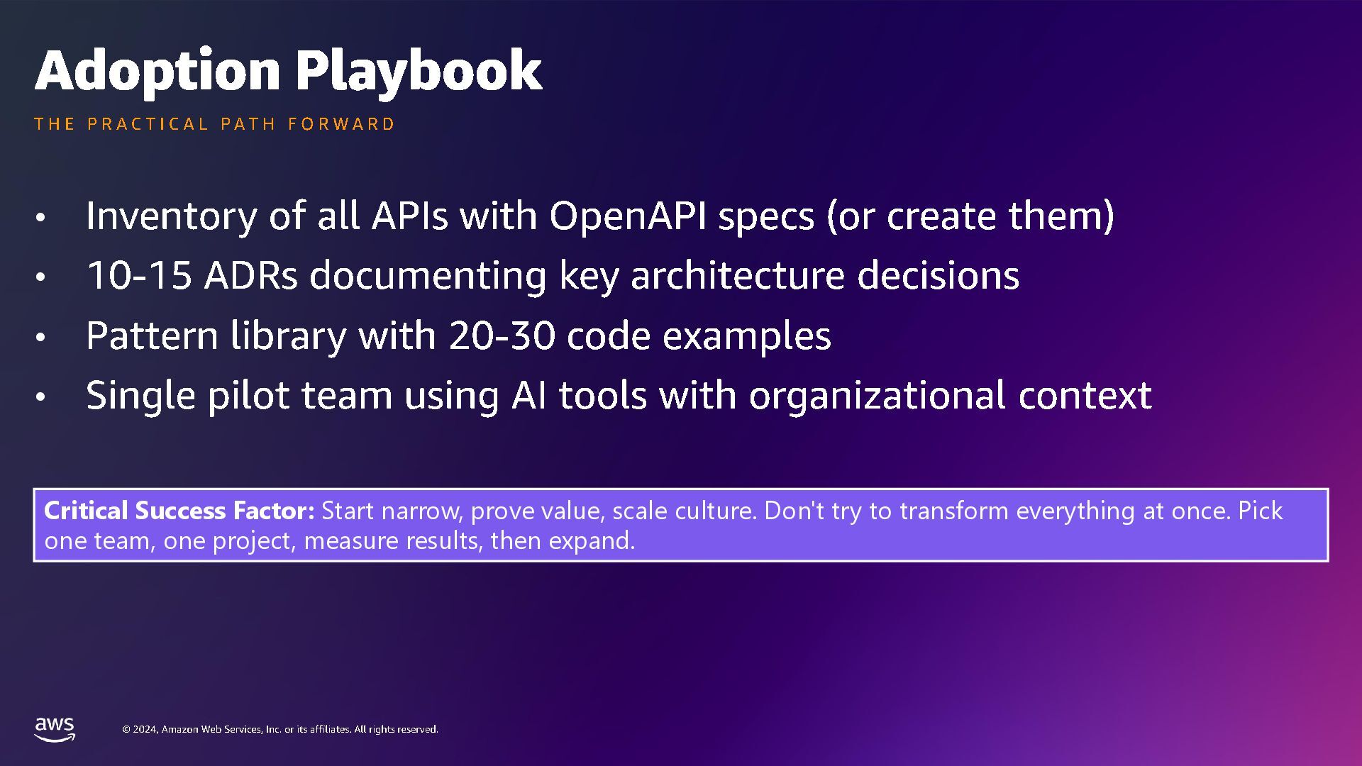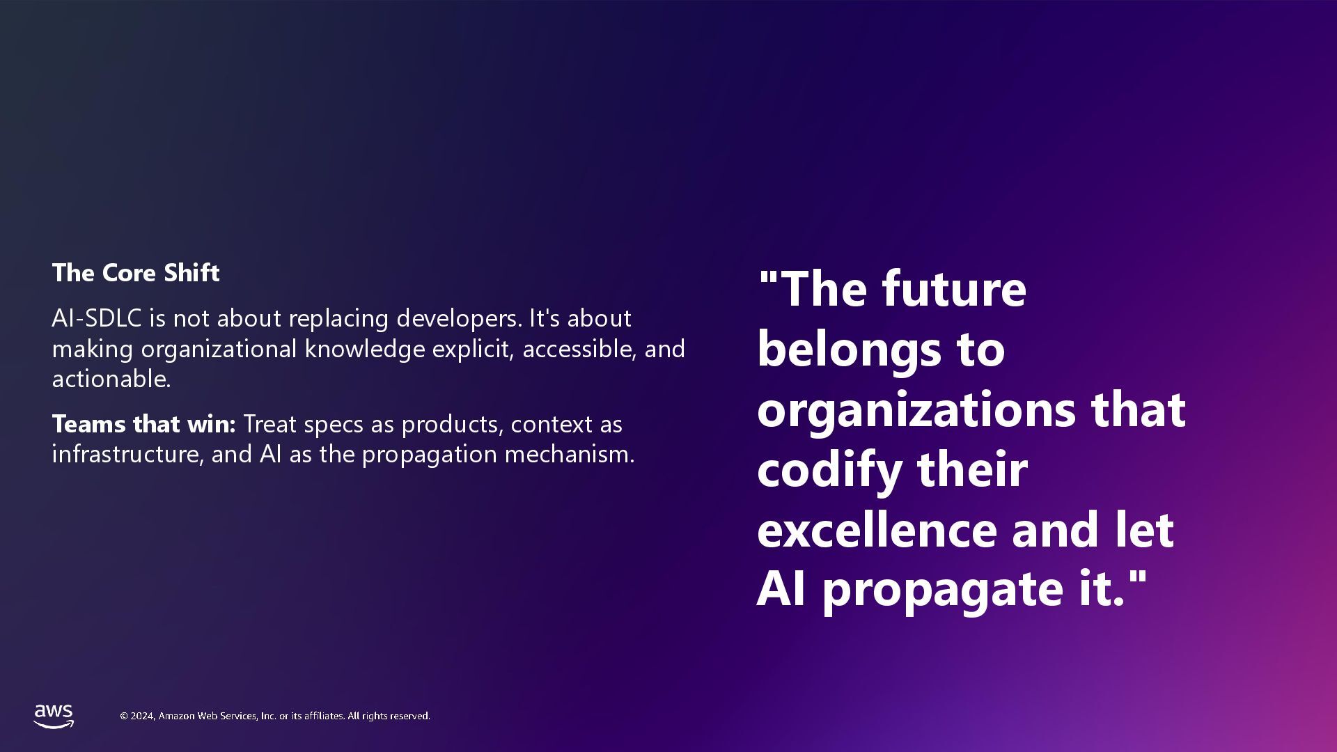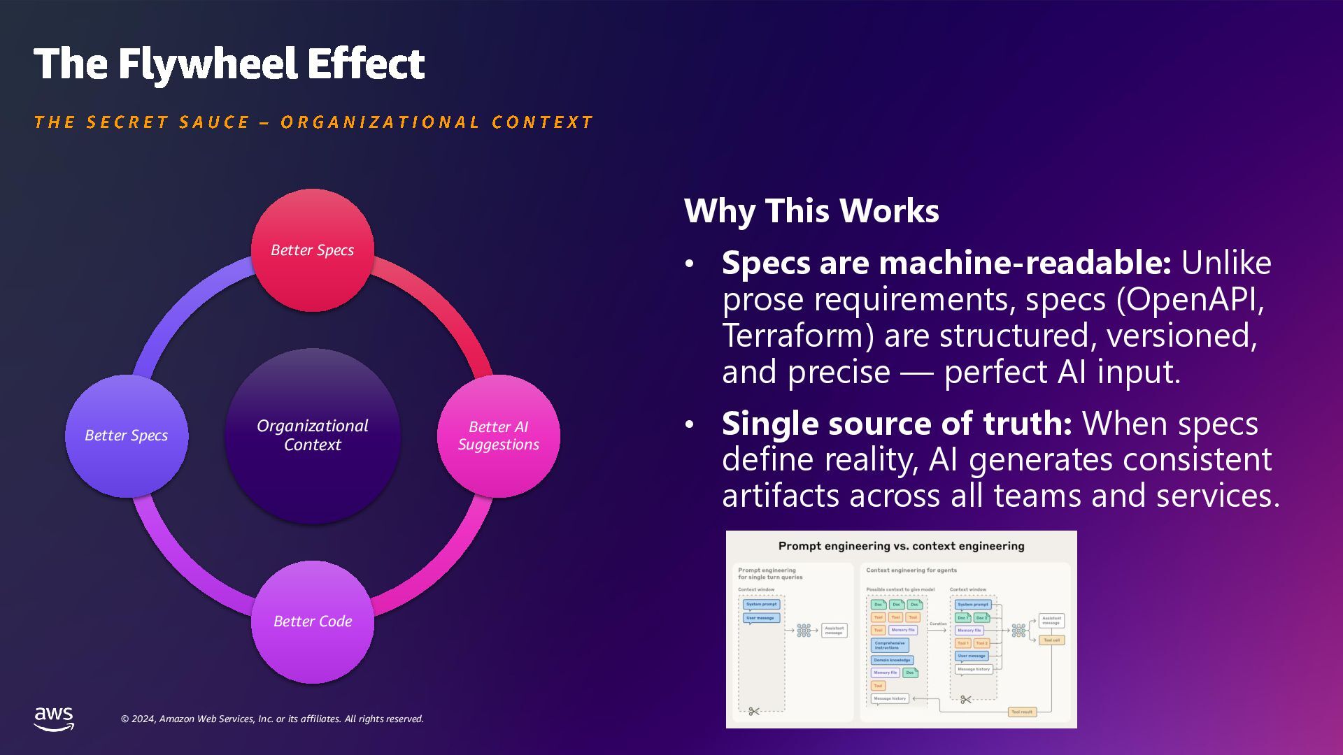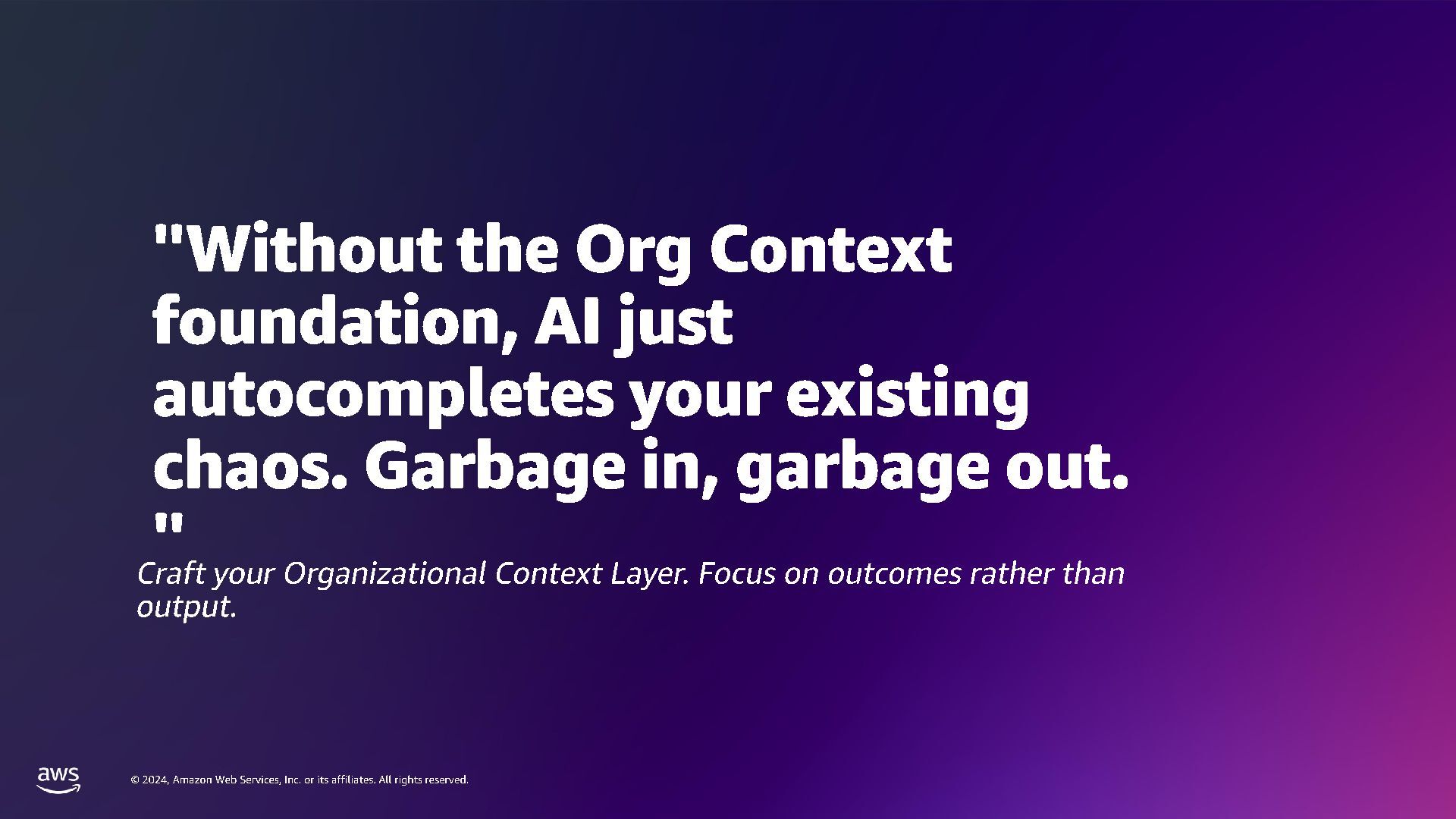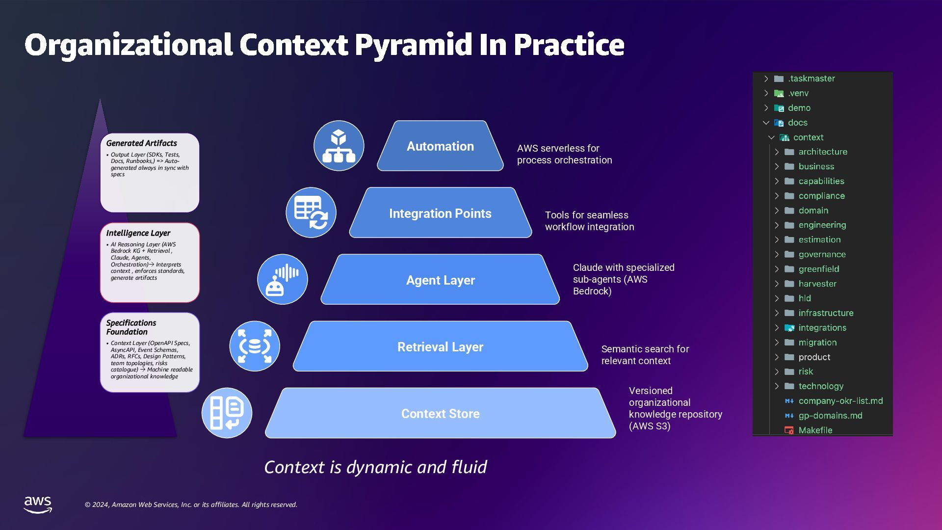 rights reserved. Organizational Context Pyramid In Practice Generated Artifacts • Output Layer (SDKs, Tests, Docs, Runbooks,) => Auto- generated always in sync with specs Intelligence Layer • AI Reasoning Layer (AWS Bedrock KG + Retrieval , Claude, Agents, Orchestration)→ Interprets context , enforces standards, generate artifacts Specifications Foundation • Context Layer (OpenAPI Specs, AsyncAPI, Event Schemas, ADRs, RFCs, Design Patterns, team topologies, risks catalogue) → Machine readable organizational knowledge Context is dynamic and fluid Automation AWS serverless for process orchestration Integration Points Tools for seamless workflow integration Agent Layer Claude with specialized sub-agents (AWS Bedrock) Retrieval Layer Semantic search for relevant context Context Store Versioned organizational knowledge repository (AWS S3)