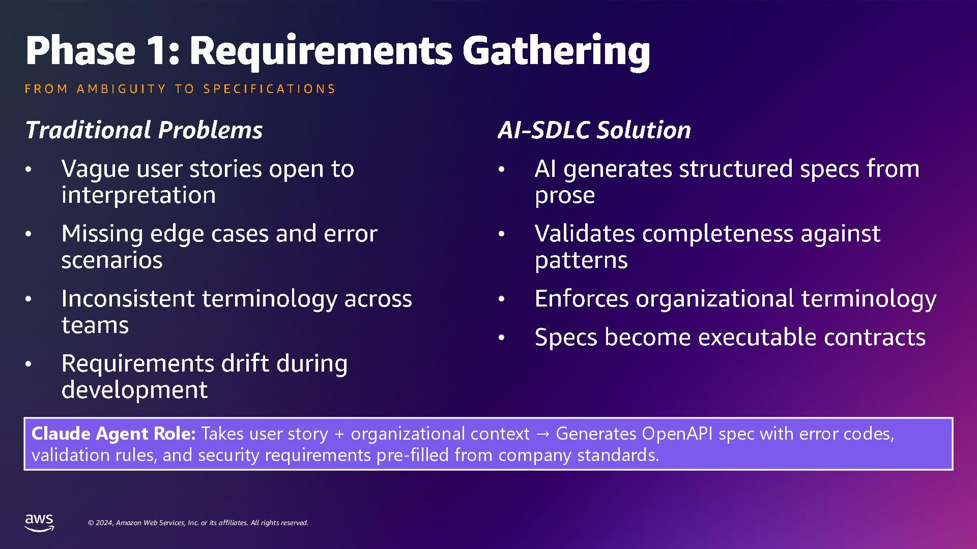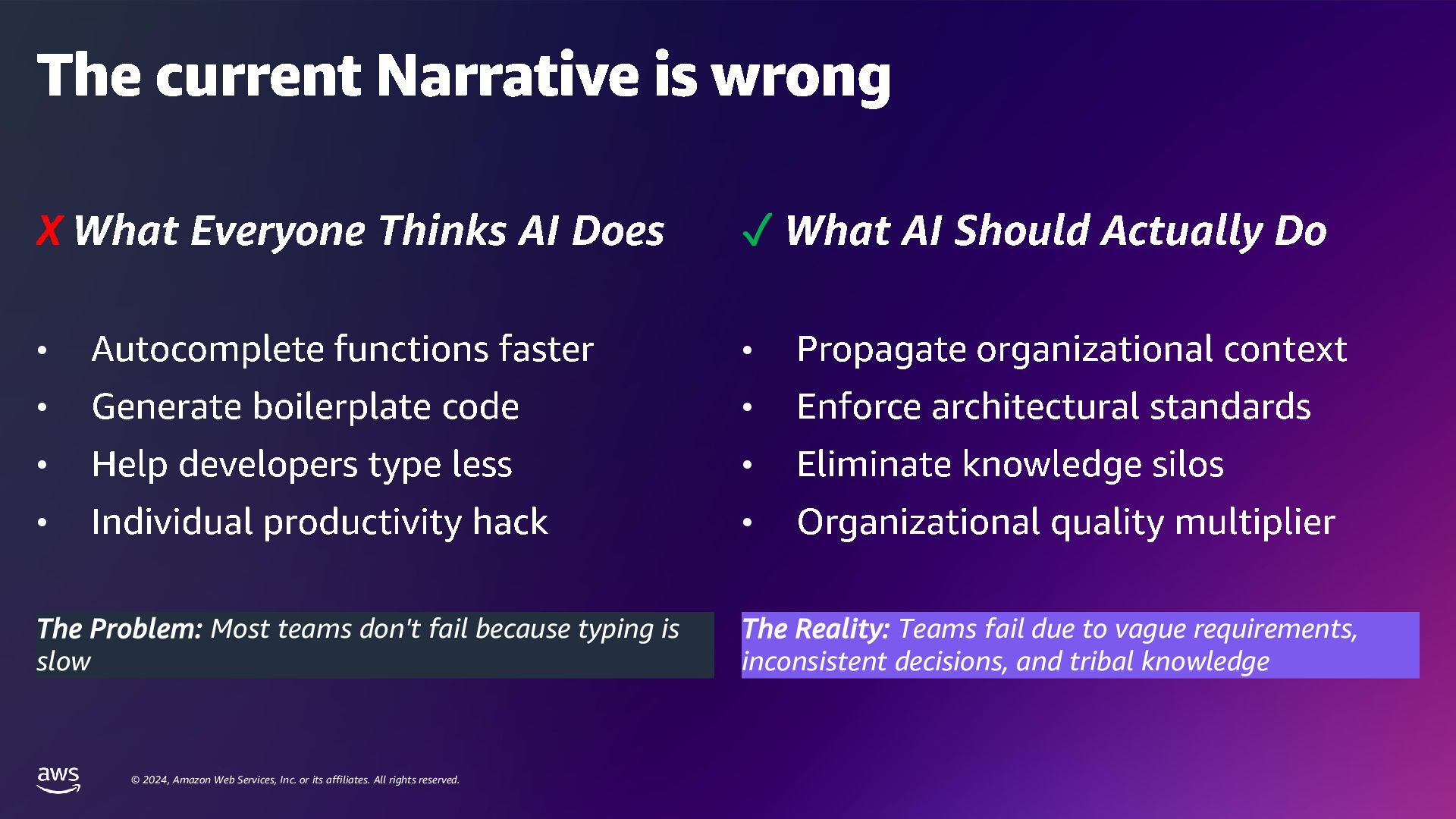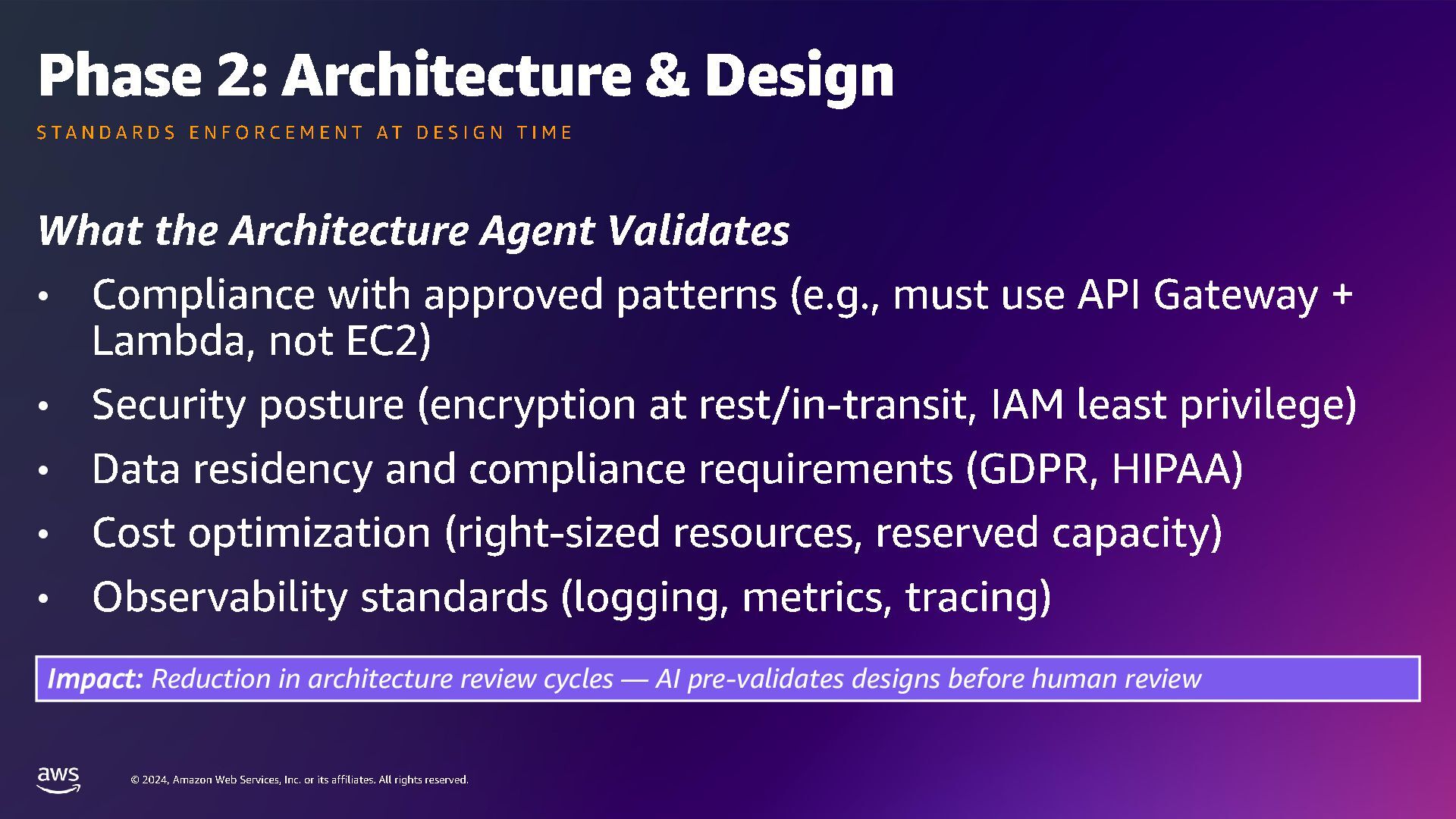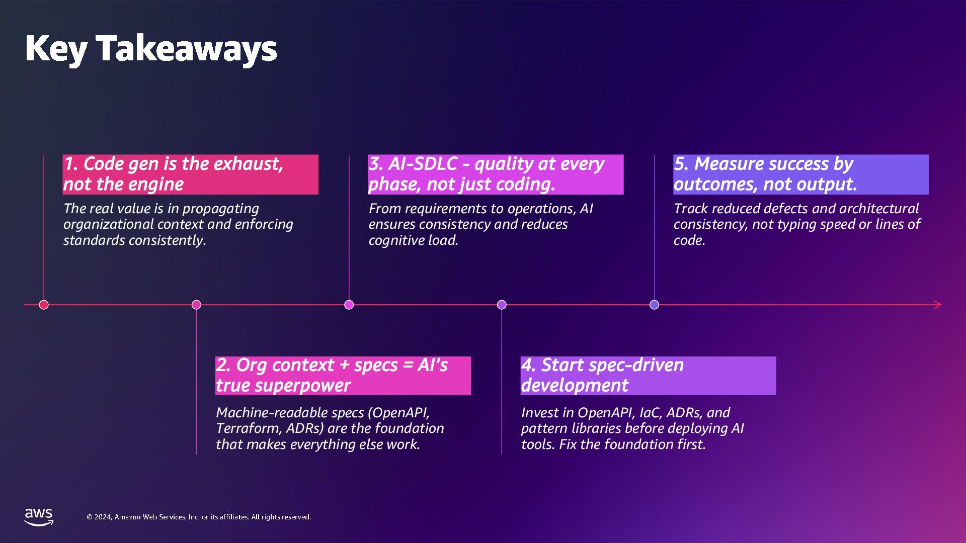 rights reserved. Organizational Context Pyramid In Practice Generated Artifacts • Output Layer (SDKs, Tests, Docs, Runbooks,) => Auto- generated always in sync with specs Intelligence Layer • AI Reasoning Layer (AWS Bedrock KG + Retrieval , Claude, Agents, Orchestration)→ Interprets context , enforces standards, generate artifacts Specifications Foundation • Context Layer (OpenAPI Specs, AsyncAPI, Event Schemas, ADRs, RFCs, Design Patterns, team topologies, risks catalogue) → Machine readable organizational knowledge Context is dynamic and fluid Automation AWS serverless for process orchestration Integration Points Tools for seamless workflow integration Agent Layer Claude with specialized sub-agents (AWS Bedrock) Retrieval Layer Semantic search for relevant context Context Store Versioned organizational knowledge repository (AWS S3)