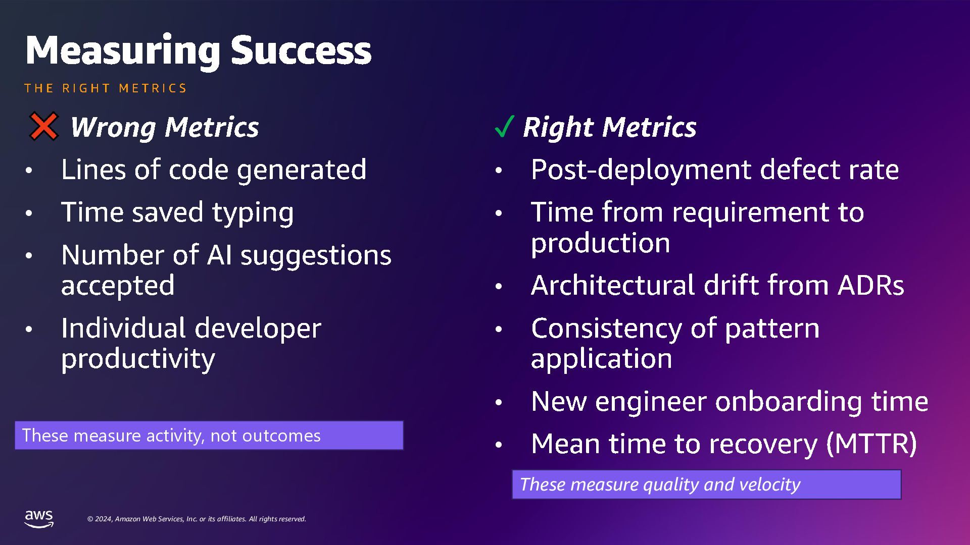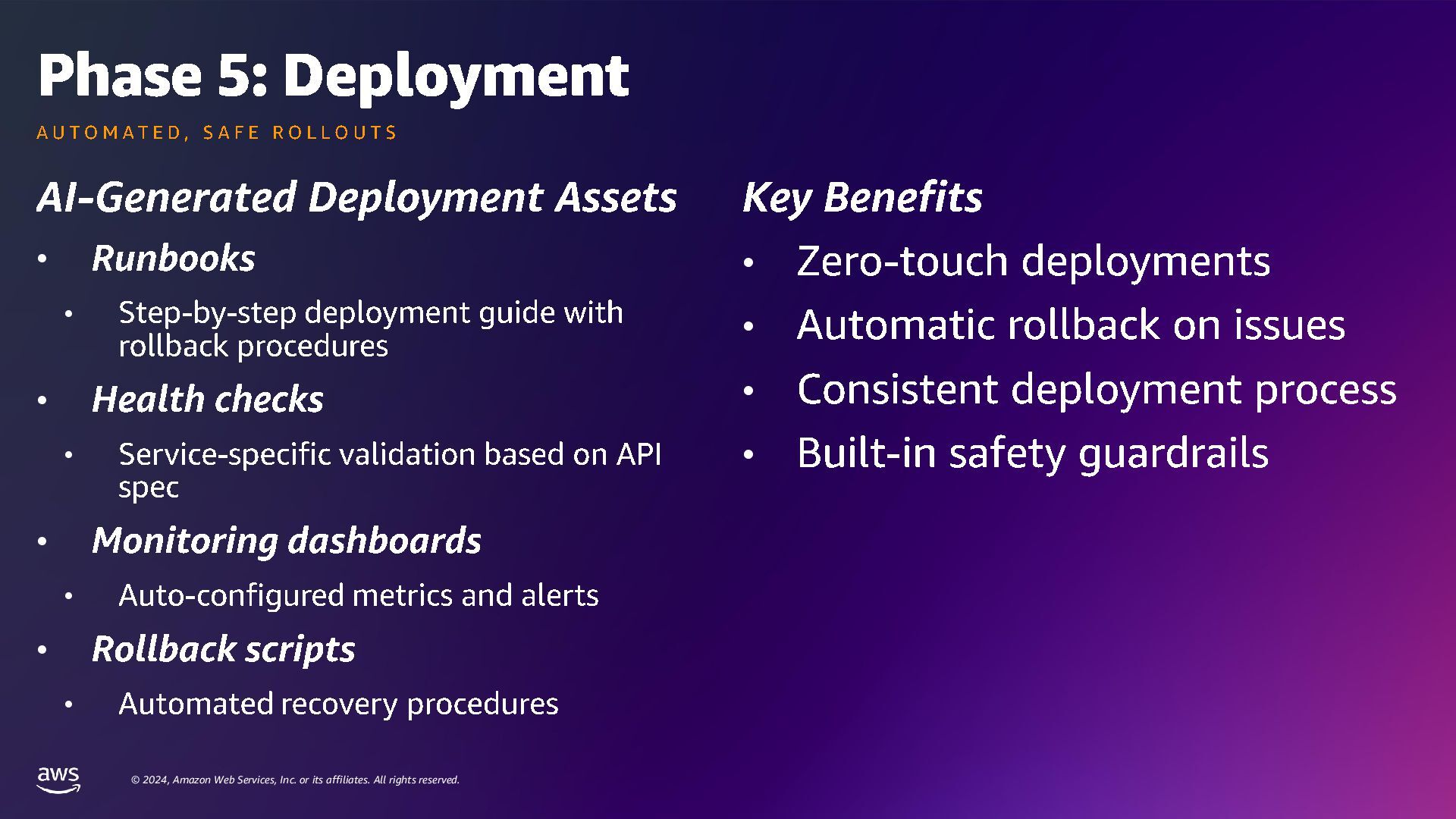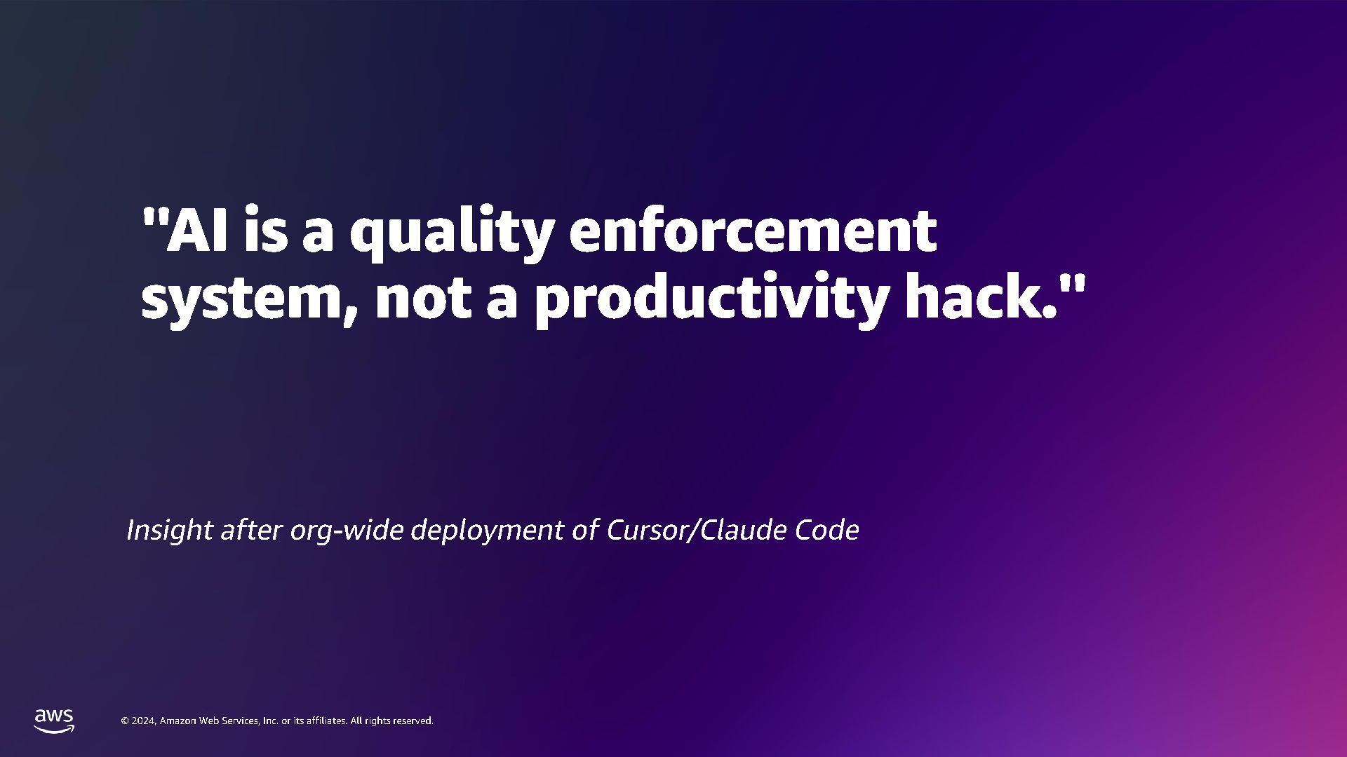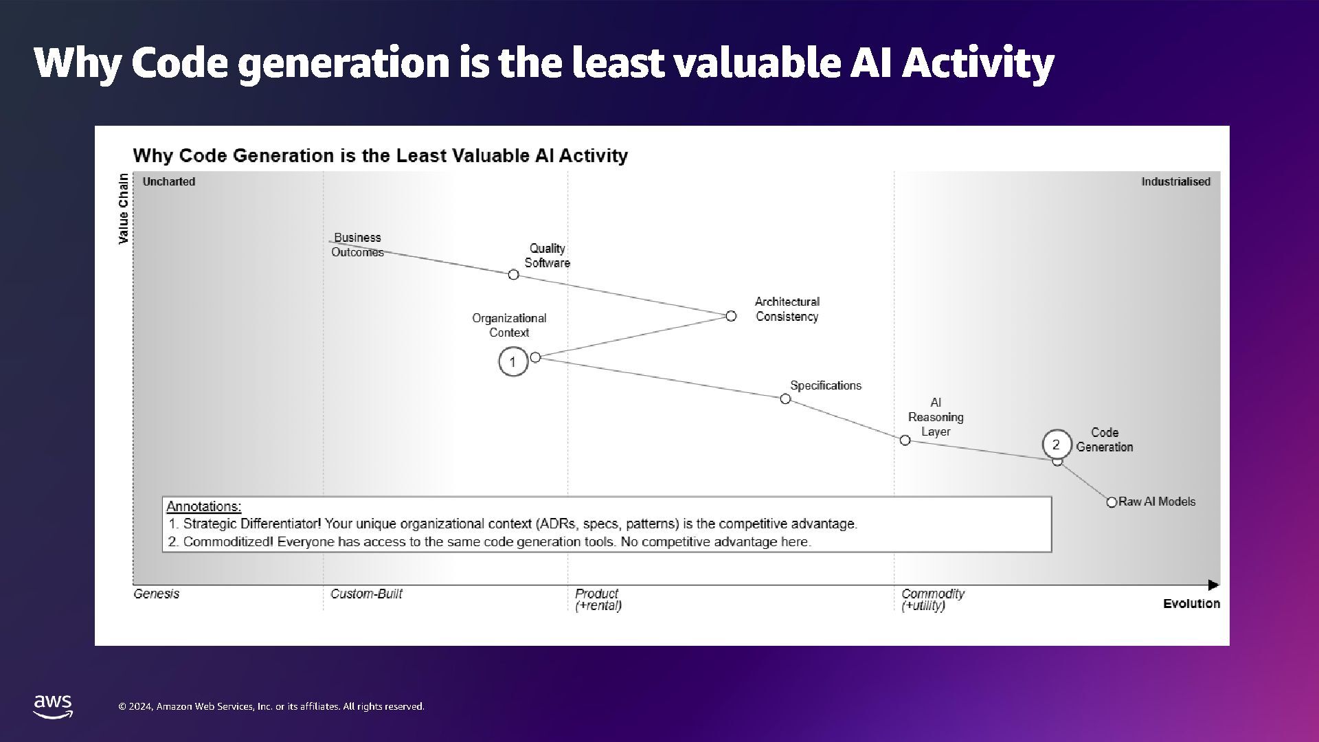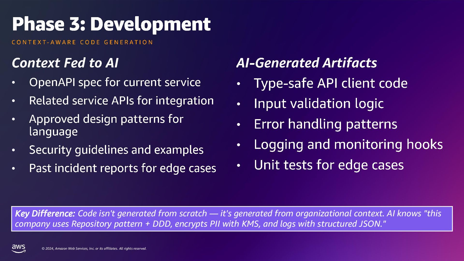 rights reserved. Organizational Context Pyramid In Practice Generated Artifacts • Output Layer (SDKs, Tests, Docs, Runbooks,) => Auto- generated always in sync with specs Intelligence Layer • AI Reasoning Layer (AWS Bedrock KG + Retrieval , Claude, Agents, Orchestration)→ Interprets context , enforces standards, generate artifacts Specifications Foundation • Context Layer (OpenAPI Specs, AsyncAPI, Event Schemas, ADRs, RFCs, Design Patterns, team topologies, risks catalogue) → Machine readable organizational knowledge Context is dynamic and fluid Automation AWS serverless for process orchestration Integration Points Tools for seamless workflow integration Agent Layer Claude with specialized sub-agents (AWS Bedrock) Retrieval Layer Semantic search for relevant context Context Store Versioned organizational knowledge repository (AWS S3)