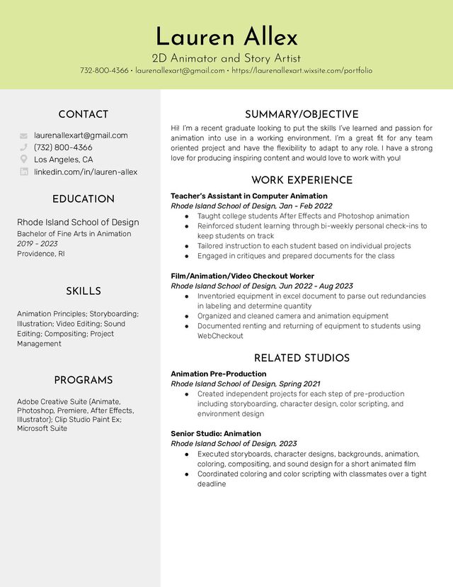 [email protected] (732) 800-4366 Los Angeles, CA linkedin.com/in/lauren-allex EDUCATION Rhode Island School of Design Bachelor of Fine Arts in Animation 2019 - 2023 Providence, RI SKILLS Animation Principles; Storyboarding; Illustration; Video Editing; Sound Editing; Compositing; Project Management PROGRAMS Adobe Creative Suite (Animate, Photoshop, Premiere, After Effects, Illustrator); Clip Studio Paint Ex; Microsoft Suite SUMMARY/OBJECTIVE Hi! I’m a recent graduate looking to put the skills I’ve learned and passion for animation into use in a working environment. I’m a great fit for any team oriented project and have the flexibility to adapt to any role. I have a strong love for producing inspiring content and would love to work with you! WORK EXPERIENCE Teacher’s Assistant in Computer Animation Rhode Island School of Design, Jan - Feb 2022 • Taught college students After Effects and Photoshop animation • Reinforced student learning through bi-weekly personal check-ins to keep students on track • Tailored instruction to each student based on individual projects • Engaged in critiques and prepared documents for the class Film/Animation/Video Checkout Worker Rhode Island School of Design, Jun 2022 - Aug 2023 • Inventoried equipment in excel document to parse out redundancies in labeling and determine quantity • Organized and cleaned camera and animation equipment • Documented renting and returning of equipment to students using WebCheckout RELATED STUDIOS Animation Pre-Production Rhode Island School of Design, Spring 2021 • Created independent projects for each step of pre-production including storyboarding, character design, color scripting, and environment design Senior Studio: Animation Rhode Island School of Design, 2023 • Executed storyboards, character designs, backgrounds, animation, coloring, compositing, and sound design for a short animated film • Coordinated coloring and color scripting with classmates over a tight deadline