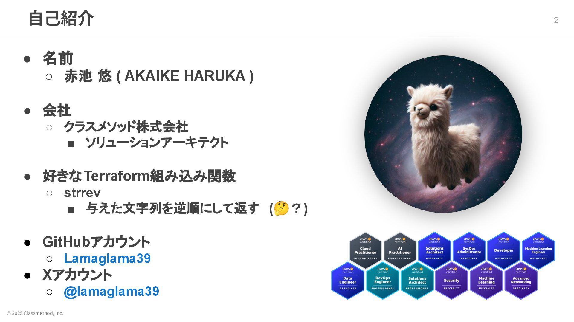 悠 ( AKAIKE HARUKA ) • 会社 ◦ クラスメソッド株式会社 ▪ ソリューションアーキテクト • 好きなTerraform組み込み関数 ◦ strrev ▪ 与えた文字列を逆順にして返す (🤔?) • GitHubアカウント ◦ Lamaglama39 • Xアカウント ◦ @lamaglama39