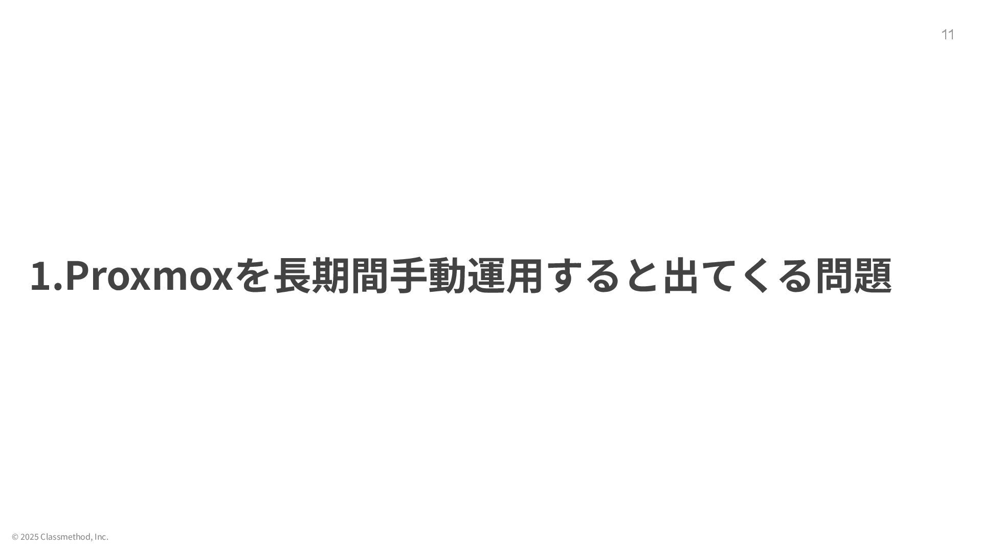 © 2025 Classmethod, Inc. 11 1.Proxmoxを⻑期間⼿動運⽤すると出てくる問題