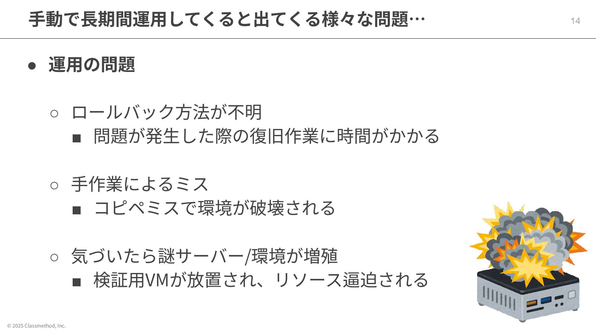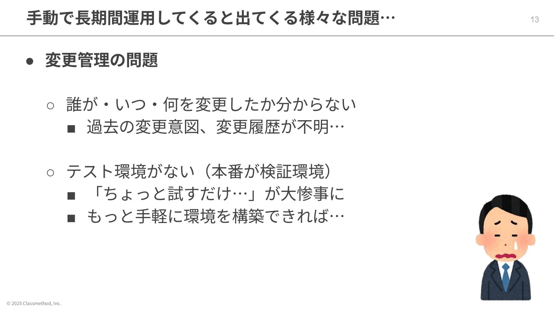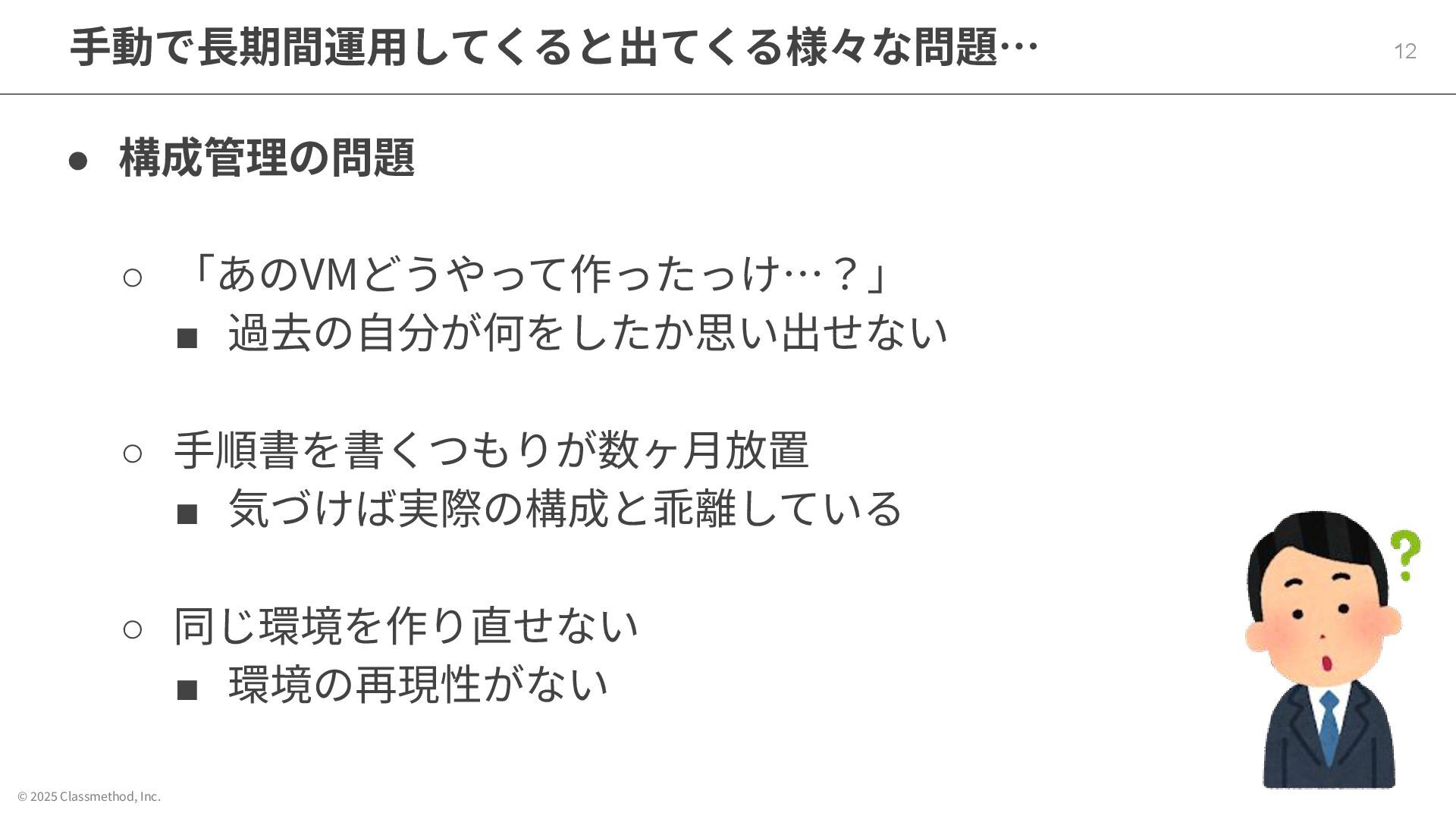 © 2025 Classmethod, Inc. ⼿動で⻑期間運⽤してくると出てくる様々な問題… 12 • 構成管理の問題 ◦ 「あのVMどうやって作ったっけ…?」
