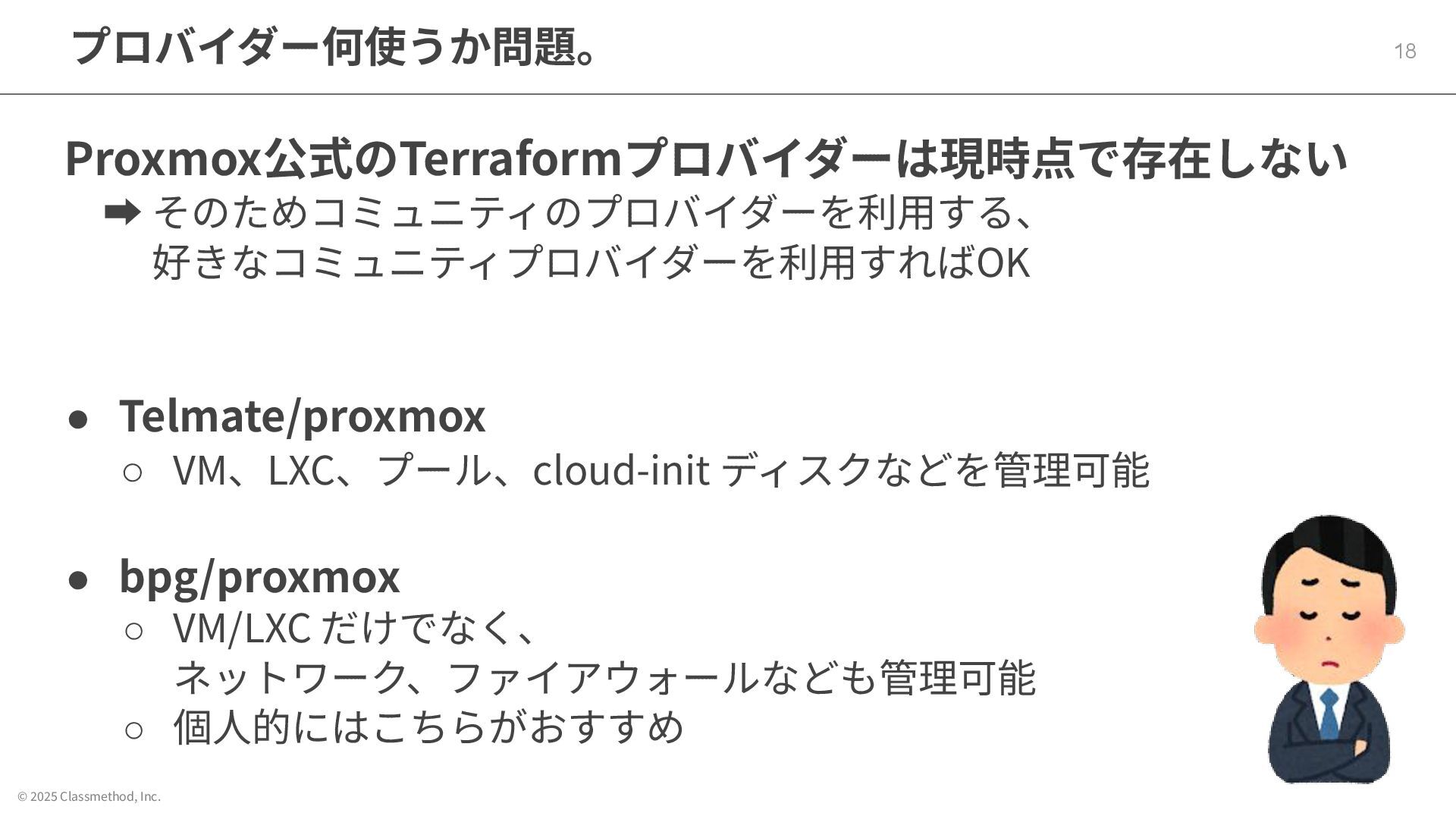 © 2025 Classmethod, Inc. プロバイダー何使うか問題。 18 Proxmox公式のTerraformプロバイダーは現時点で存在しない ➡ そのためコミュニティのプロバイダーを利⽤する、