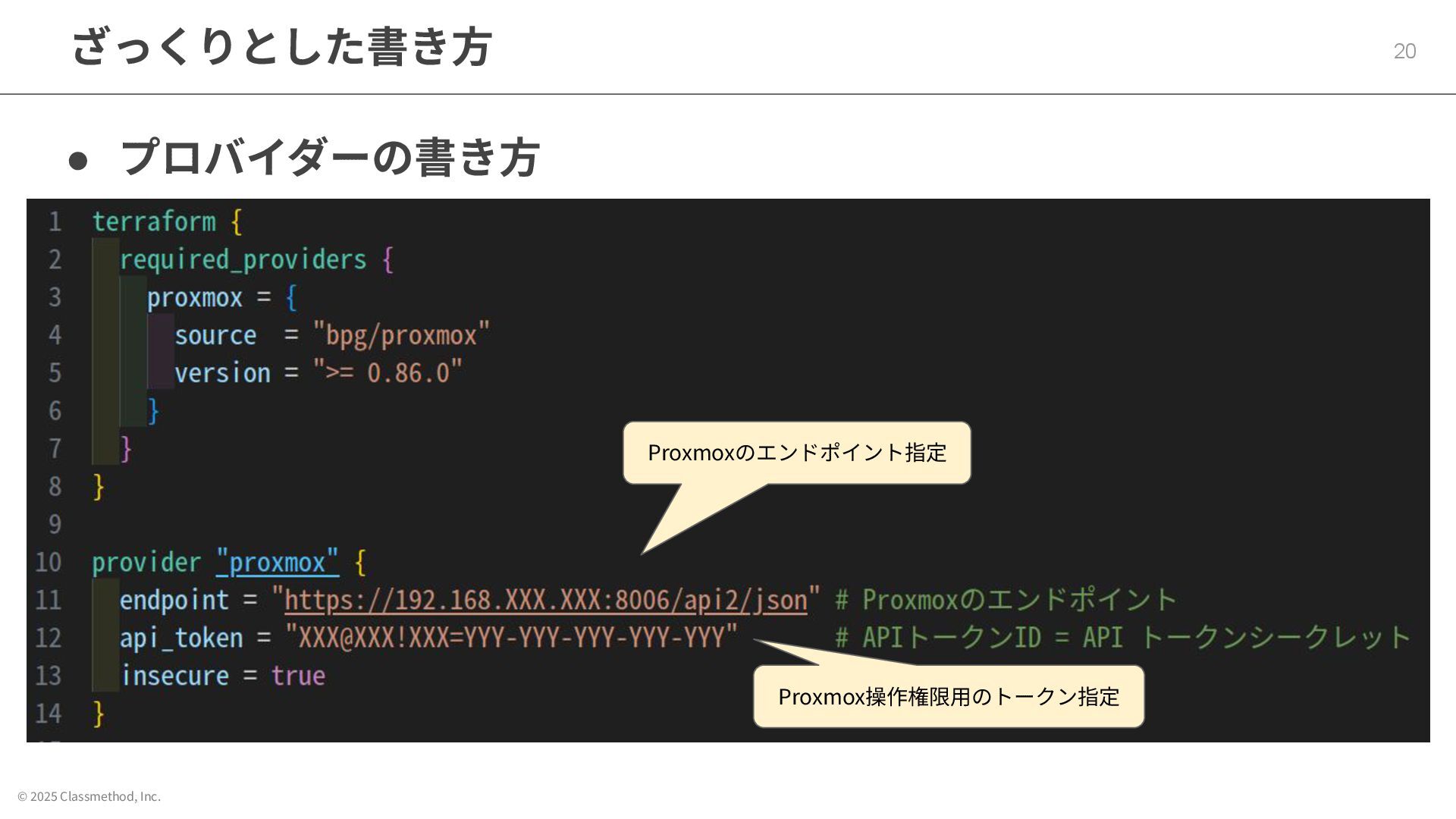 © 2025 Classmethod, Inc. ざっくりとした書き⽅ 20 Proxmoxのエンドポイント指定 Proxmox操作権限⽤のトークン指定 • プロバイダーの書き⽅