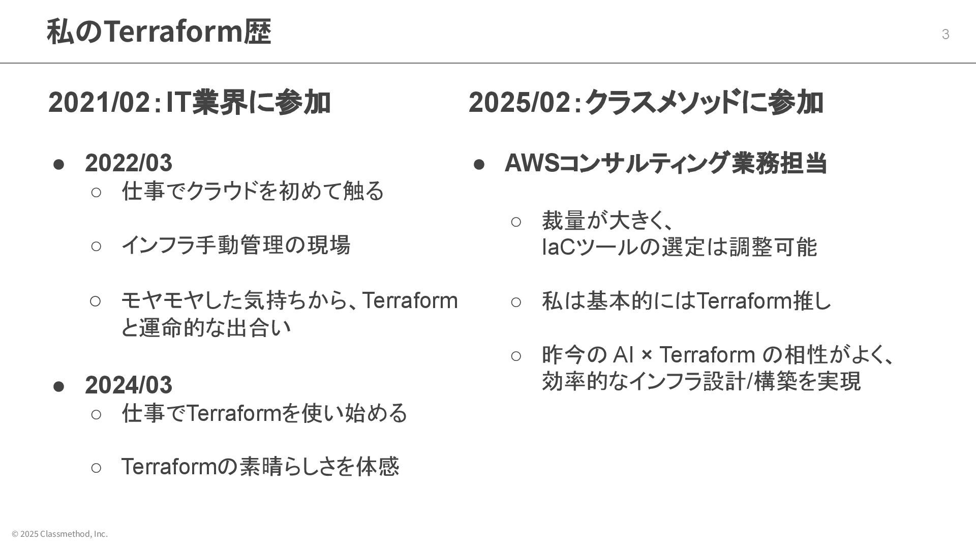 裁量が大きく、 IaCツールの選定は調整可能 ◦ 私は基本的にはTerraform推し ◦ 昨今の AI × Terraform の相性がよく、 効率的なインフラ設計/構築を実現 2021/02:IT業界に参加 • 2022/03 ◦ 仕事でクラウドを初めて触る ◦ インフラ手動管理の現場 ◦ モヤモヤした気持ちから、Terraform と運命的な出合い • 2024/03 ◦ 仕事でTerraformを使い始める ◦ Terraformの素晴らしさを体感