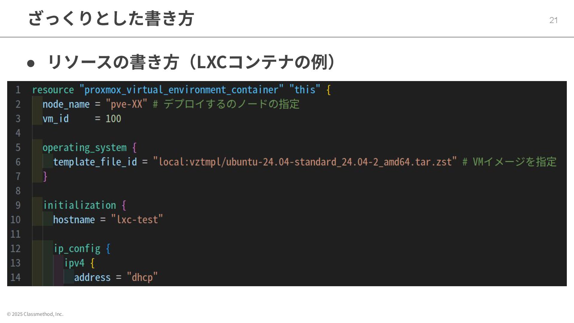 © 2025 Classmethod, Inc. ざっくりとした書き⽅ 21 • リソースの書き⽅(LXCコンテナの例)
