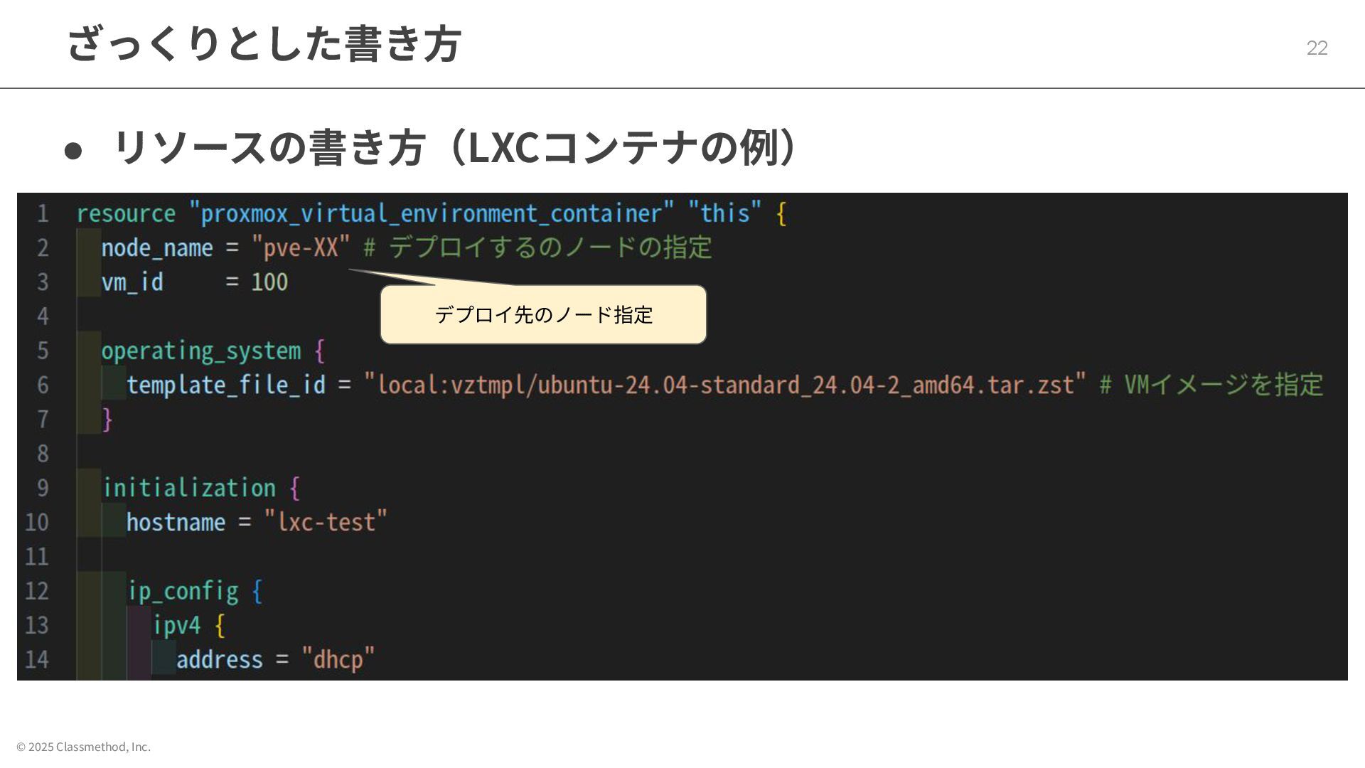 © 2025 Classmethod, Inc. ざっくりとした書き⽅ 22 デプロイ先のノード指定 • リソースの書き⽅(LXCコンテナの例)